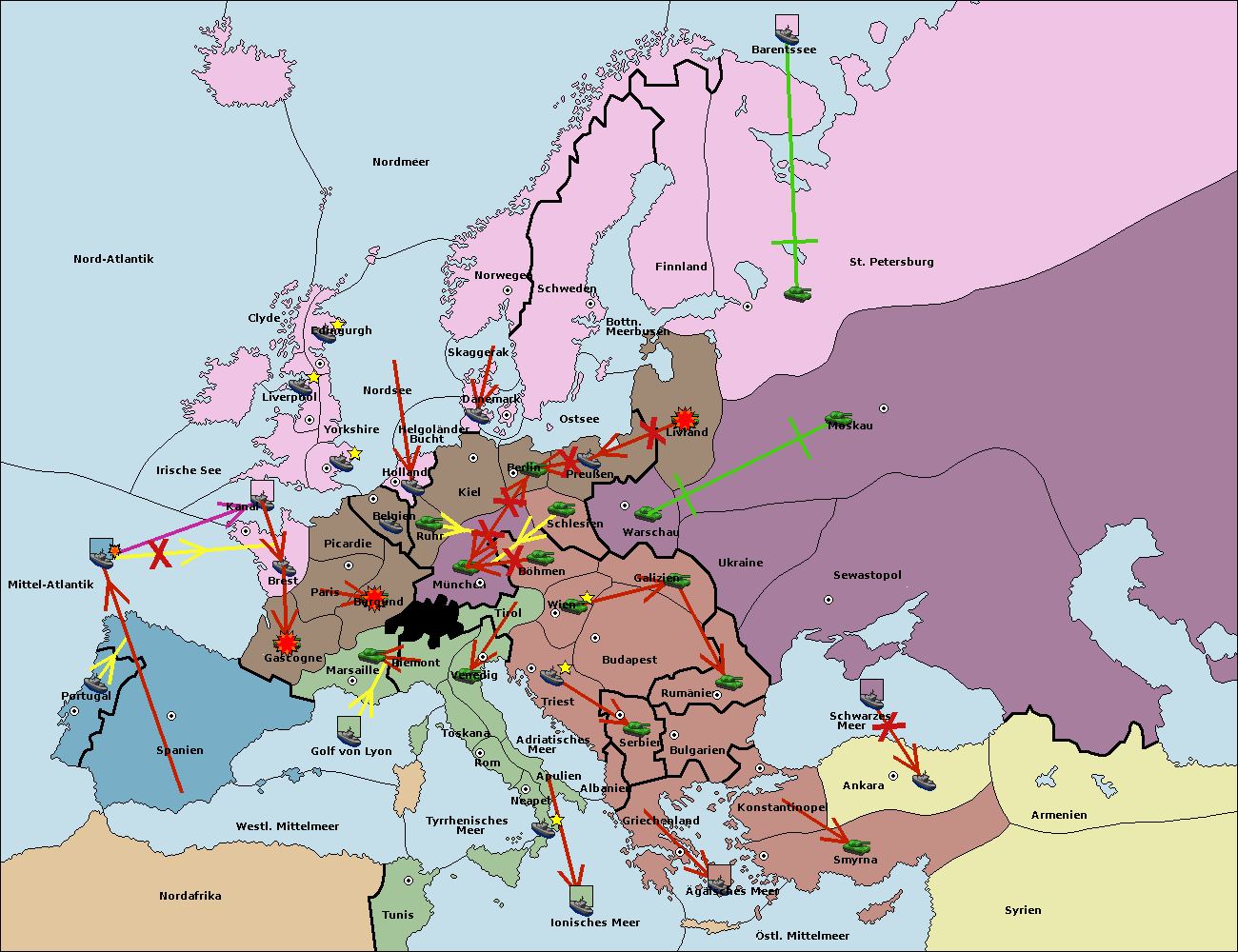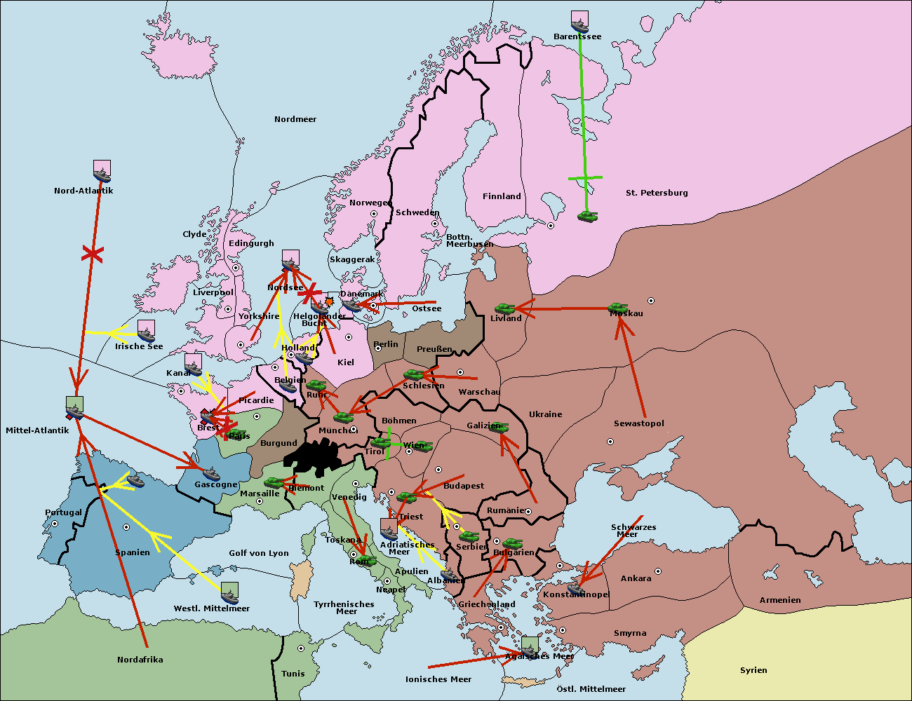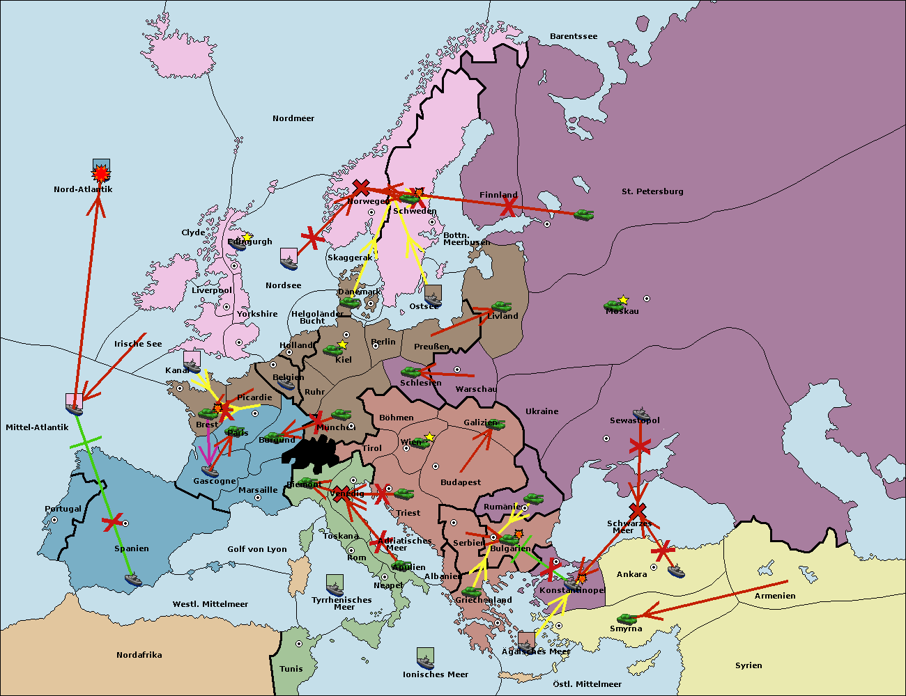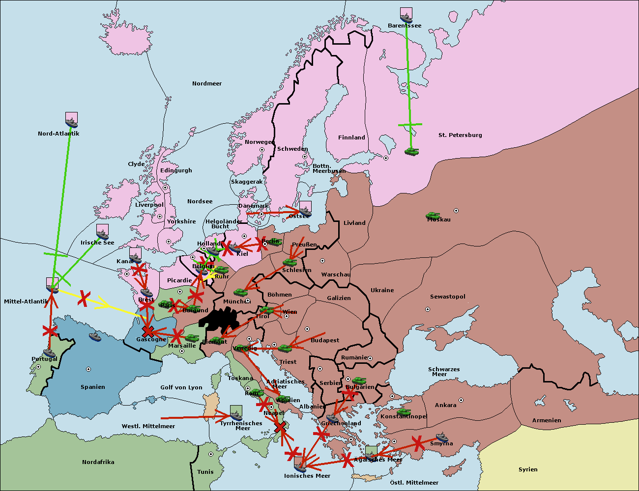 • Die Flotte in Spanien (Nordküste) support move nach Mittel-Atlantik von westl. Mittelmeer. (gescheitert)