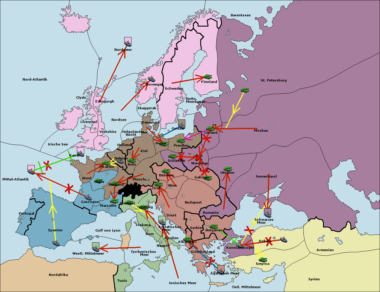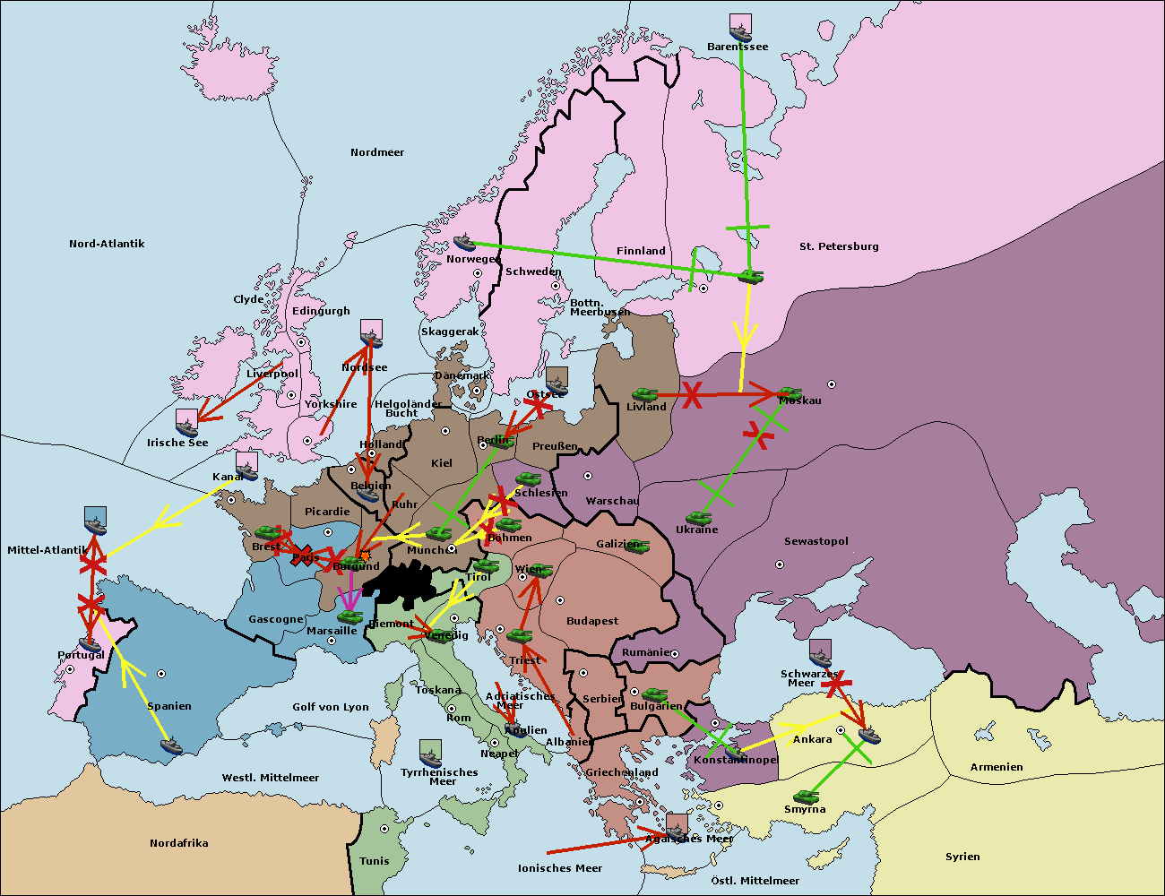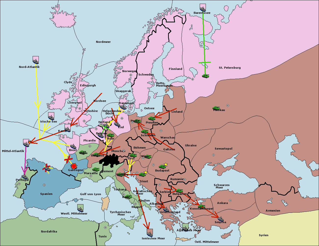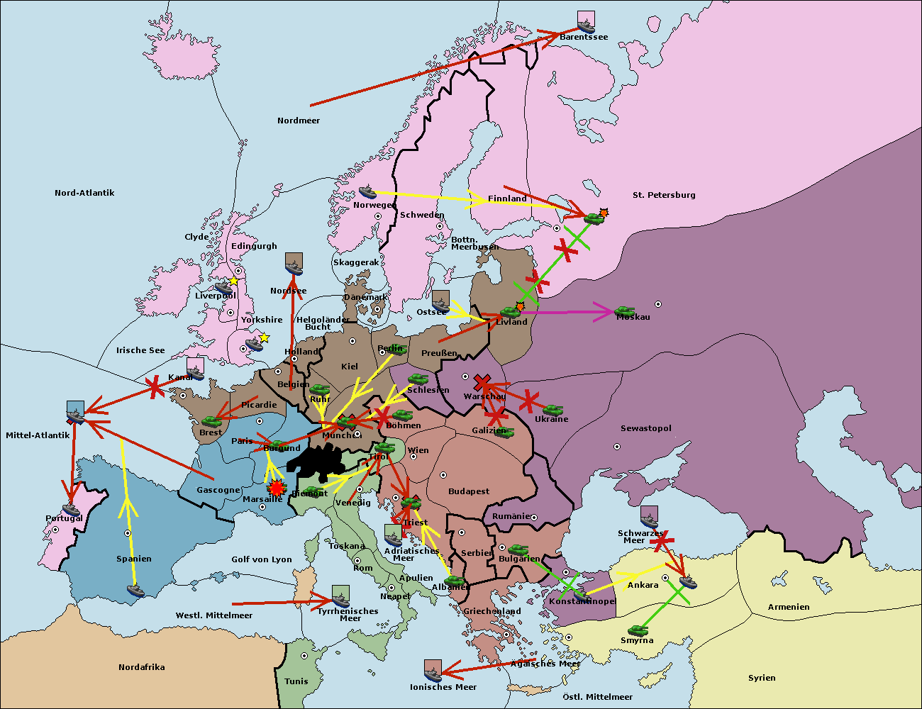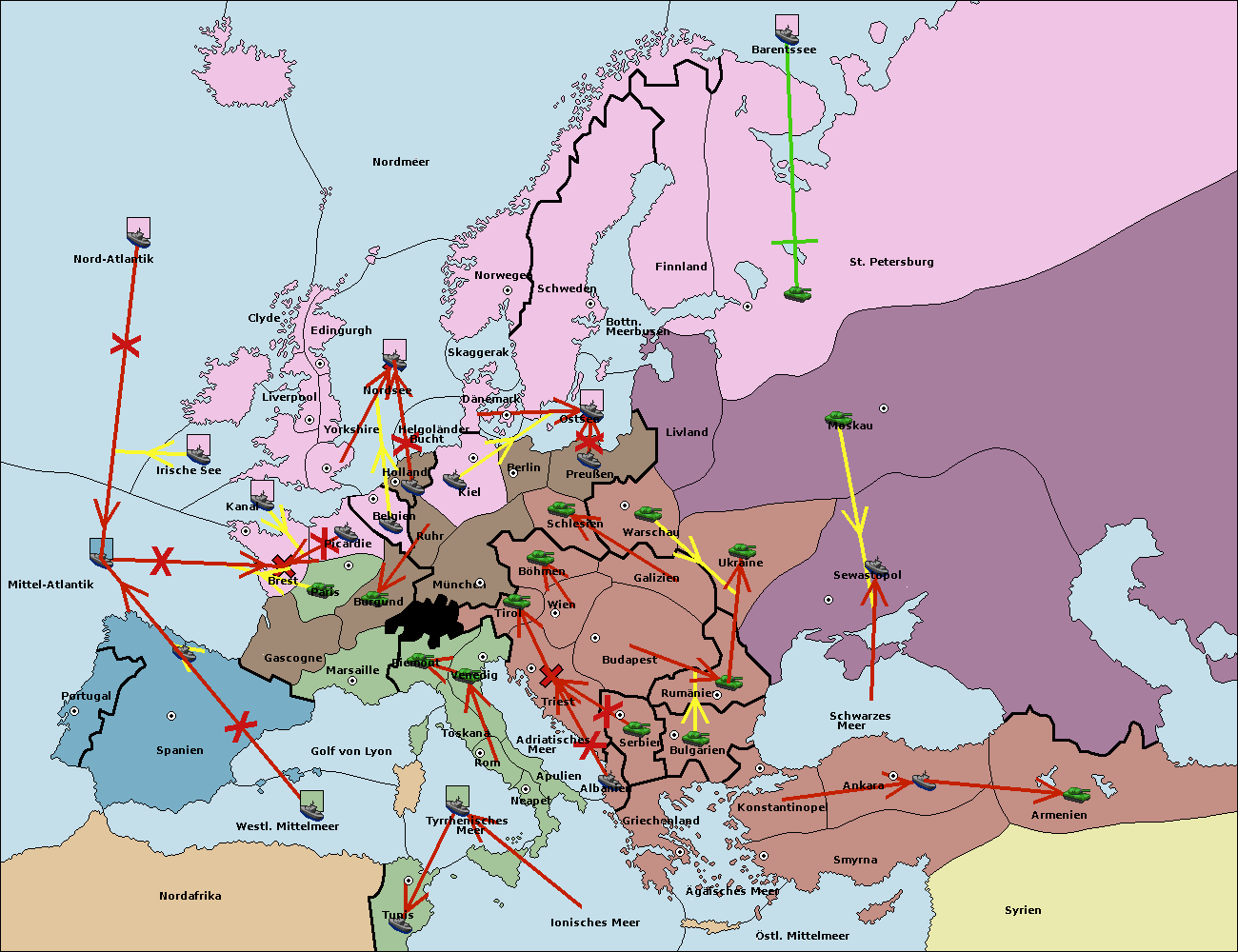 • Die Flotte in Spanien (Nordküste) support move nach Mittel-Atlantik von westl. Mittelmeer. (gescheitert)