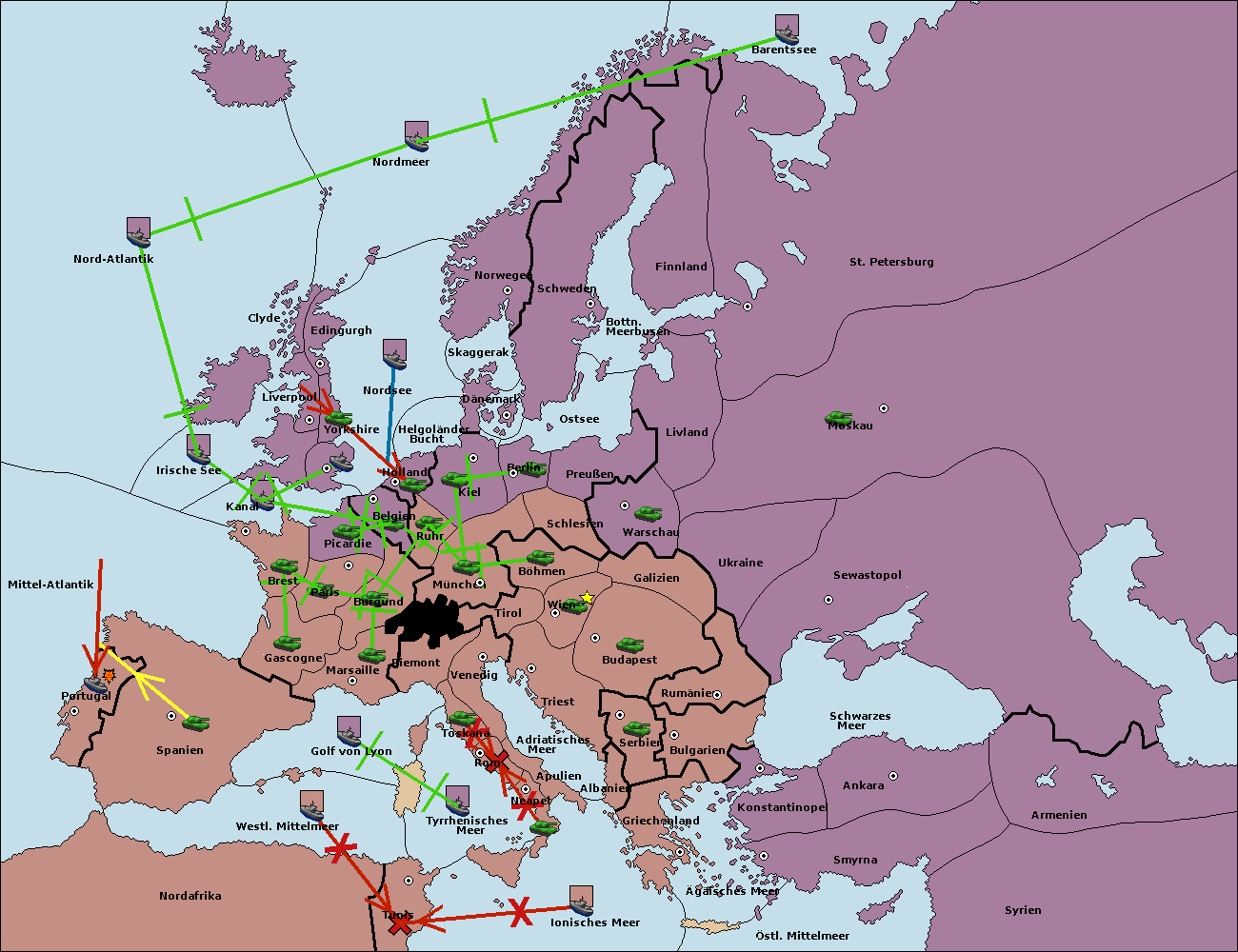 • Die Flotte in Nord-Atlantik support move nach Mittel-Atlantik von westl. Mittelmeer. (gescheitert)