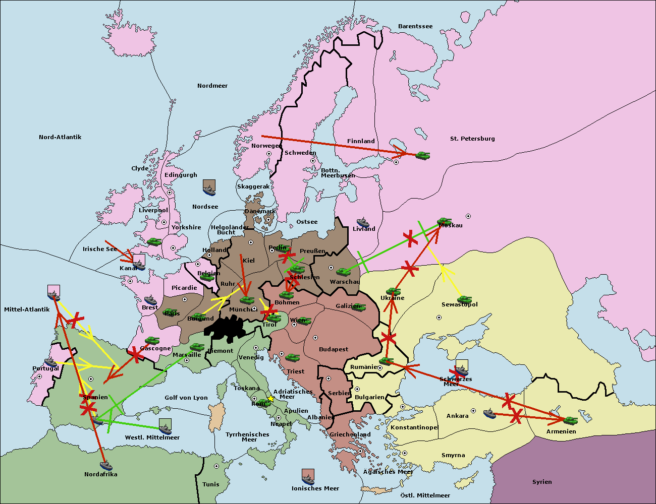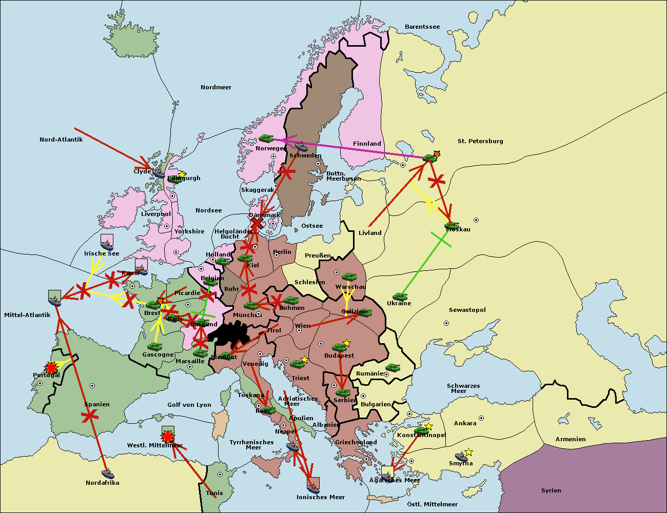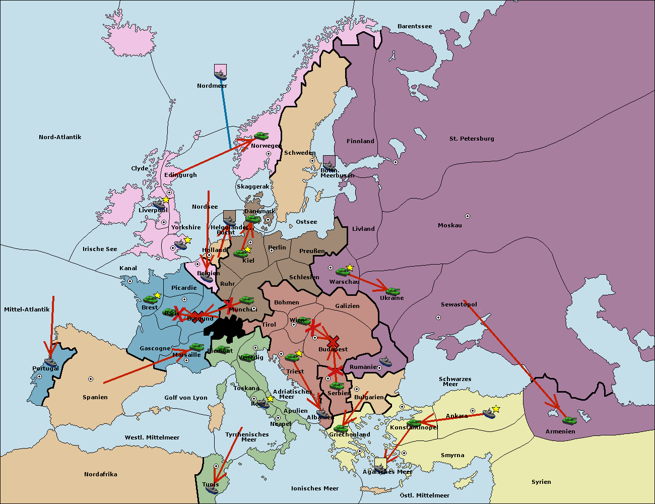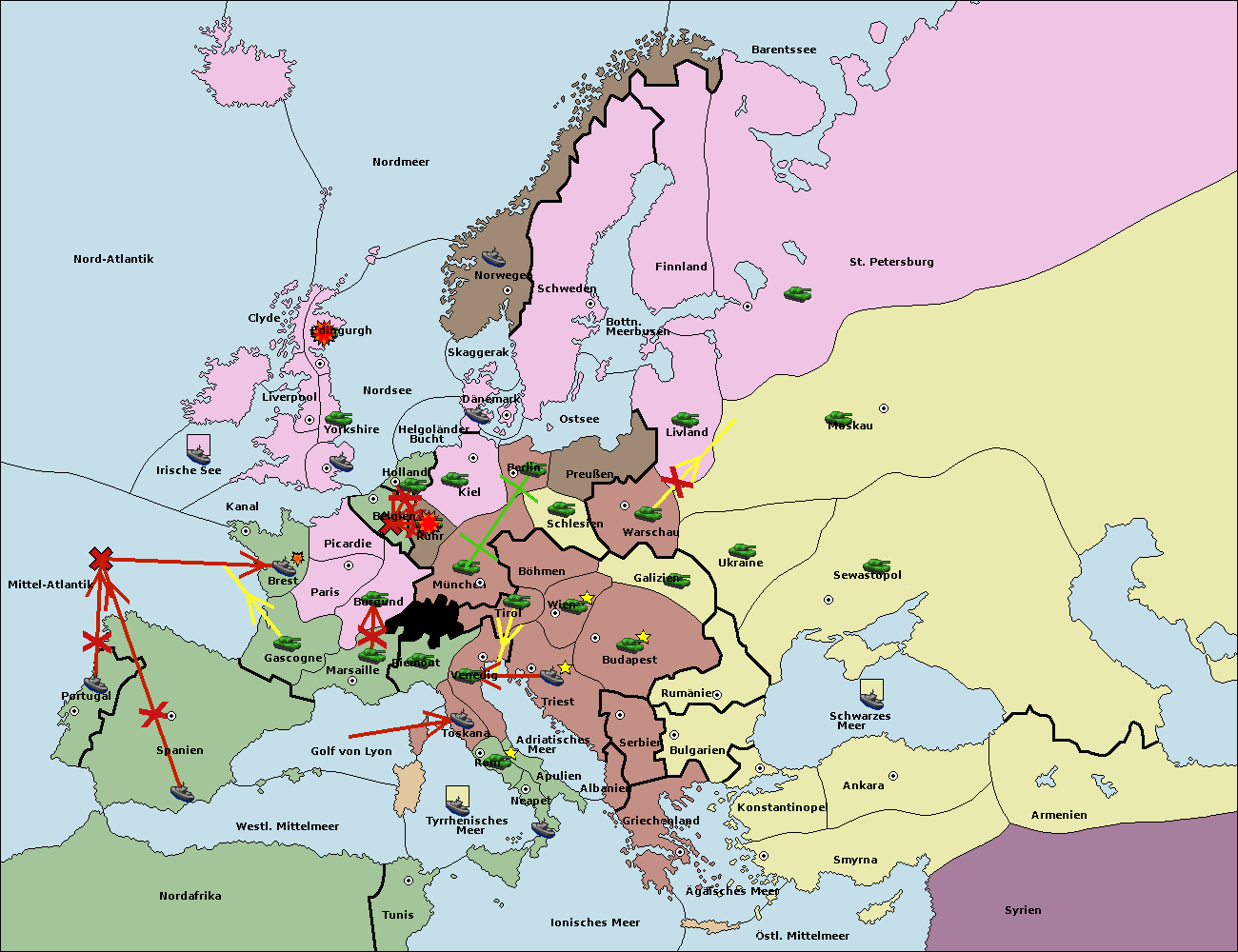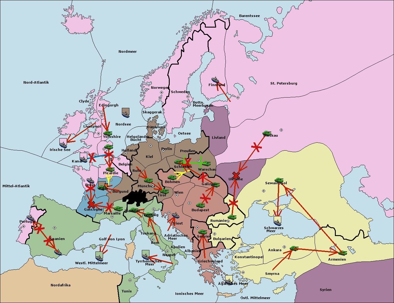 • Die Flotte in Spanien (Südküste) support move nach westl. Mittelmeer von Nord Afrika.