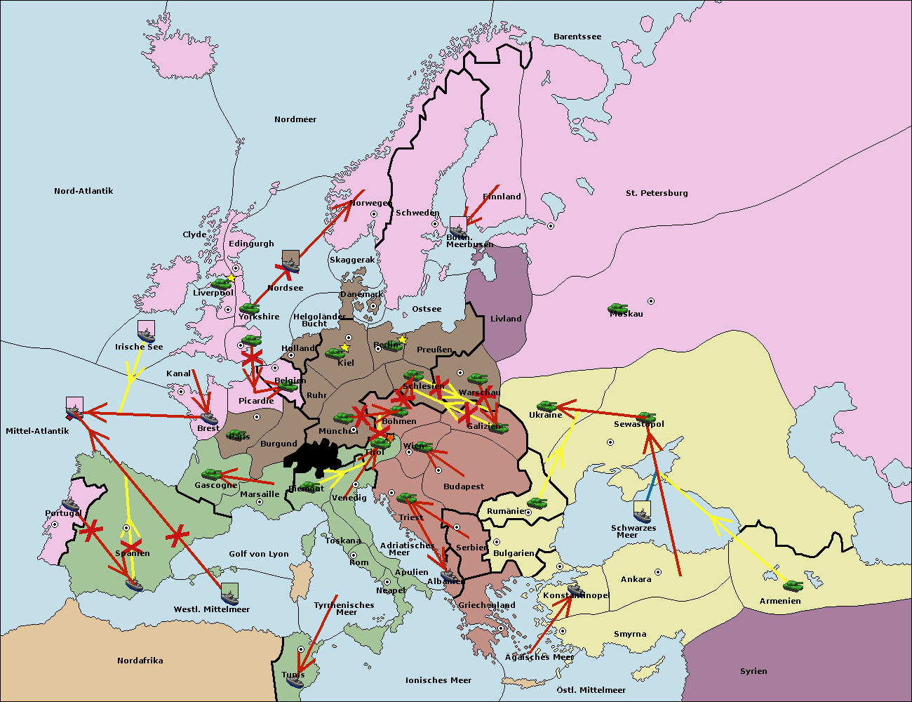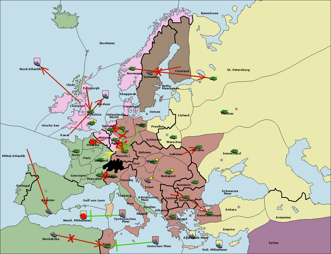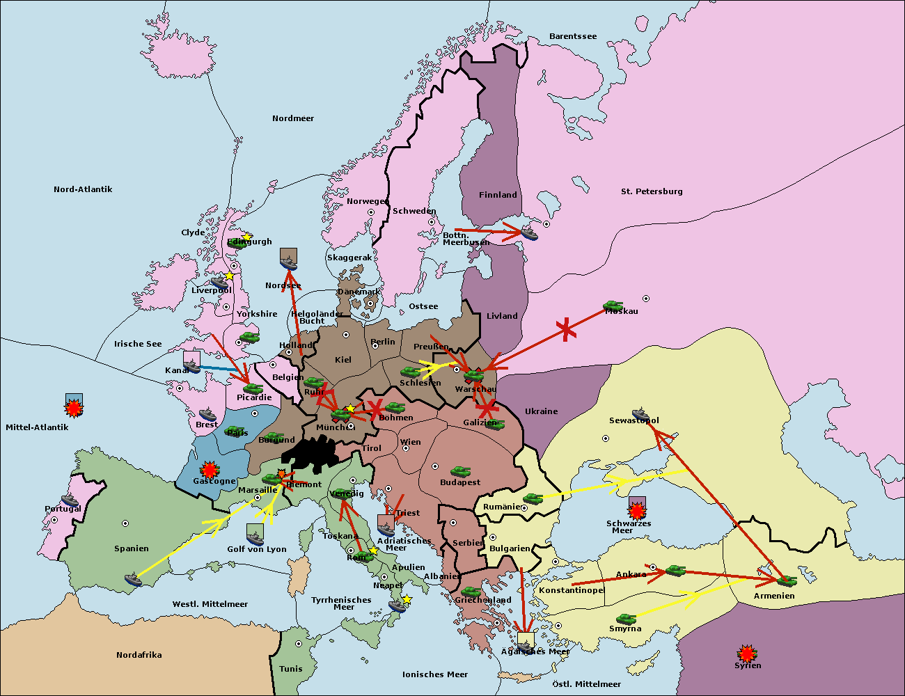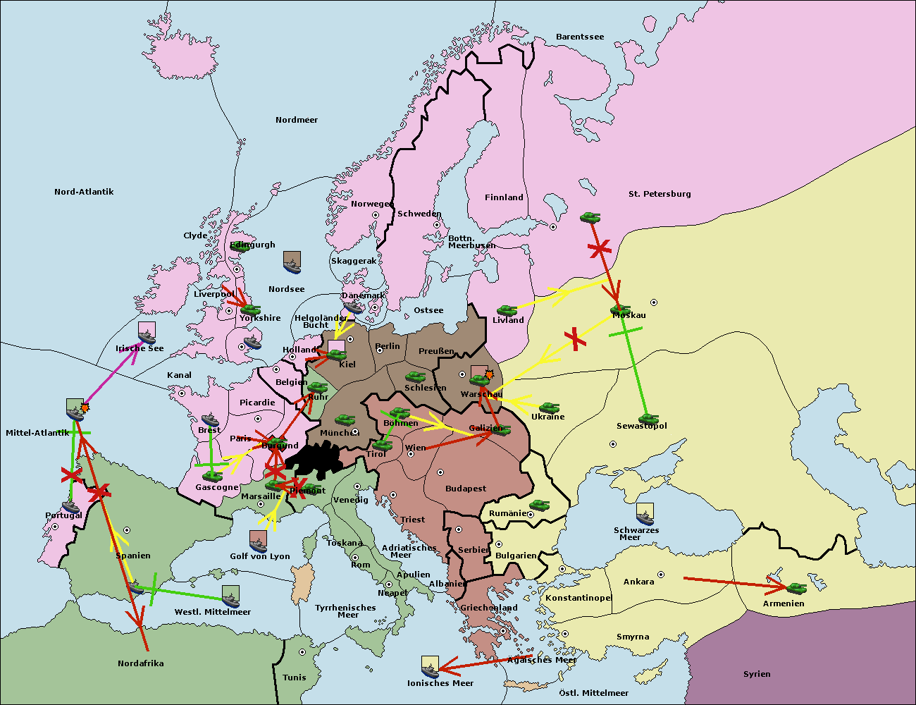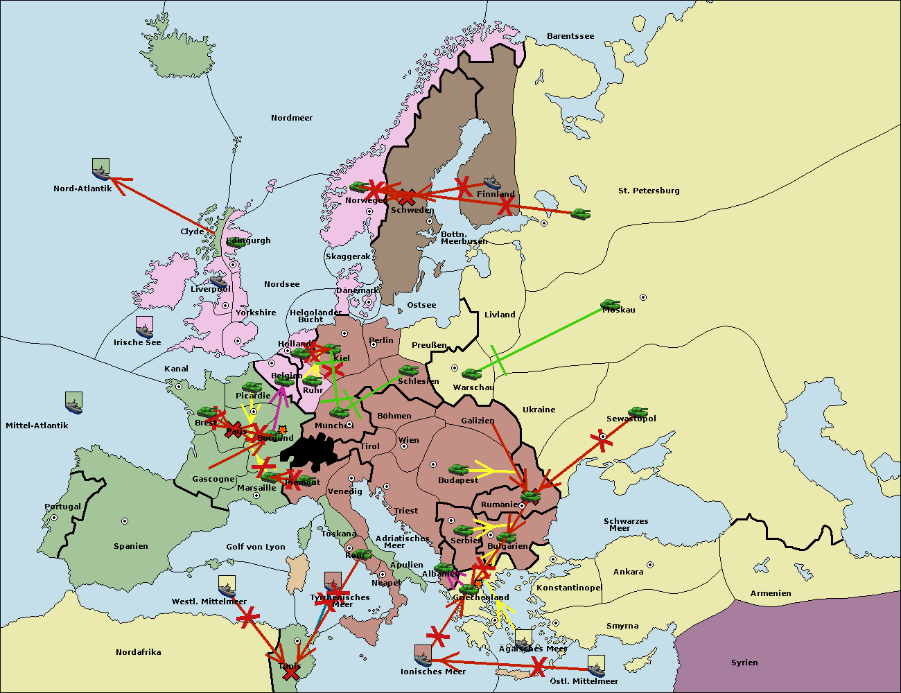 • Die Flotte in Spanien (Südküste) support move nach westl. Mittelmeer von Nord Afrika.
