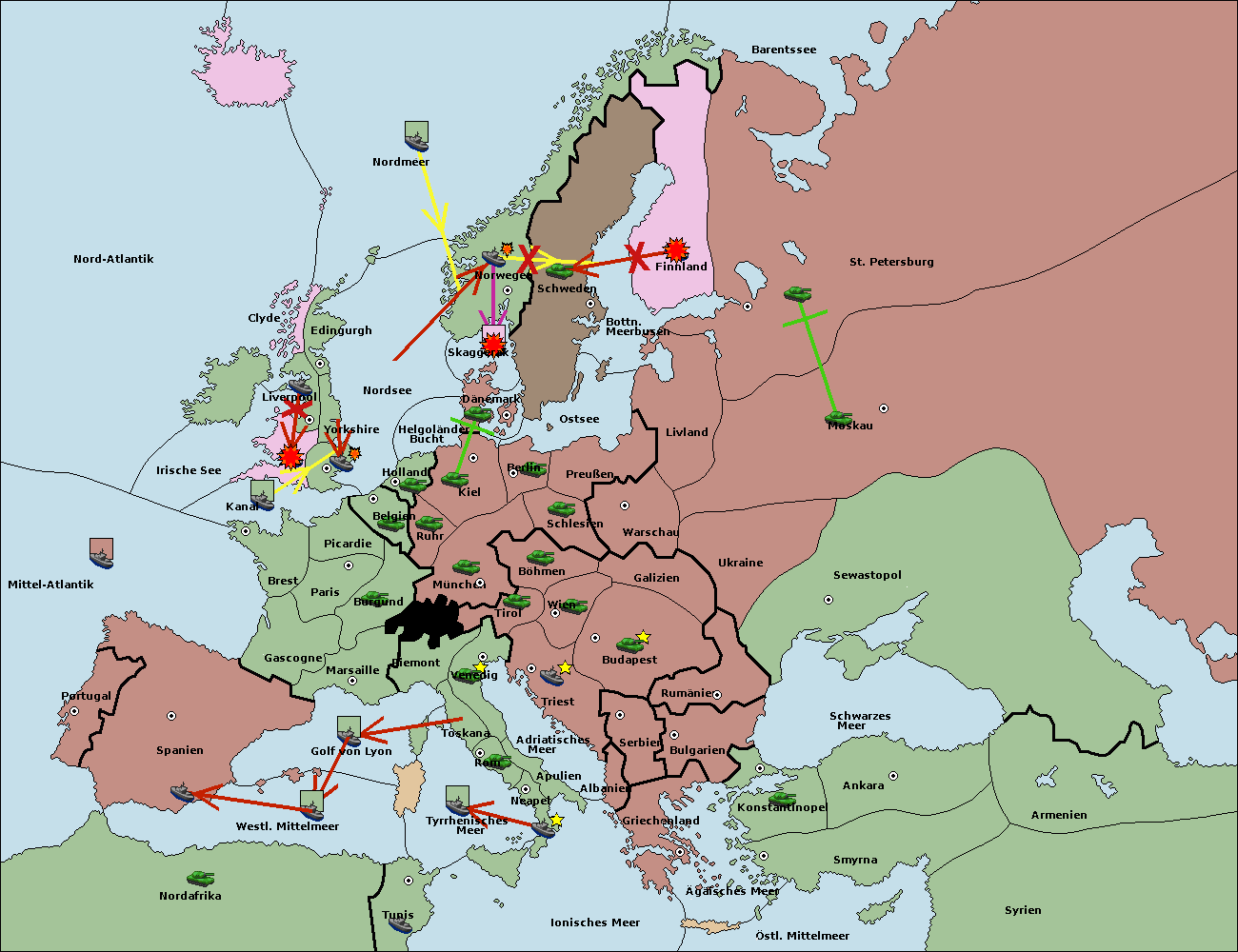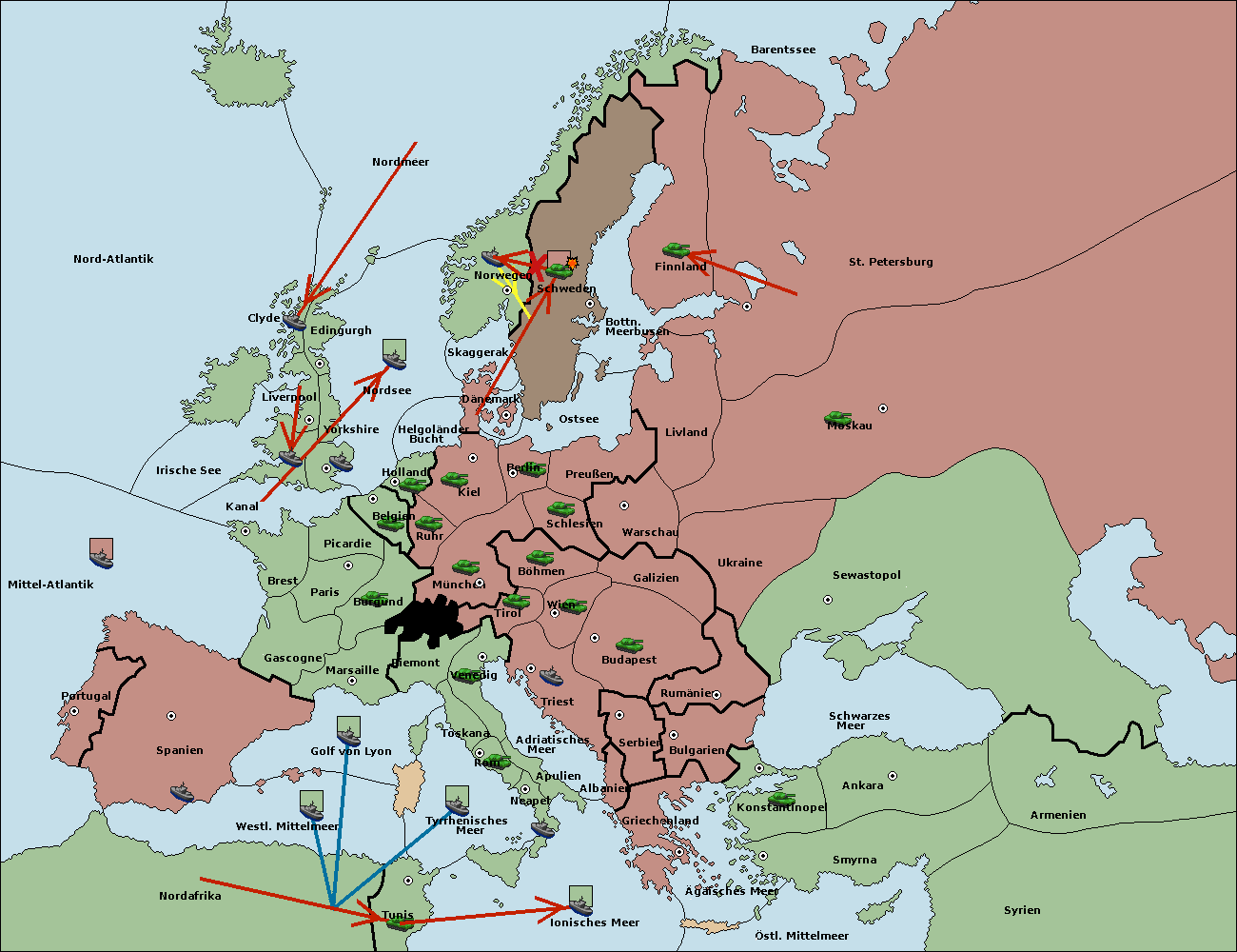 • Die Flotte in St. Petersburg (Nordküste) zieht sich nach Norwegen zurück.