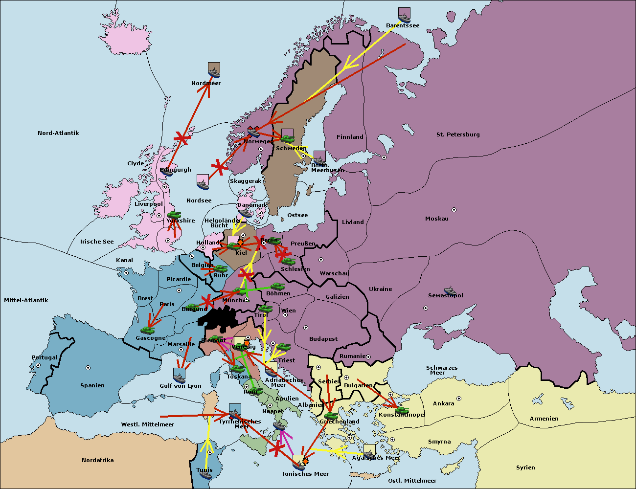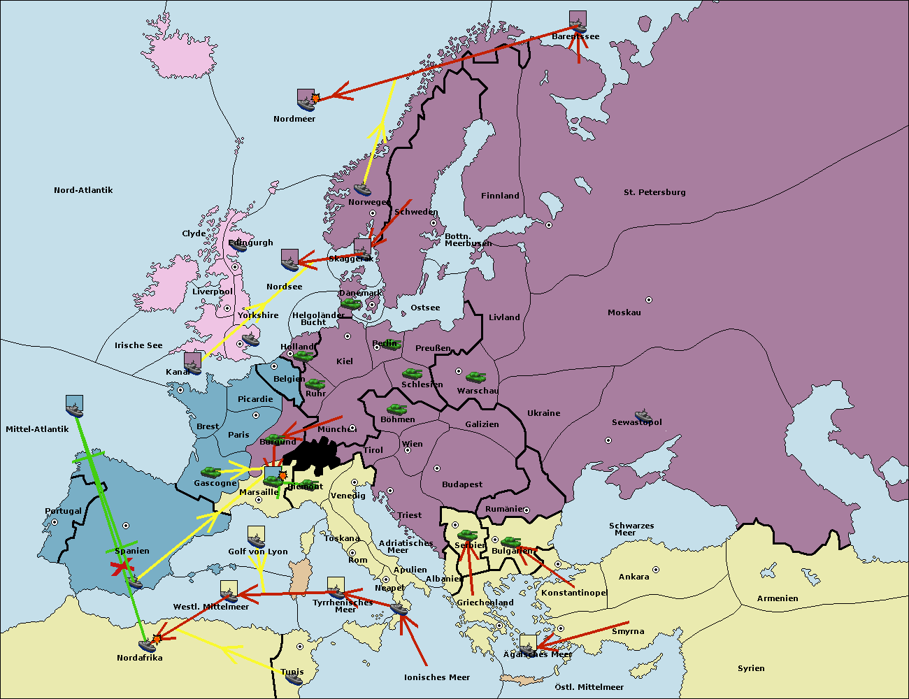 • Die Flotte in Spanien (Südküste) zieht sich nach Marseille zurück.