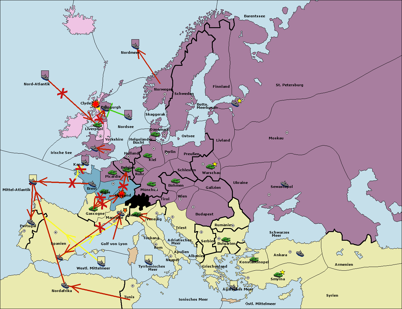 • Die Flotte in Spanien (Südküste) support move nach Mittel-Atlantik von Brest. (gescheitert) (verdrängt)