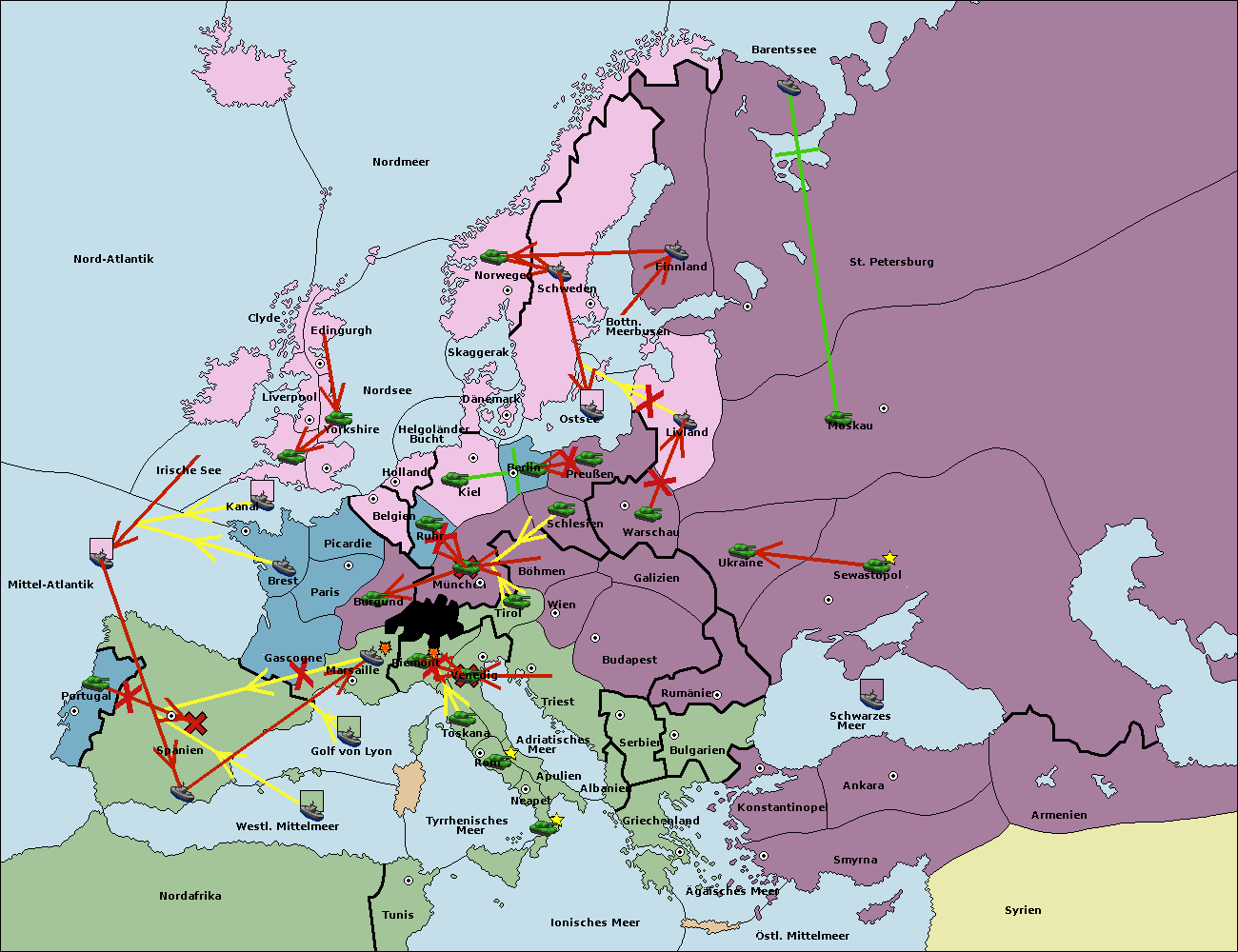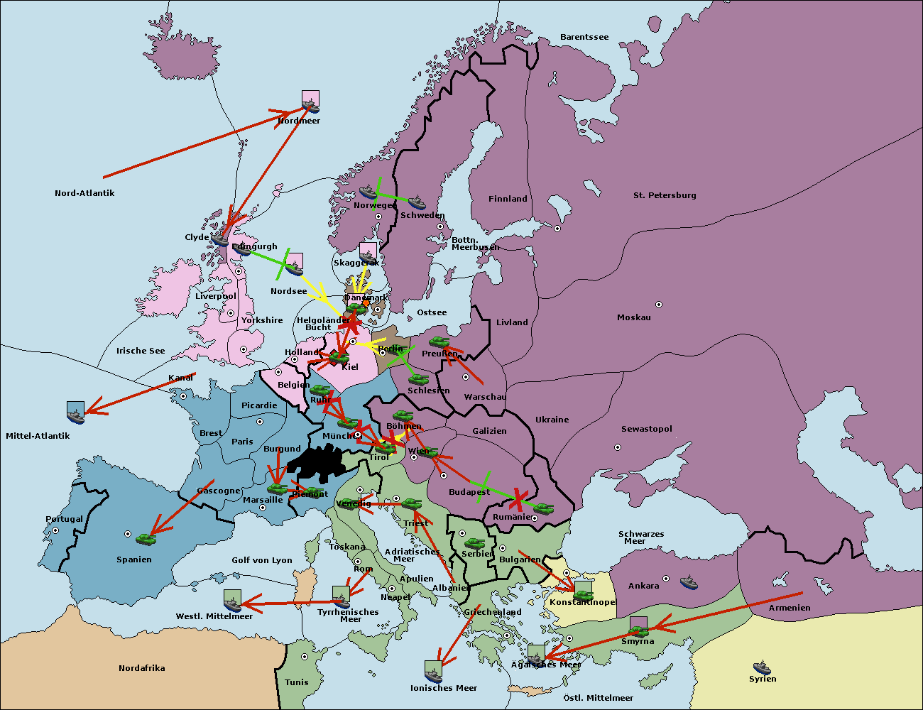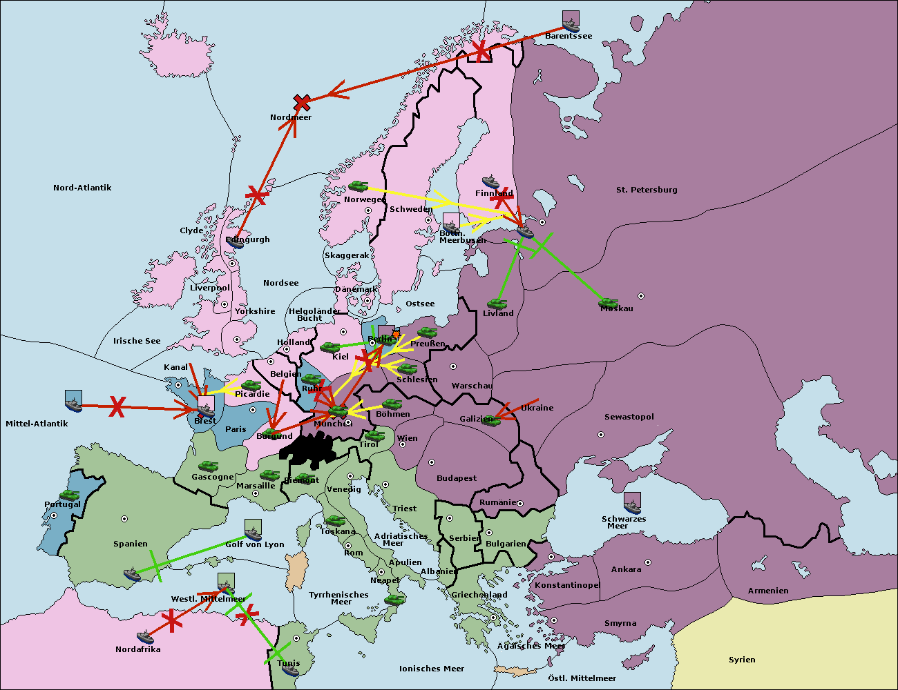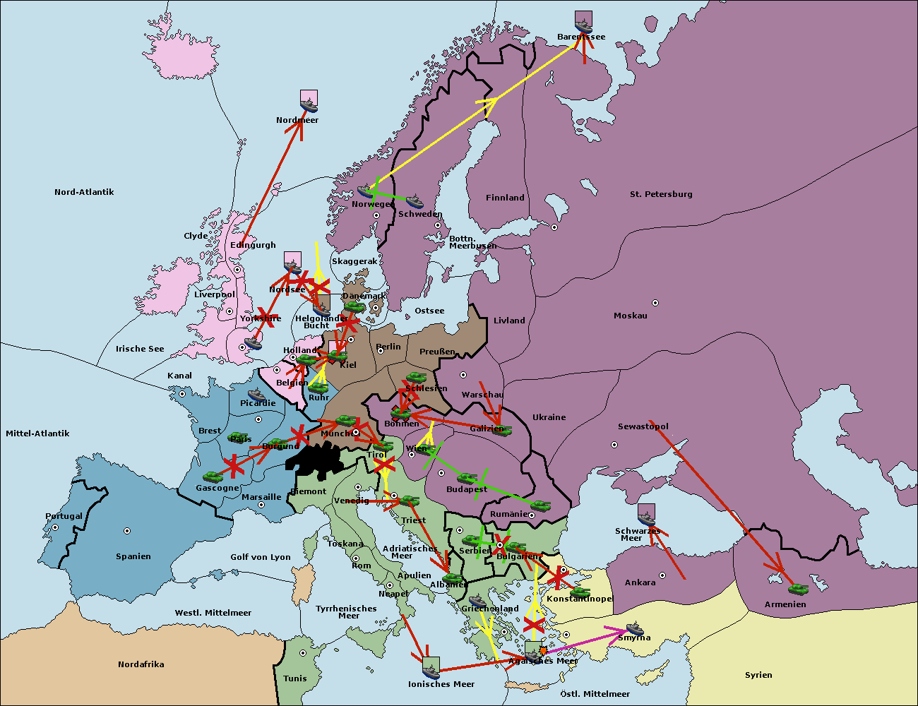 • Die Armee in Kiel support move nach München von Burgund. (gescheitert) (verdrängt)