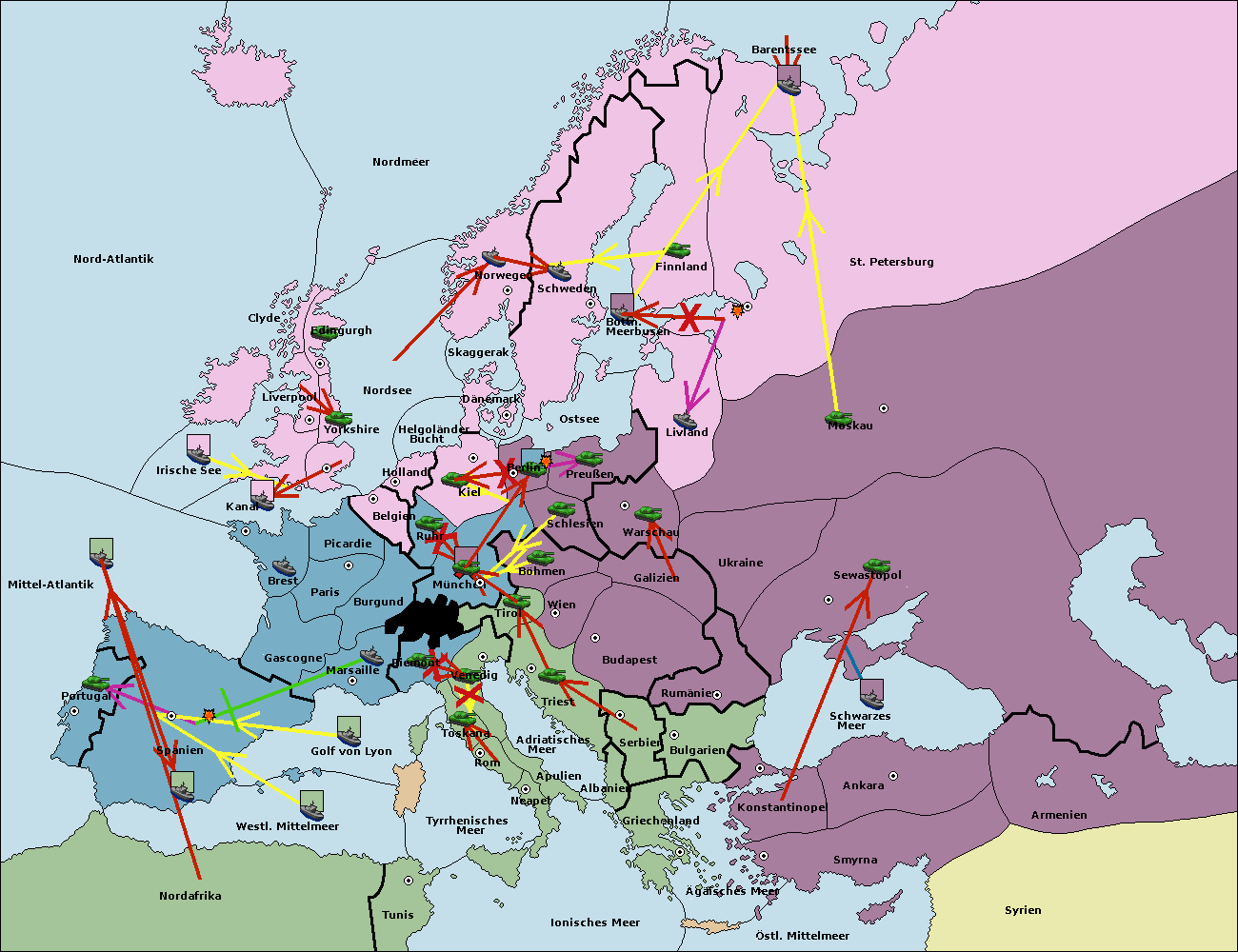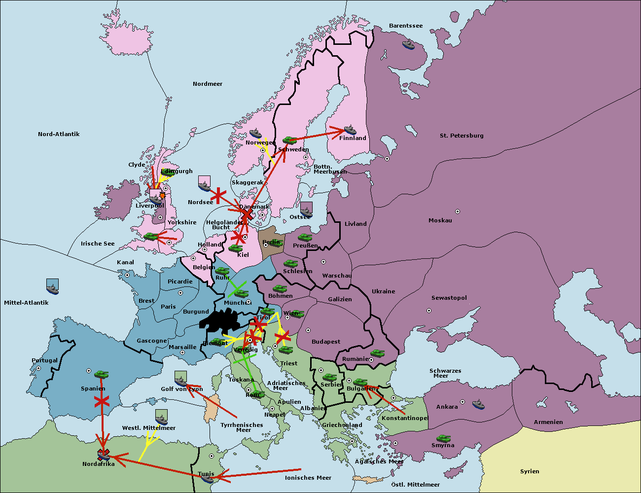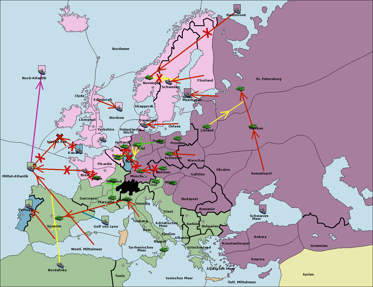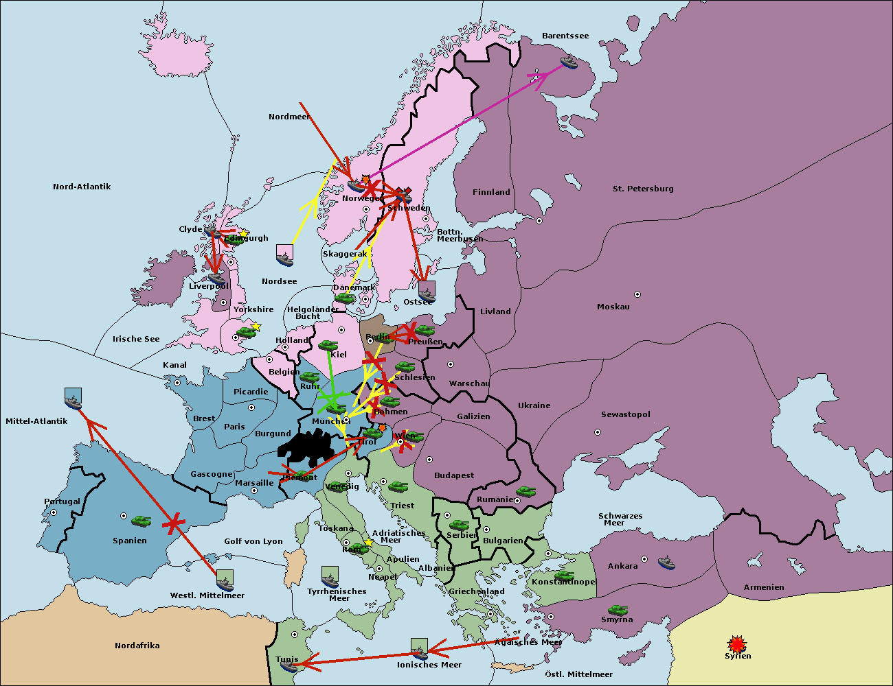• Die Armee in Kiel support move nach München von Burgund. (gescheitert) (verdrängt)