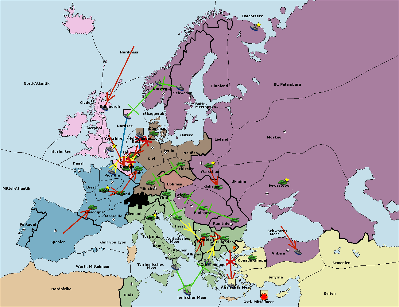 • Die Flotte in Bulgarien (Südküste) support hold nach Griechenland. (gescheitert)