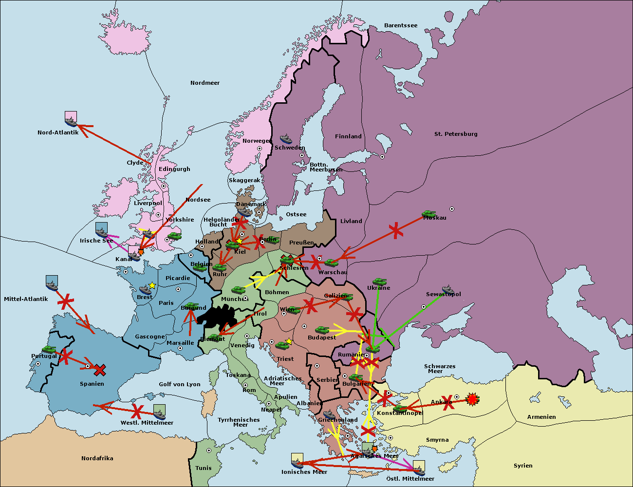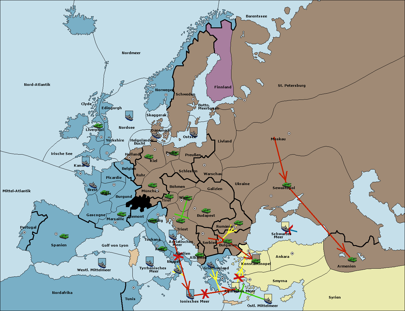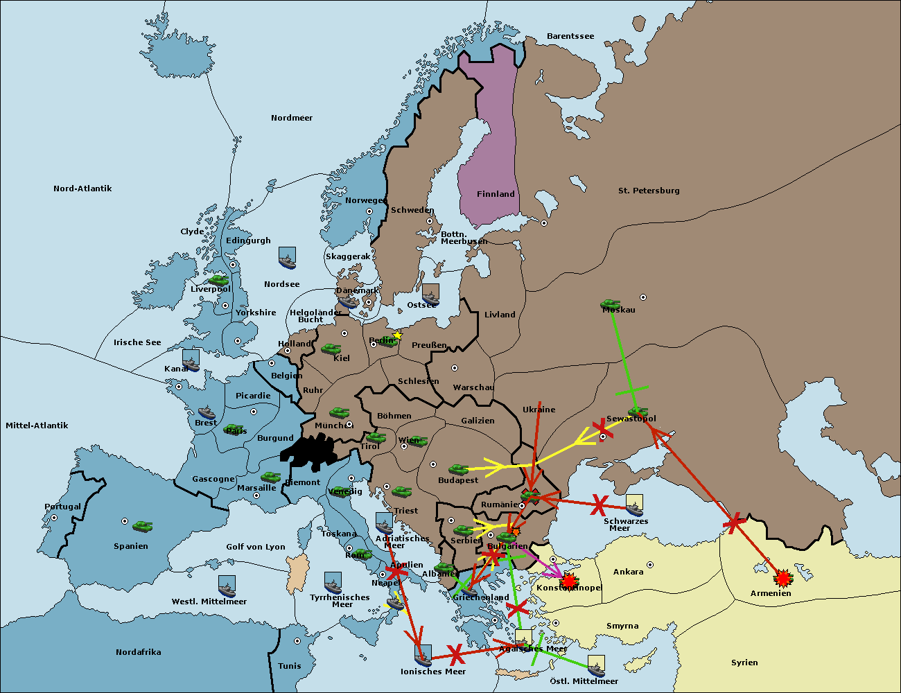 • Die Armee in Bulgarien support move nach Konstantinopel von Ägäisches Meer. (gescheitert)