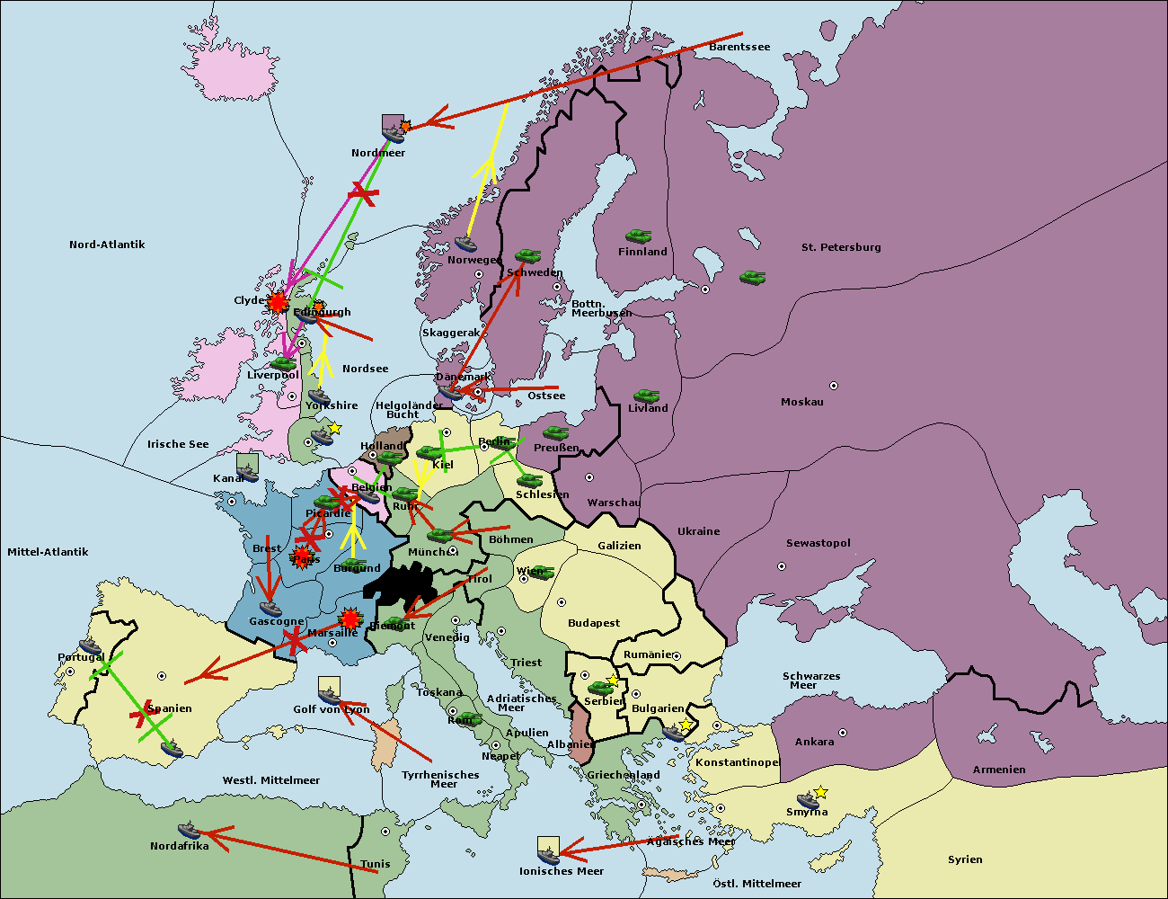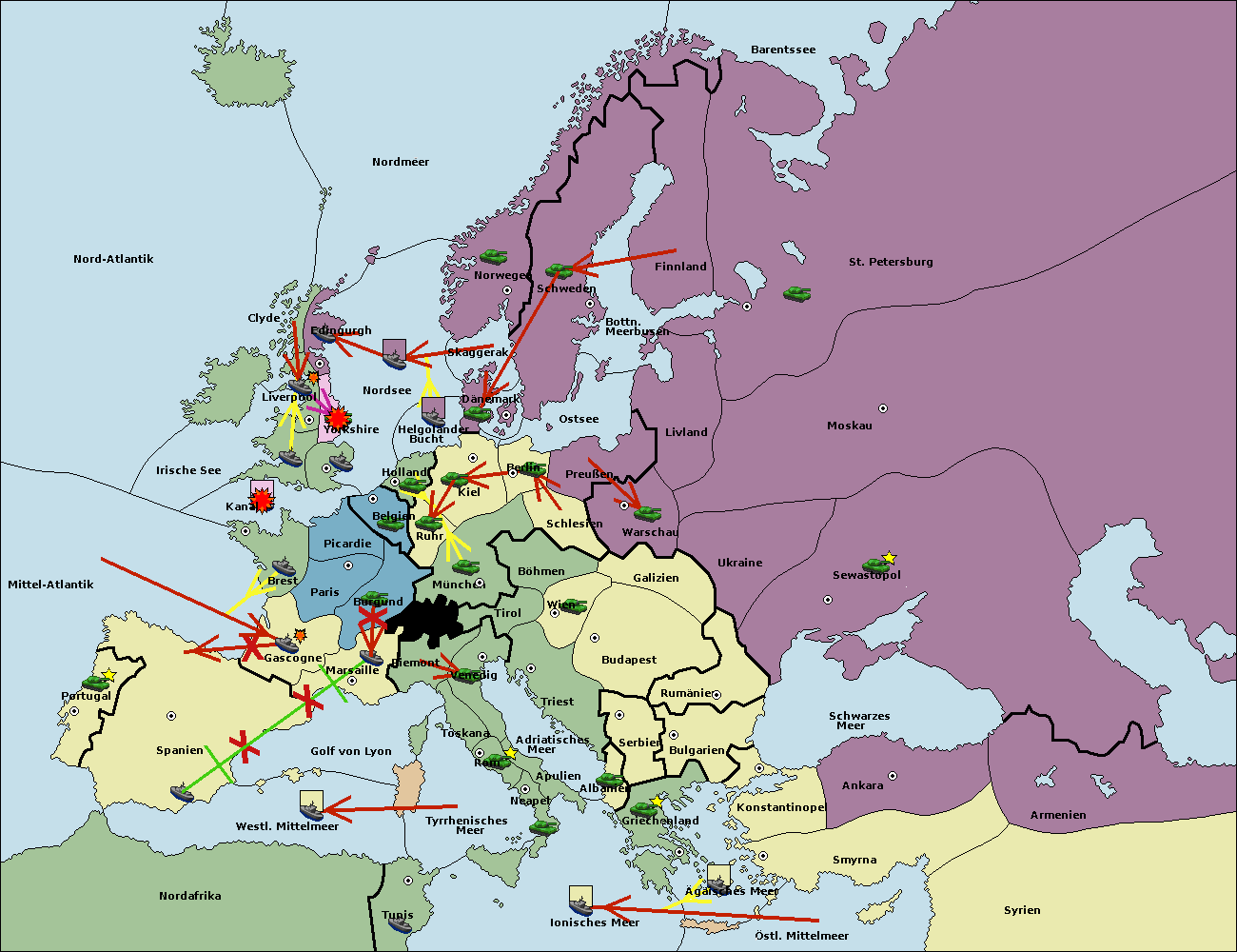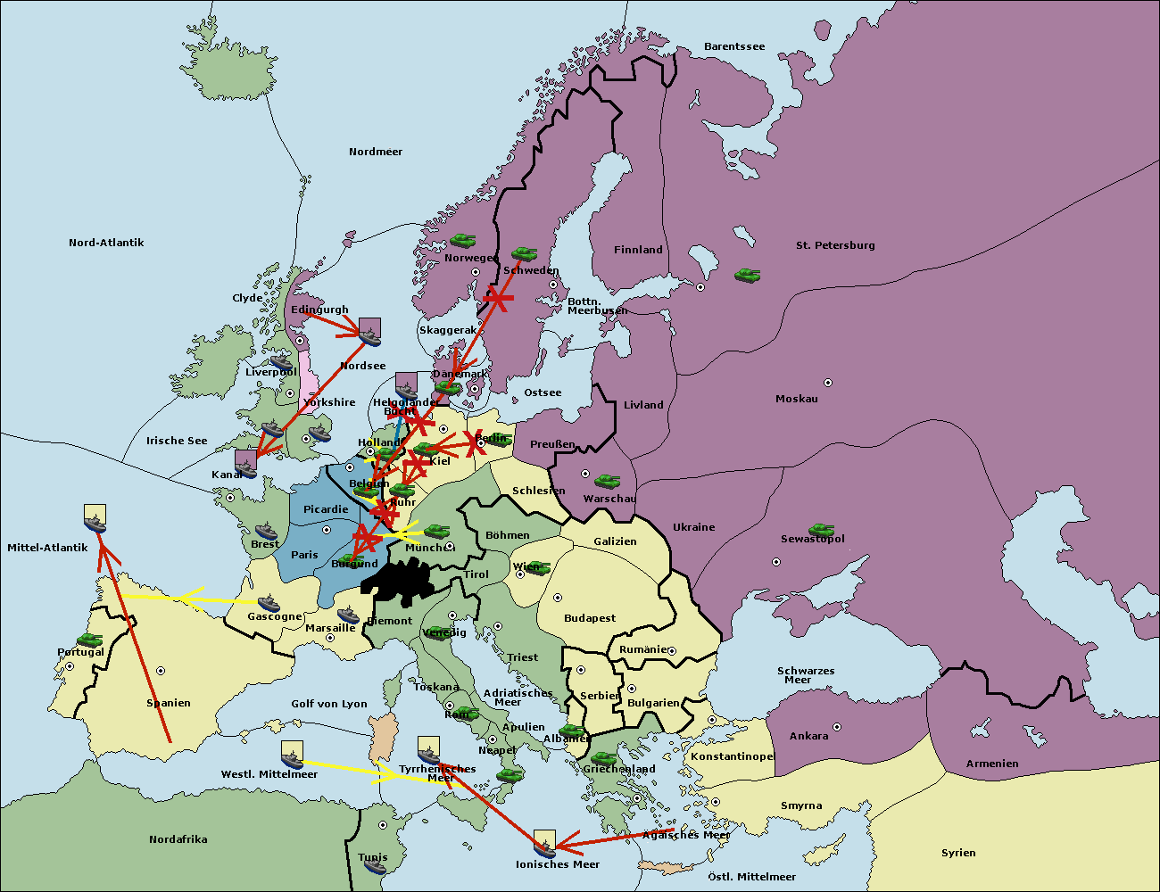 • Die Armee in Belgien wird zerstörtFlotte in Belgien gebaut.