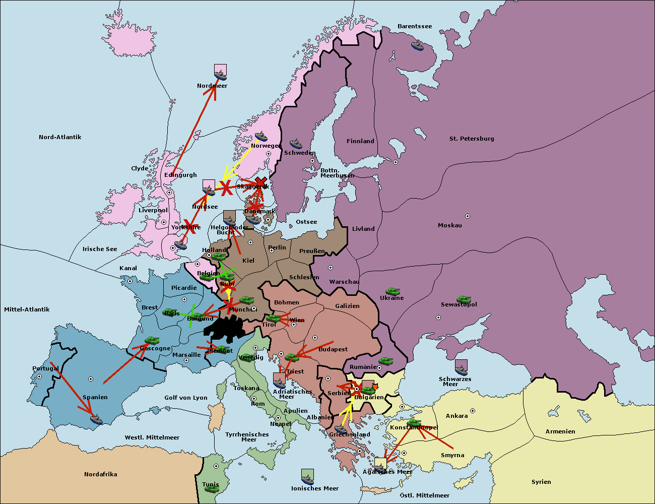 • Die Flotte in Bulgarien (Südküste) support hold nach Konstantinopel. (gescheitert)