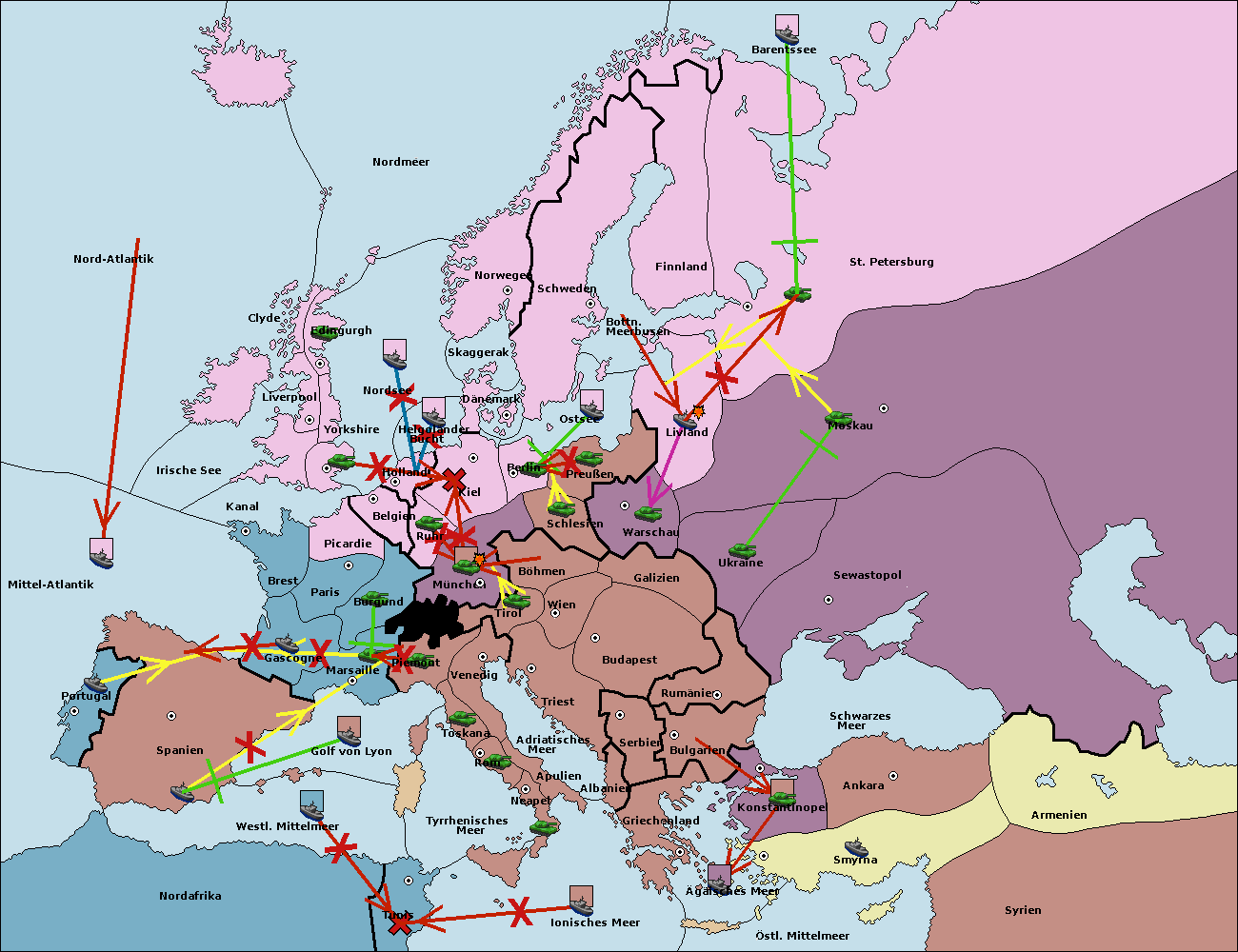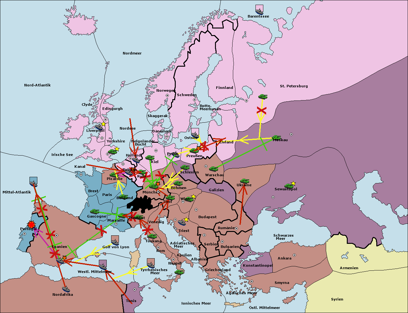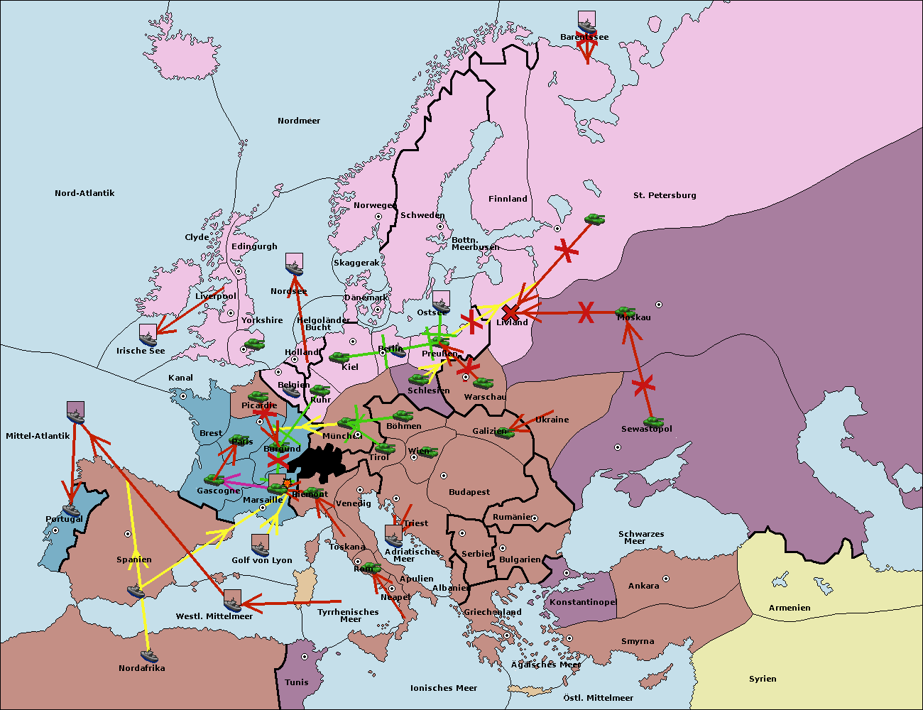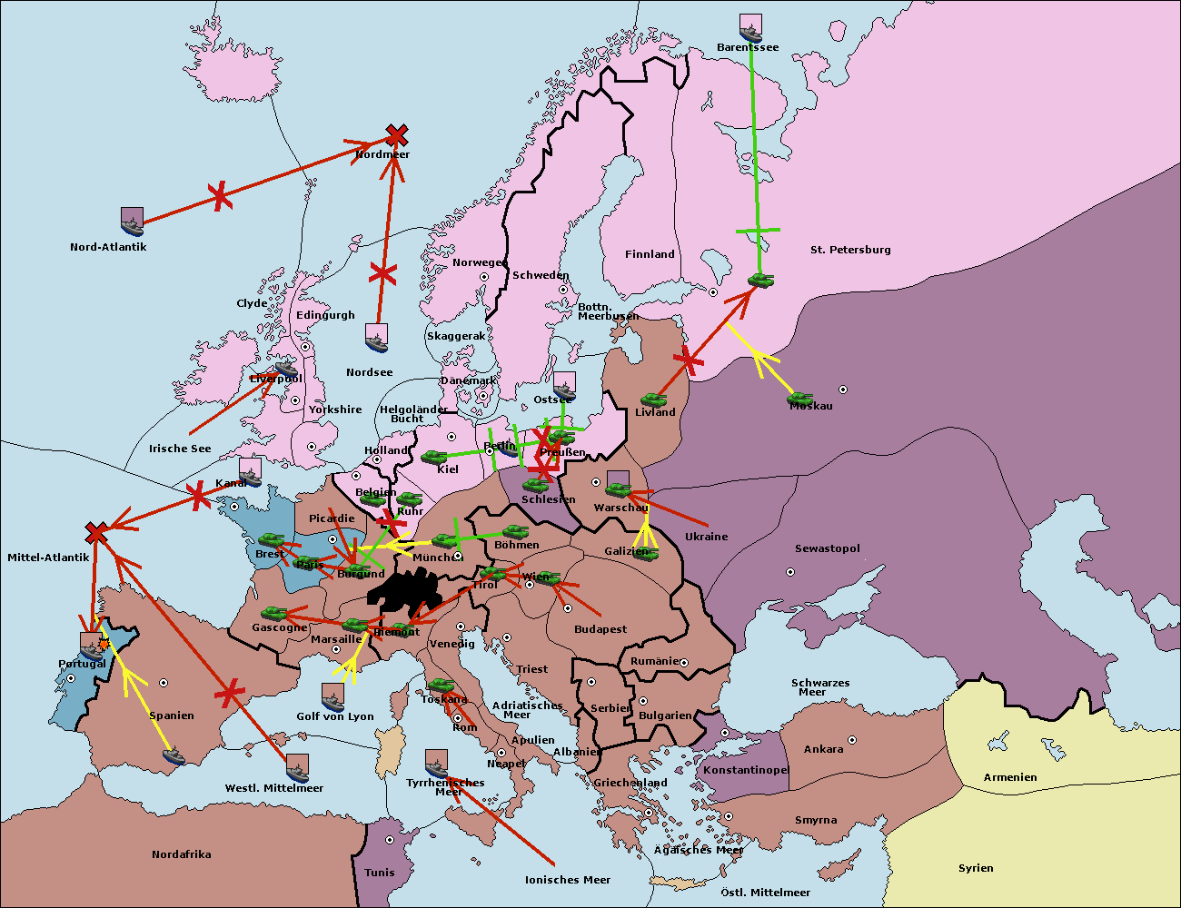 • Die Flotte in Spanien (Südküste) support move nach Mittel-Atlantik von westl. Mittelmeer.