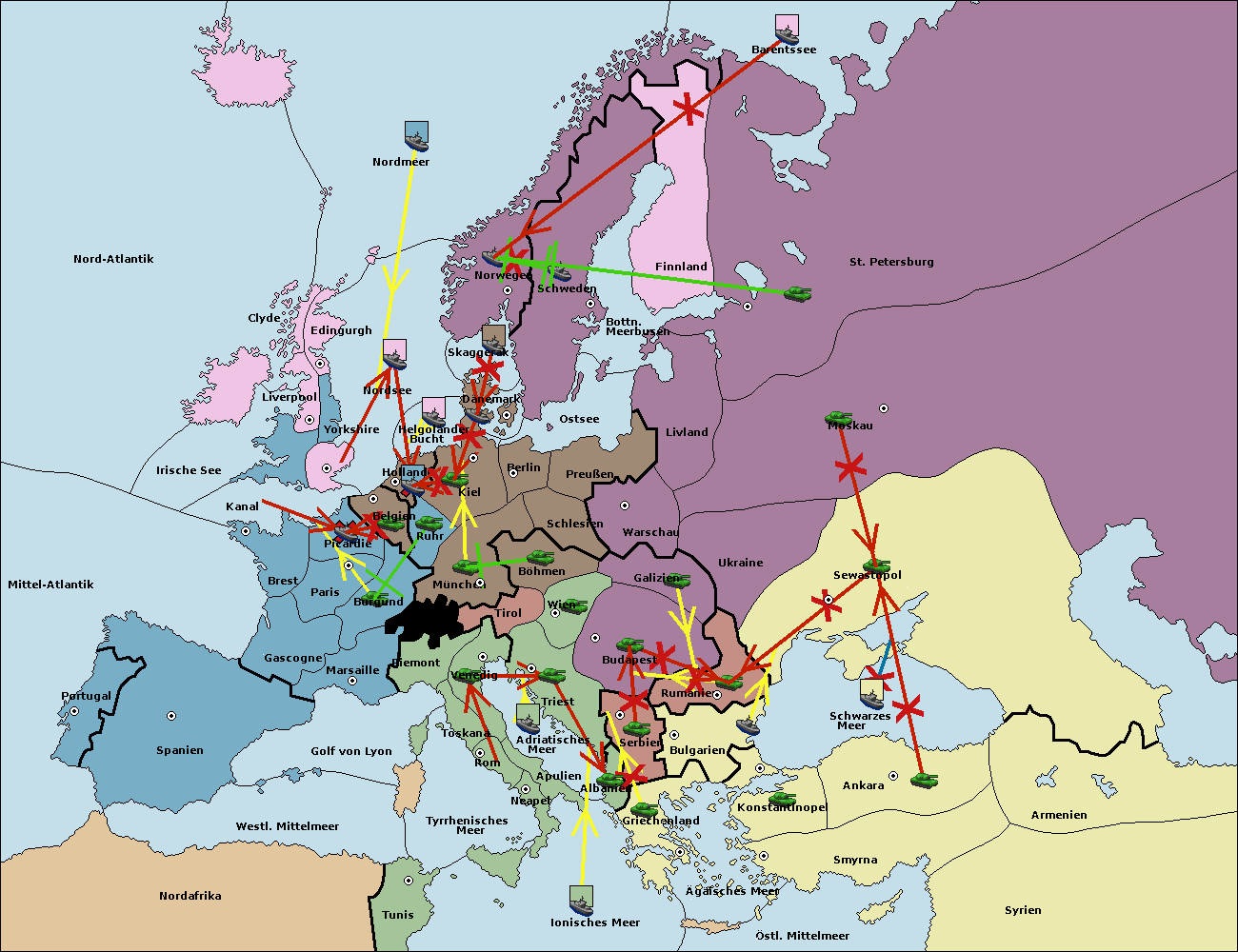 • Die Armee in Norwegen support move nach St. Petersburg von Barentssee. (gescheitert) (verdrängt)