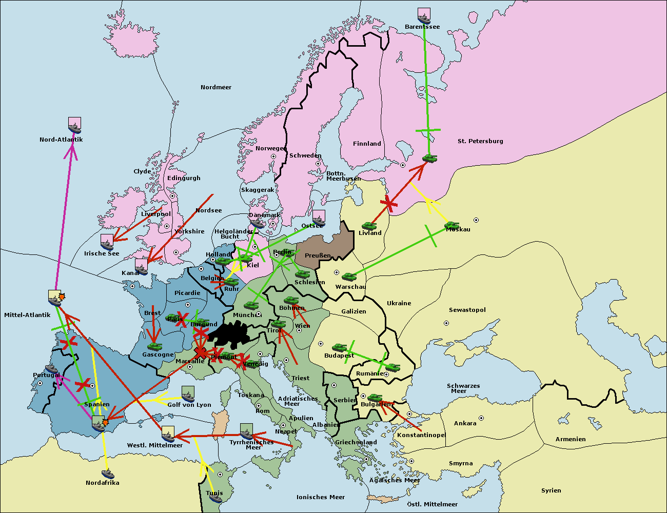 • Die Flotte in Nord Afrika support move nach Mittel-Atlantik von westl. Mittelmeer.