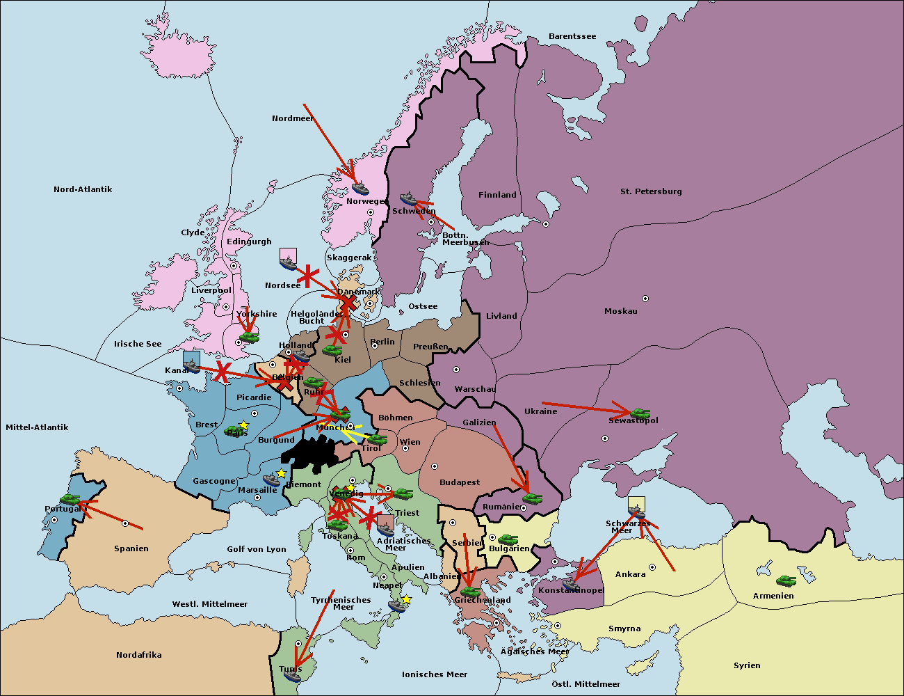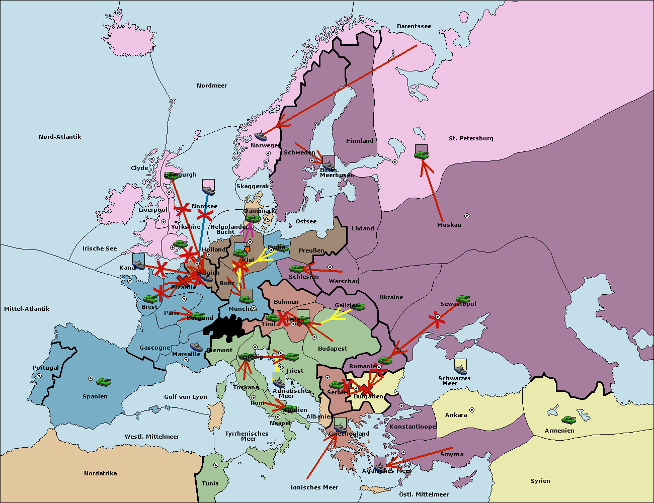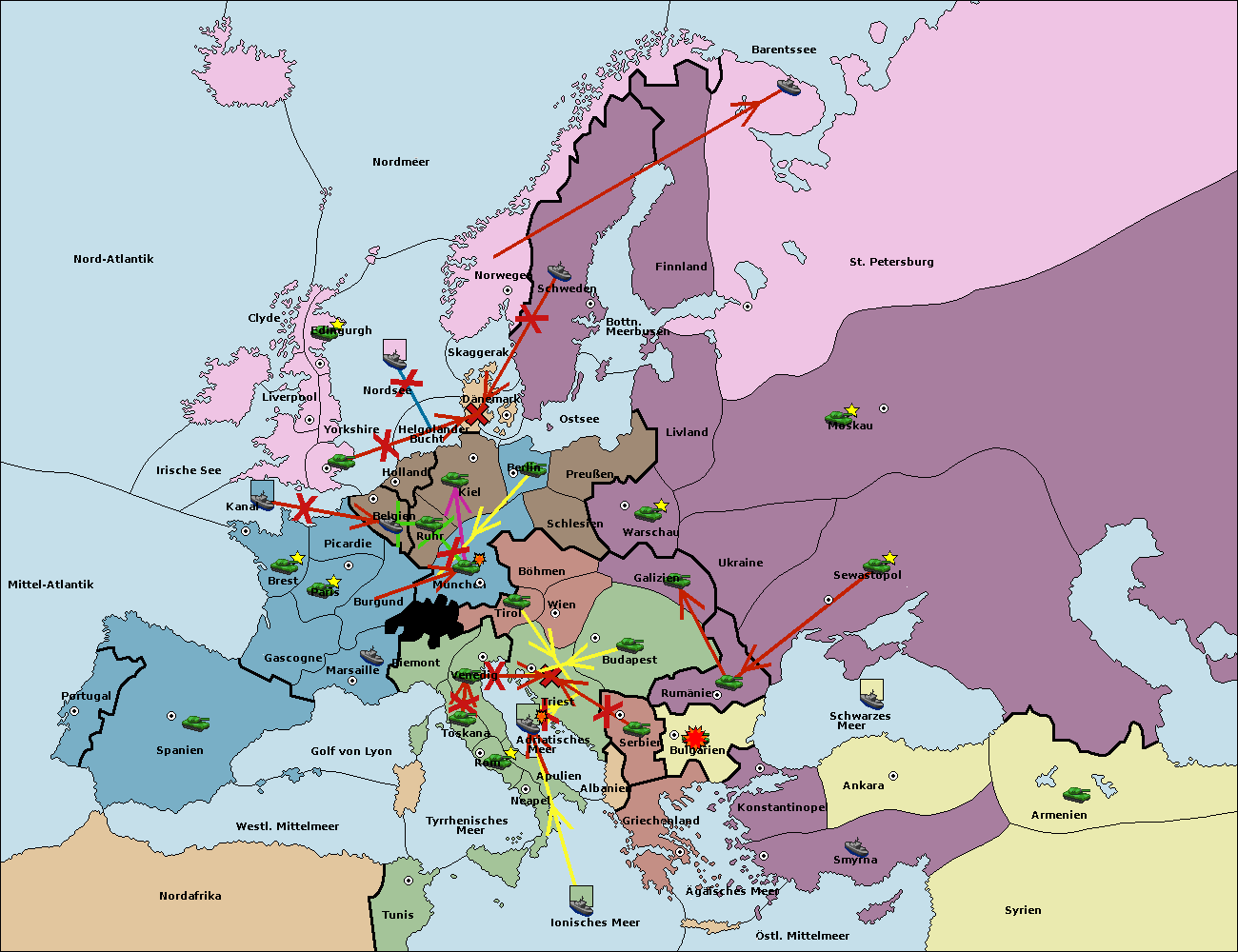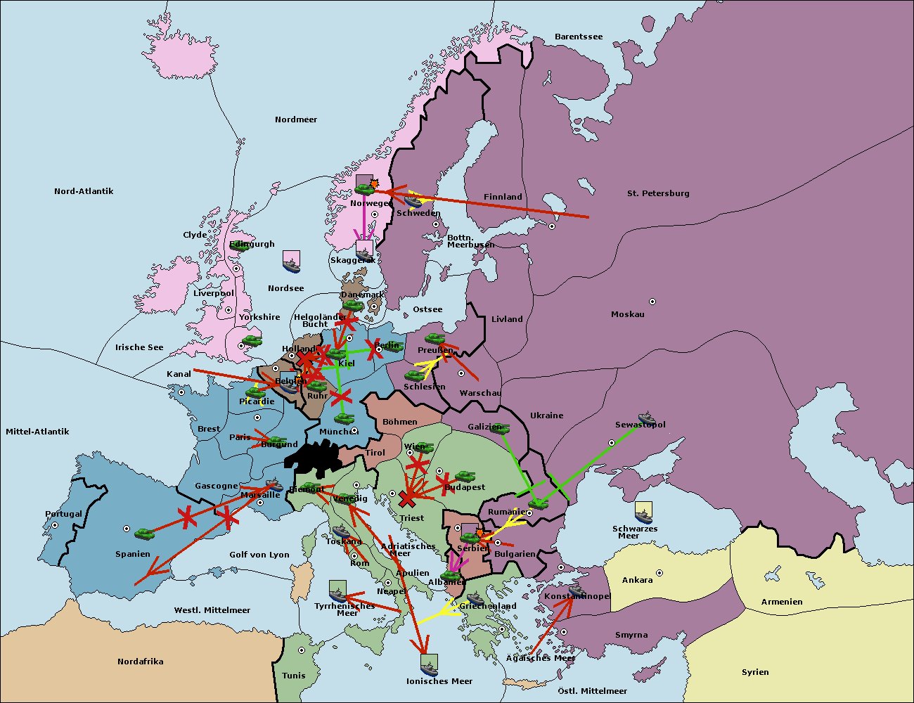• Die Armee in Kiel wird zerstörtFlotte in Kiel gebaut.