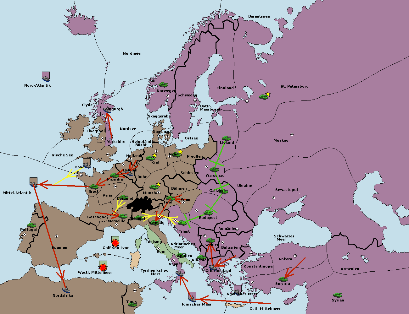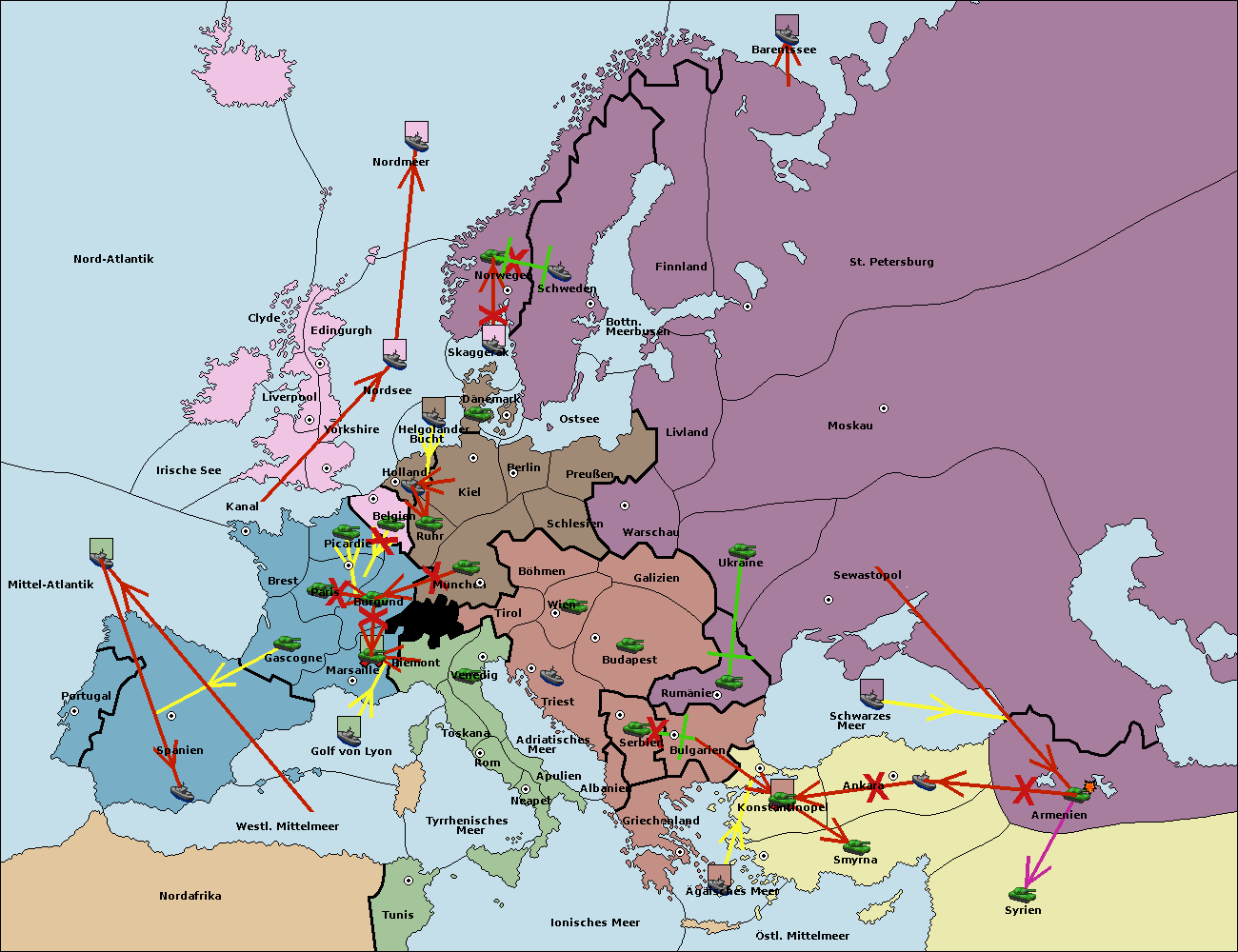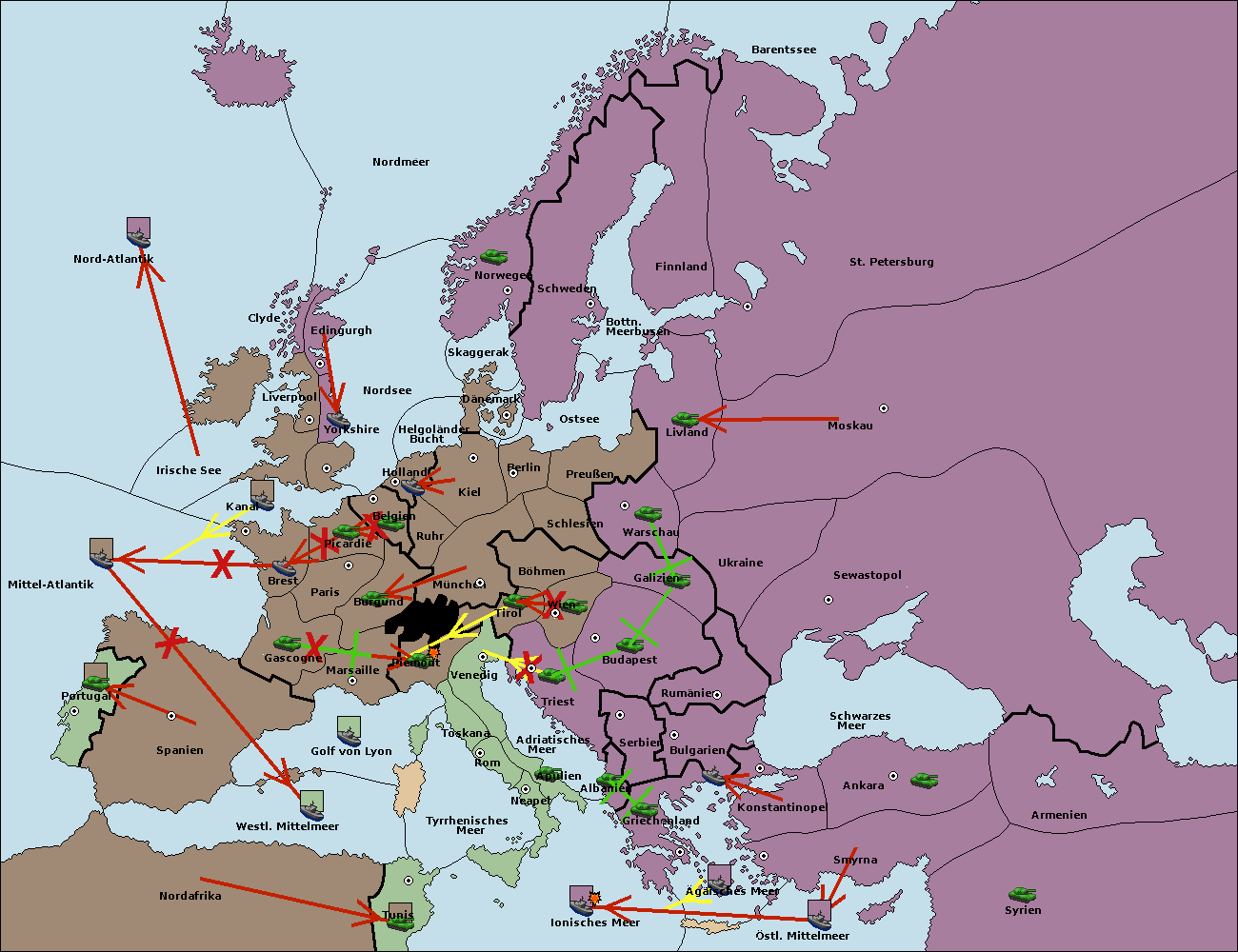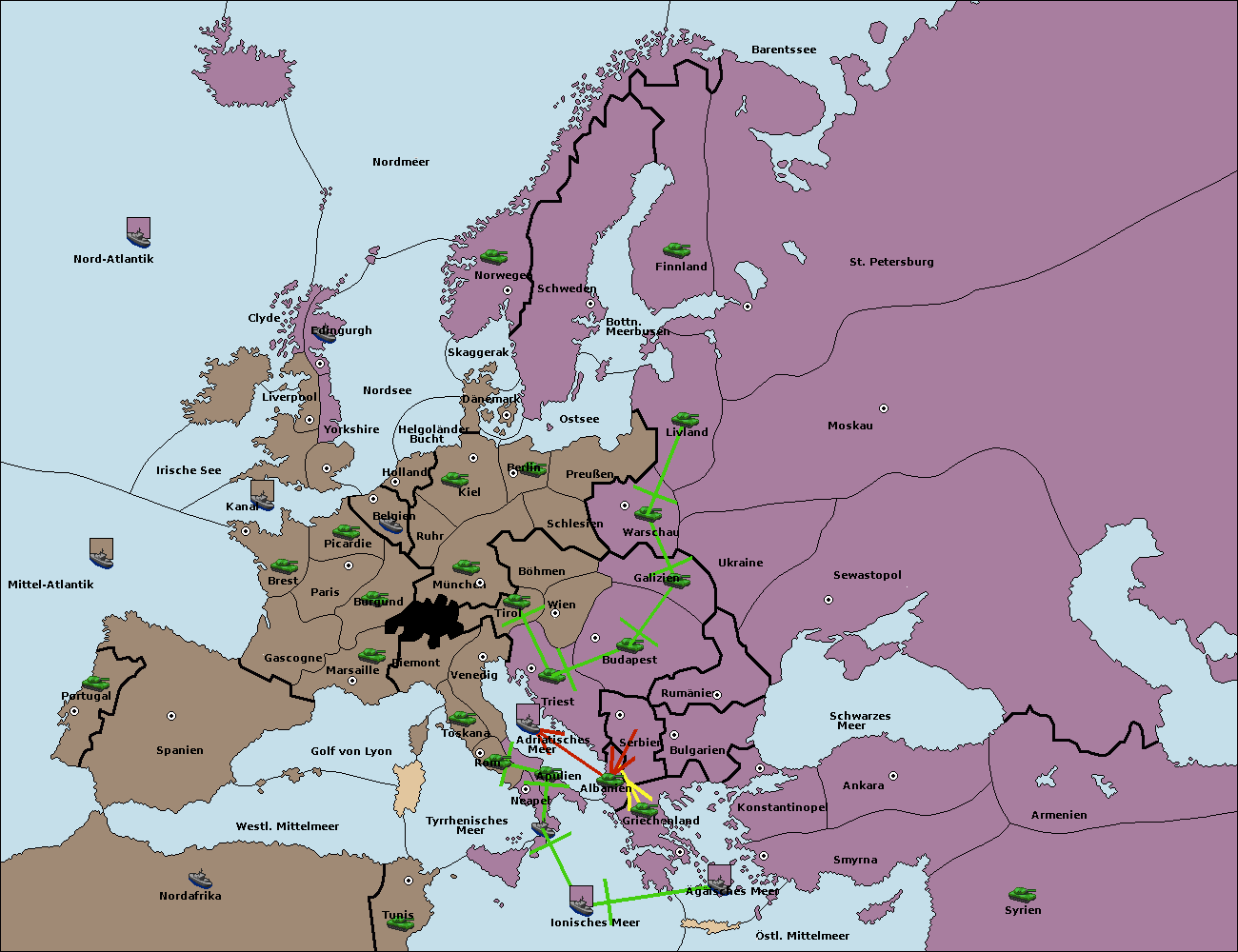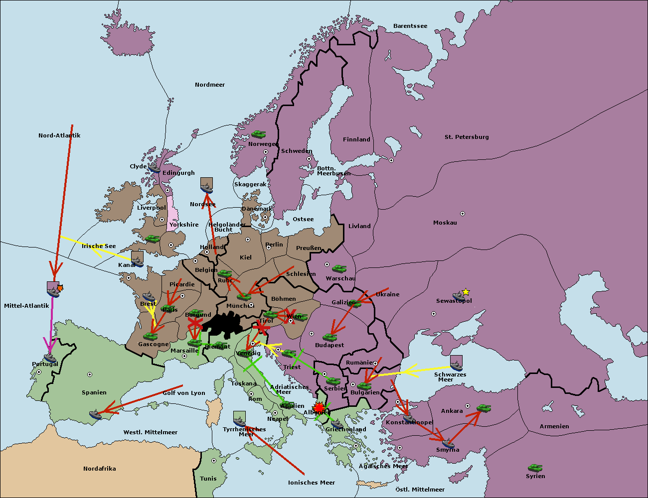 • Die Flotte in Bulgarien (Südküste) move nach Griechenland.