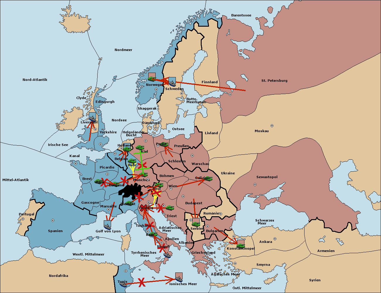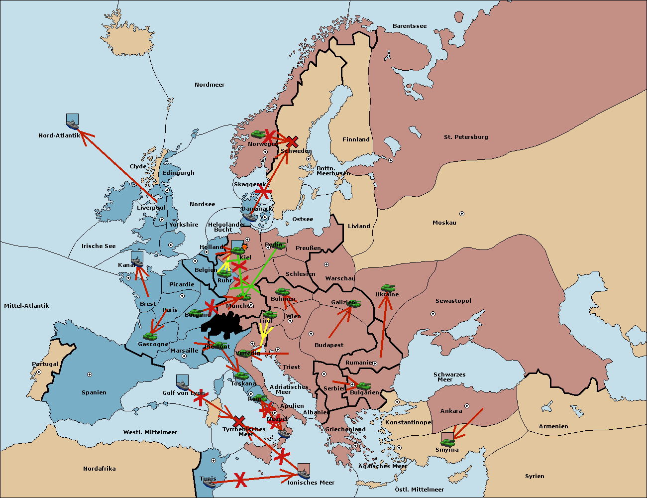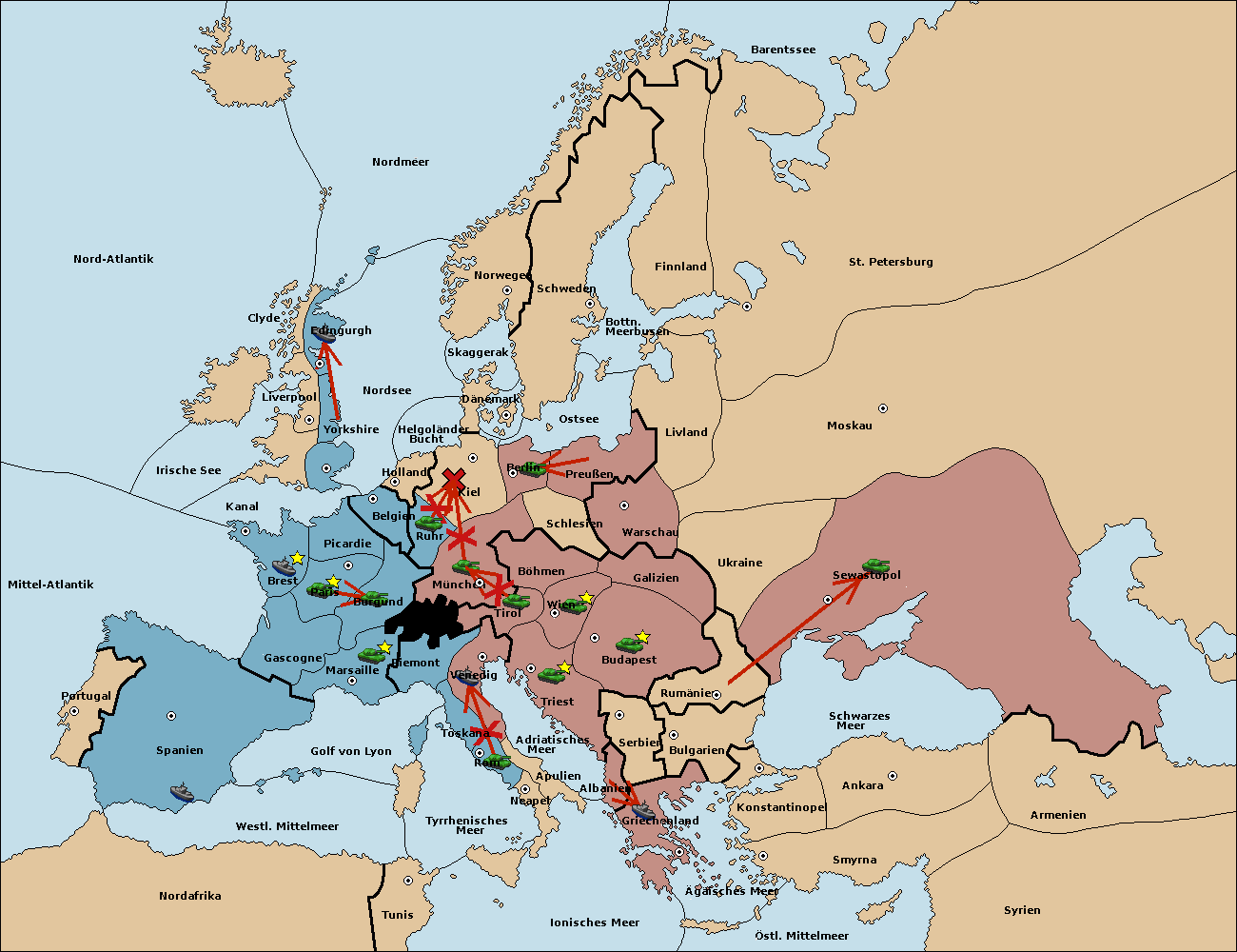 • Die Armee in Kiel wird zerstörtFlotte in Kiel gebaut.