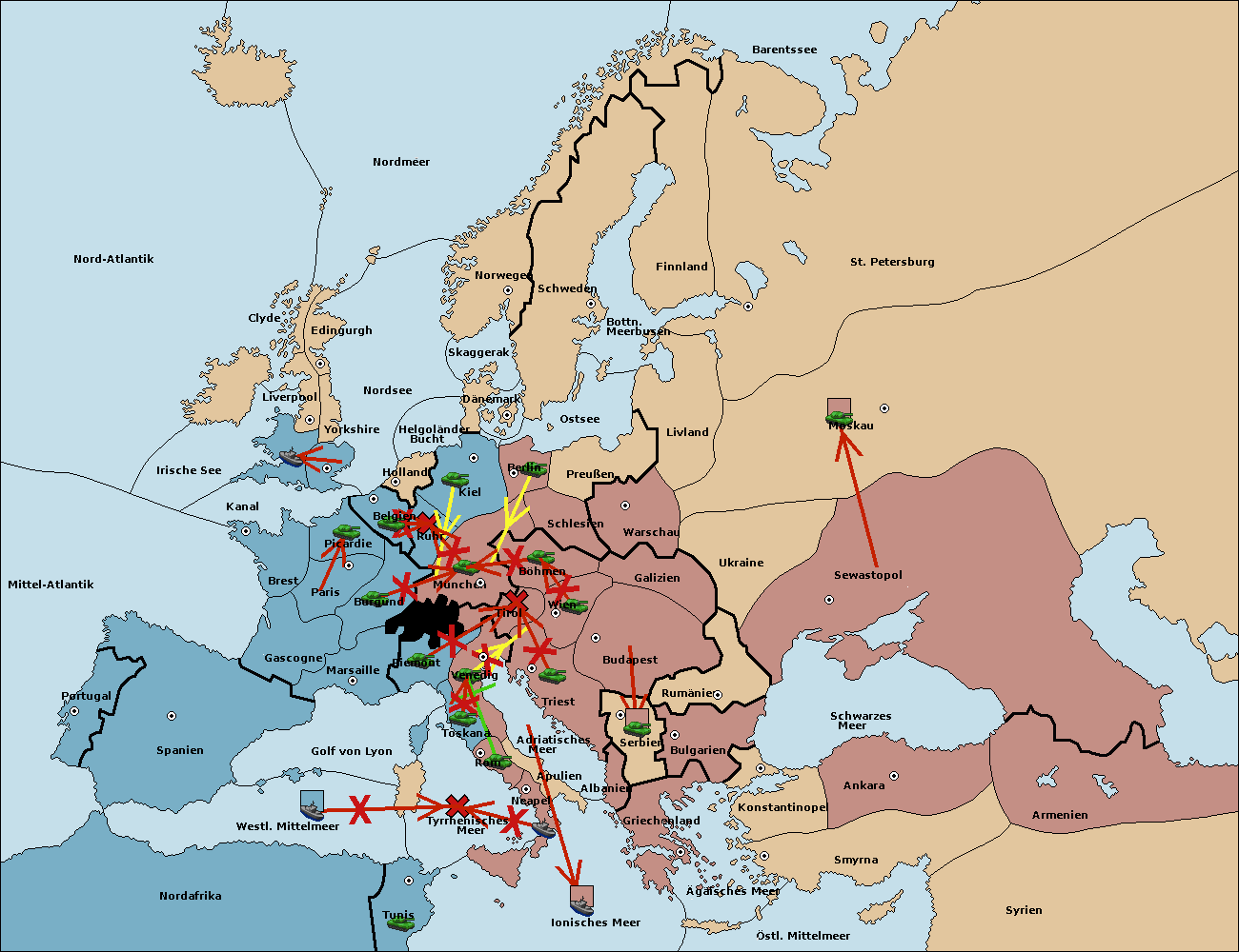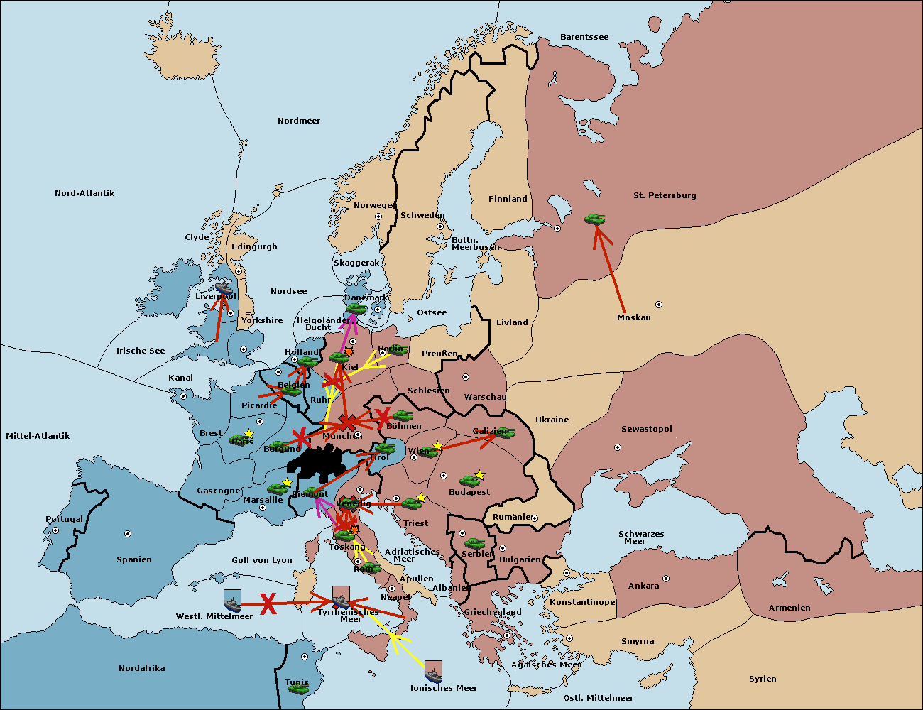 • Die Armee in Kiel support move nach München von Burgund. (gescheitert) (verdrängt)