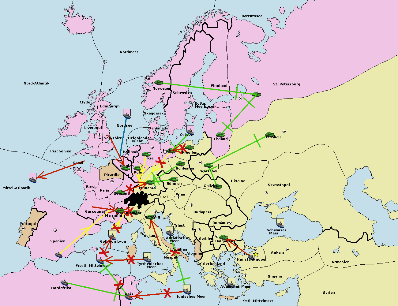 • Die Armee in Kiel support move nach München von Burgund.