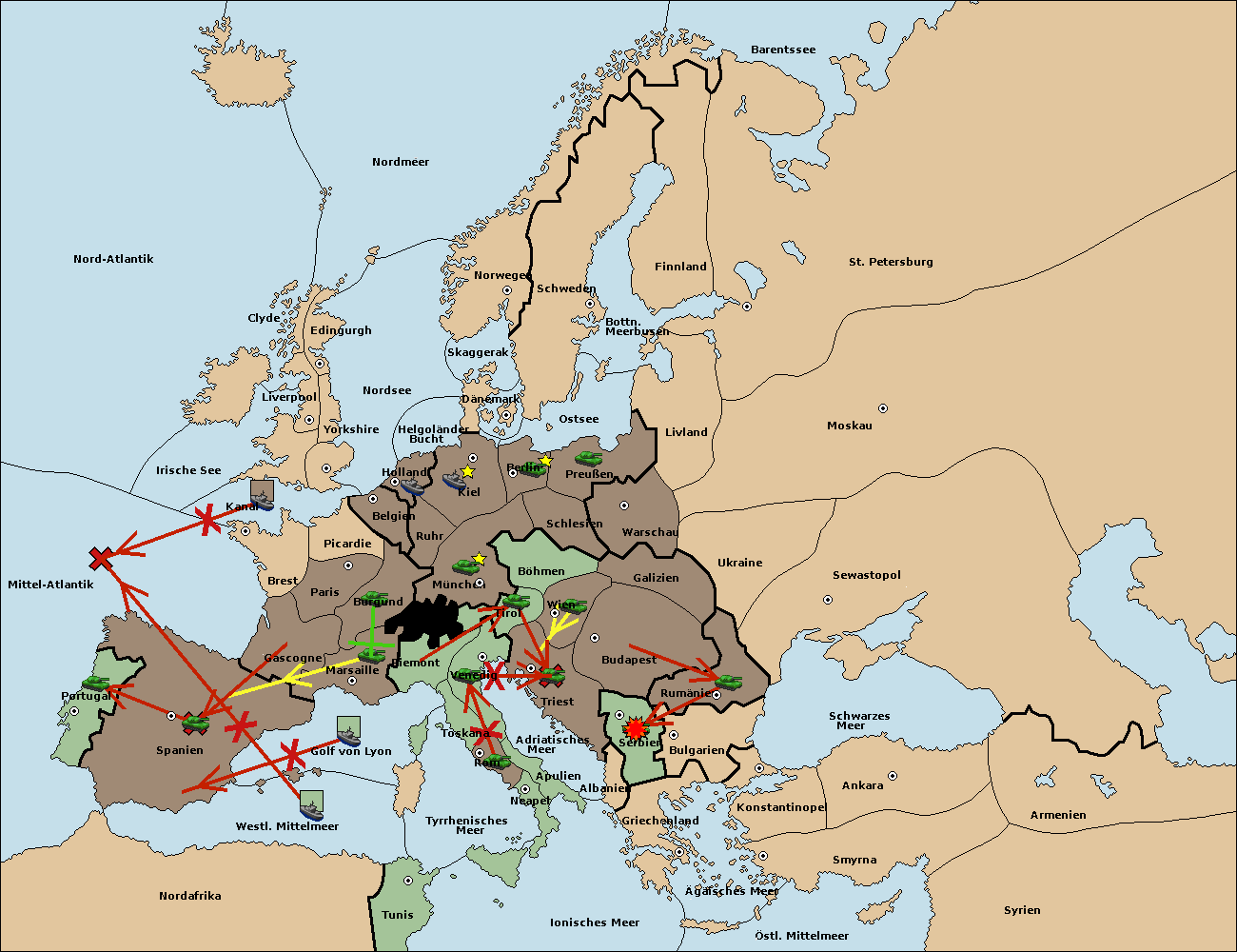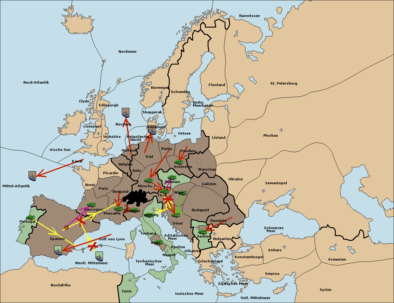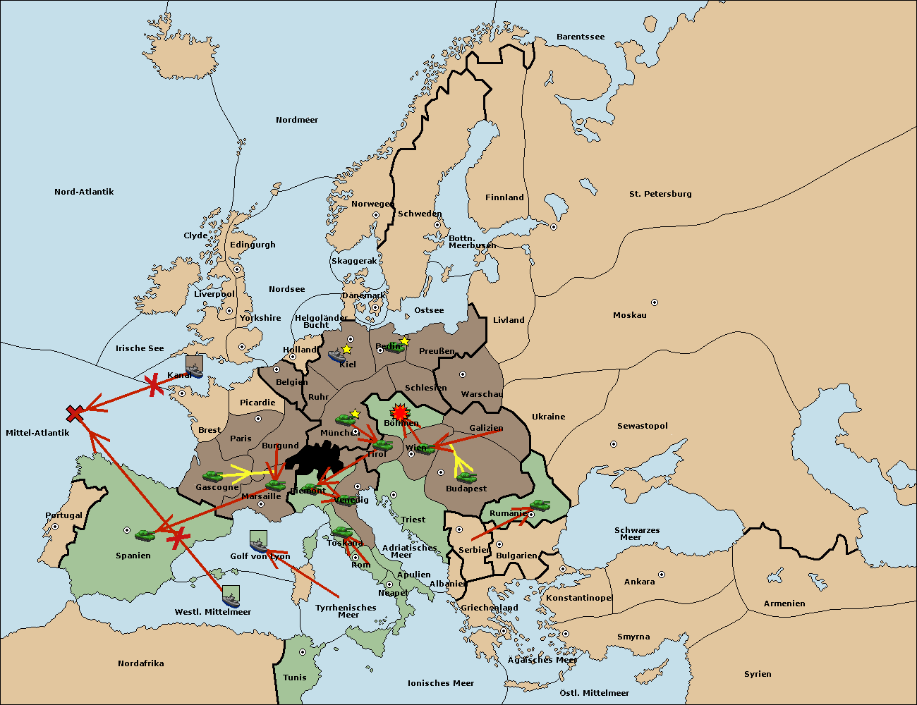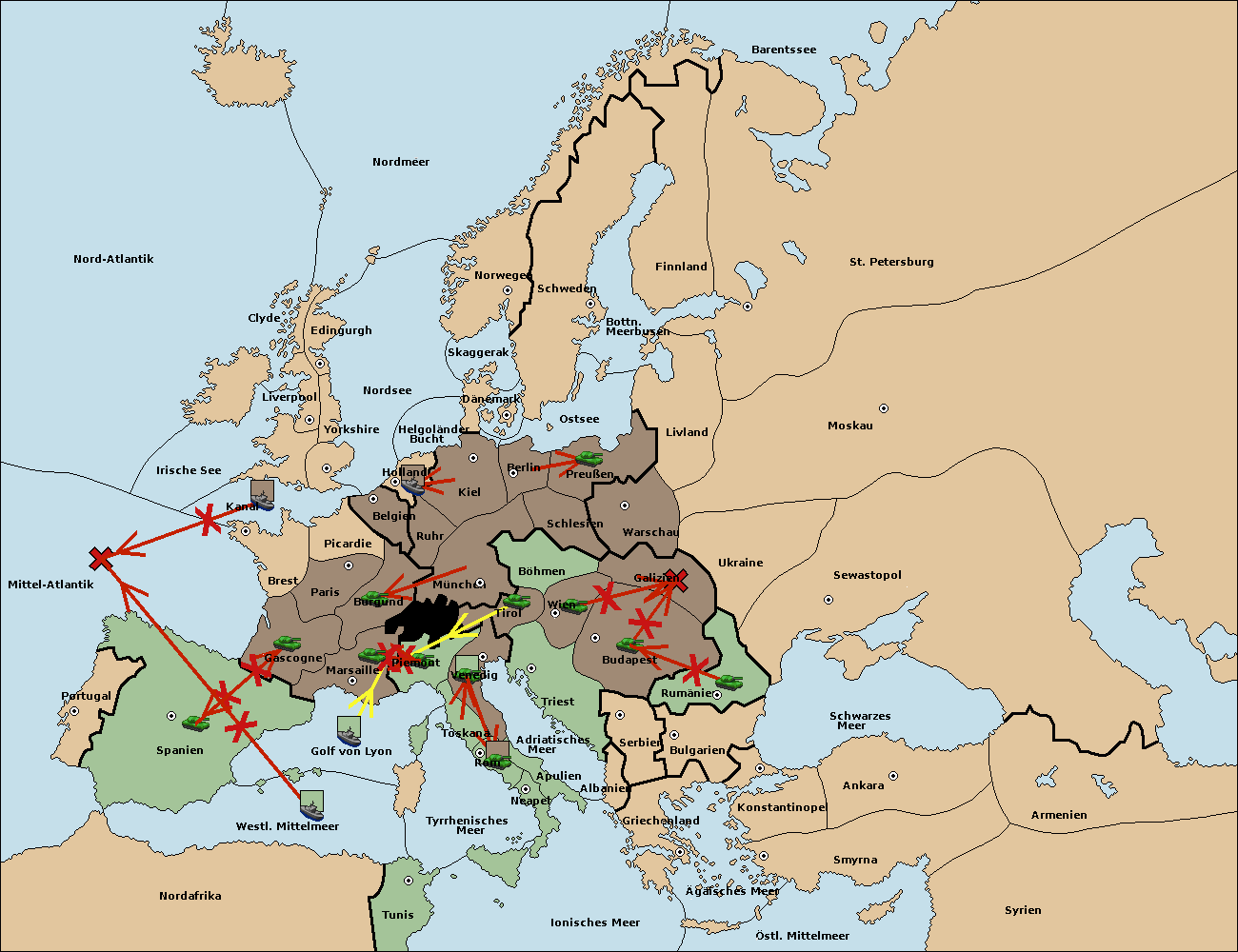 • Die Flotte in Spanien (Südküste) support move nach Mittel-Atlantik von westl. Mittelmeer.