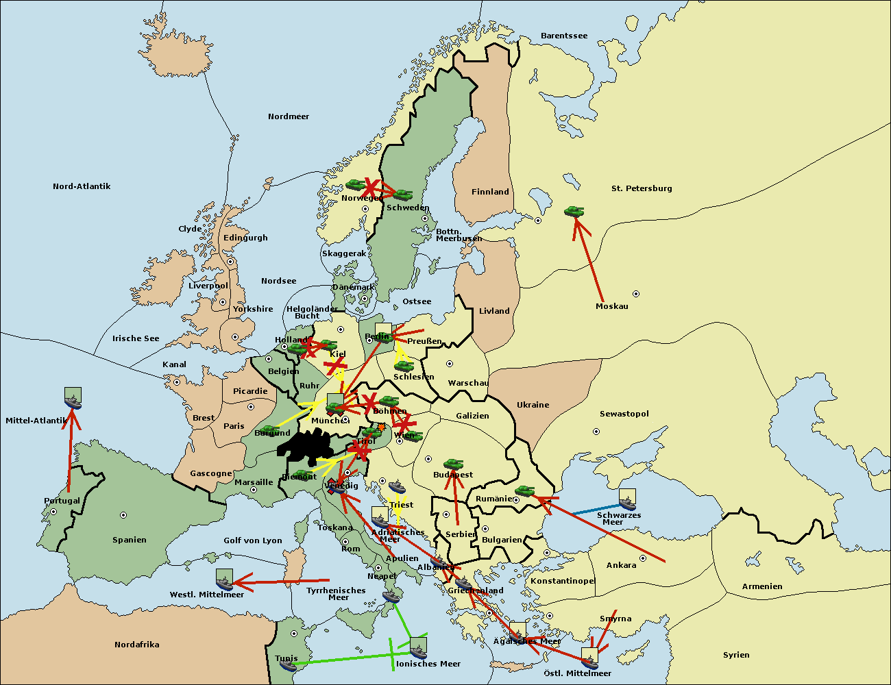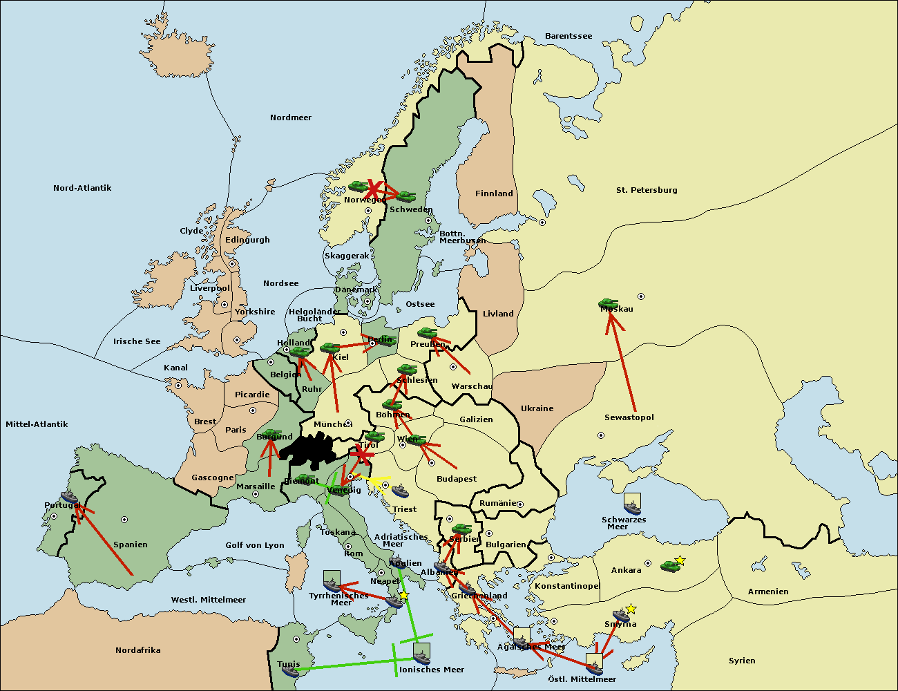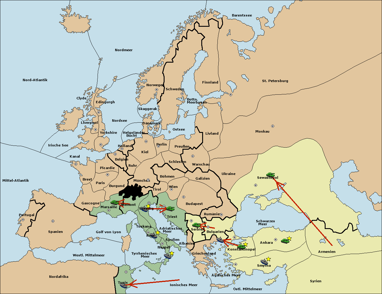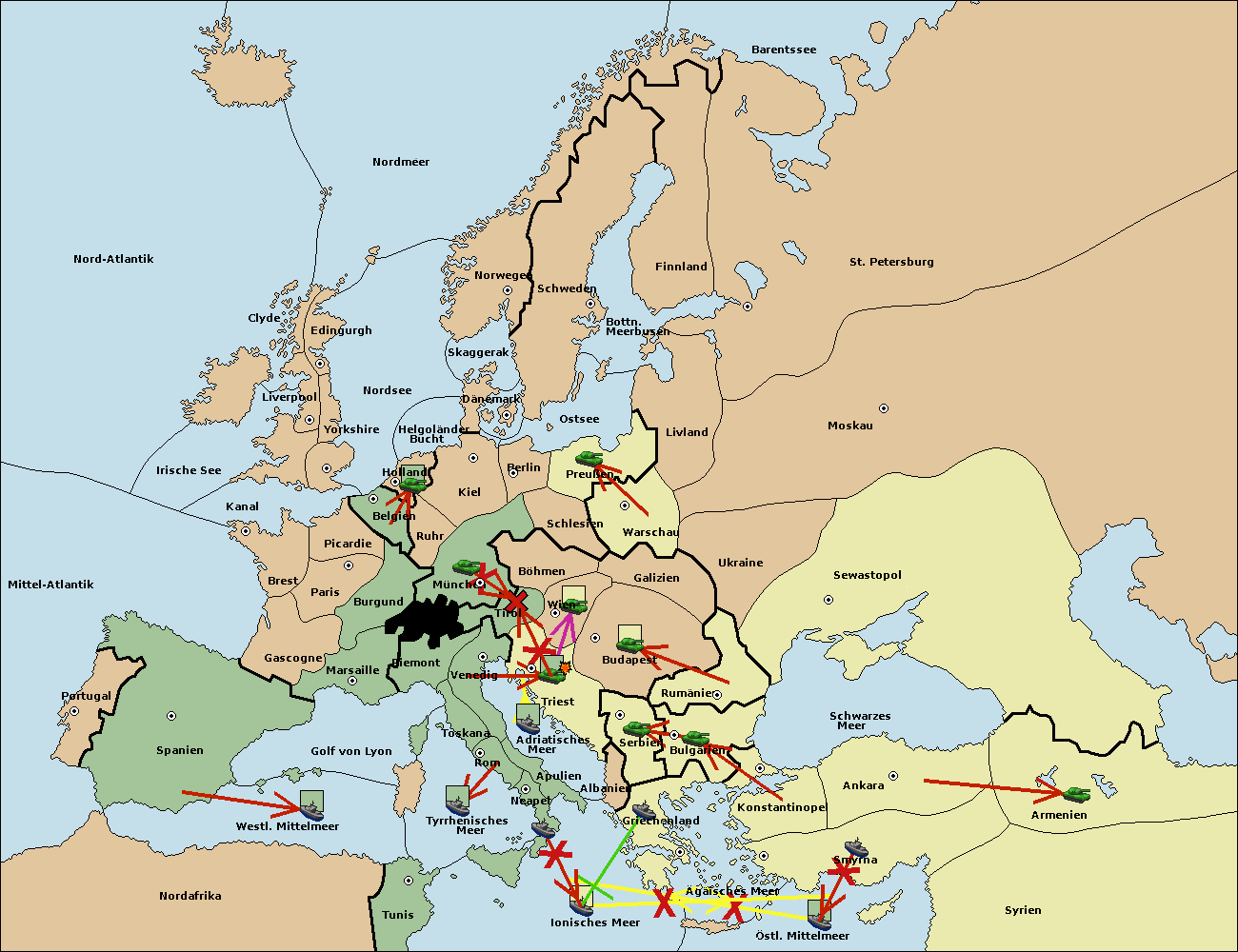• Die Flotte in Bulgarien (Südküste) move nach Griechenland.