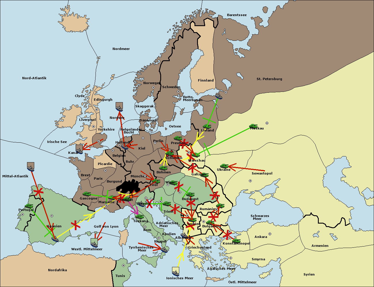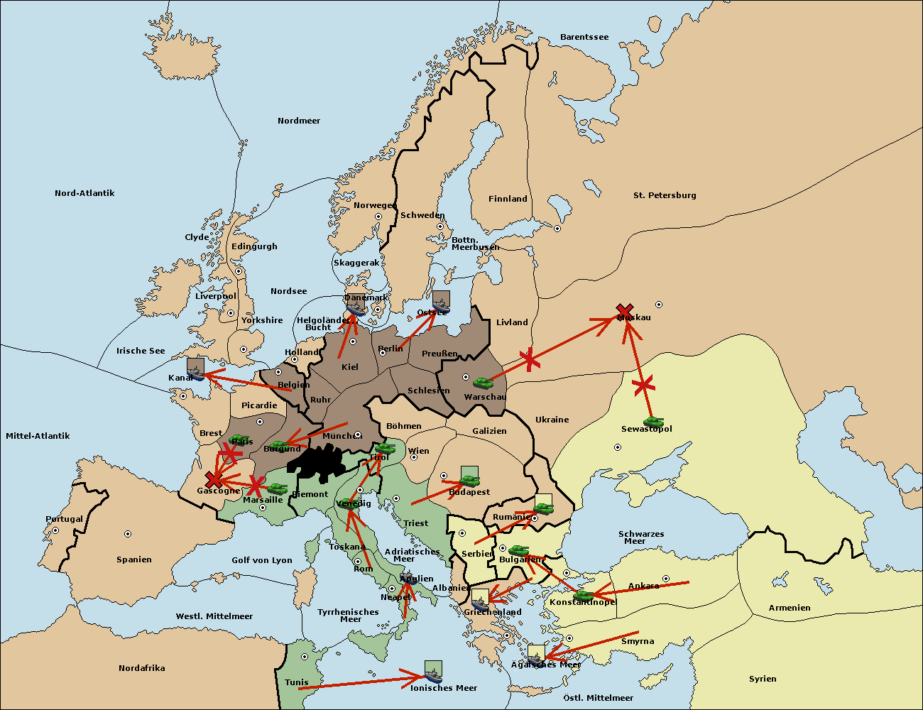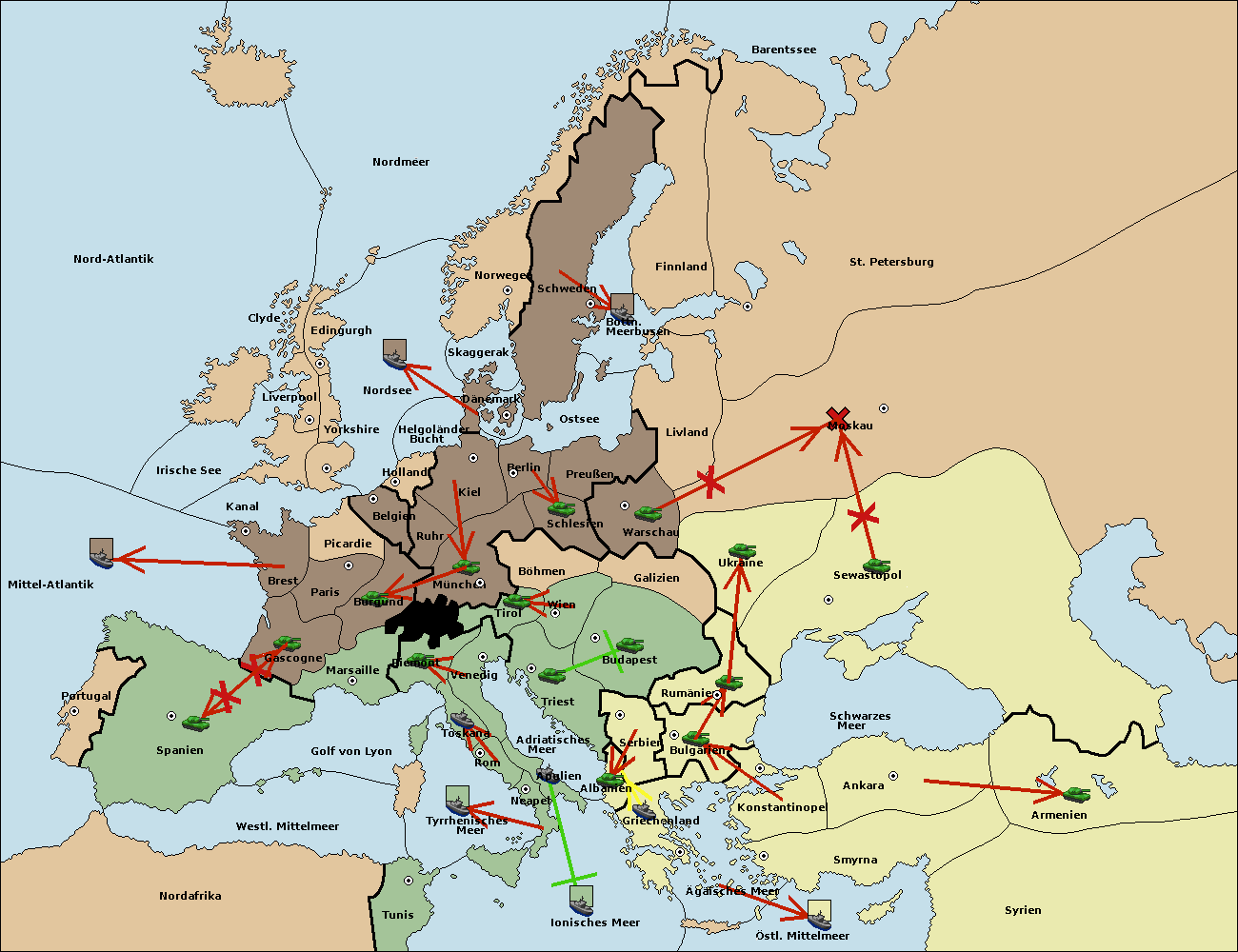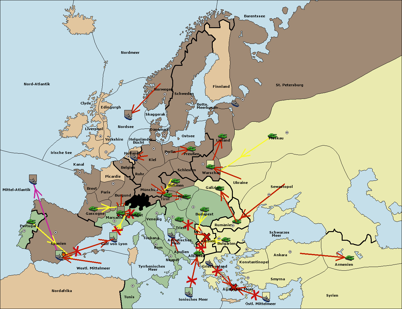 • Die Flotte in Bulgarien (Südküste) move nach Griechenland.
