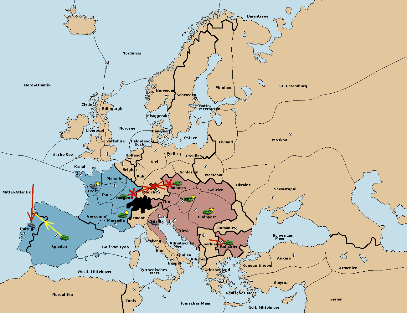 • Die Armee in Spanien support move nach Portugal von Mittel-Atlantik.