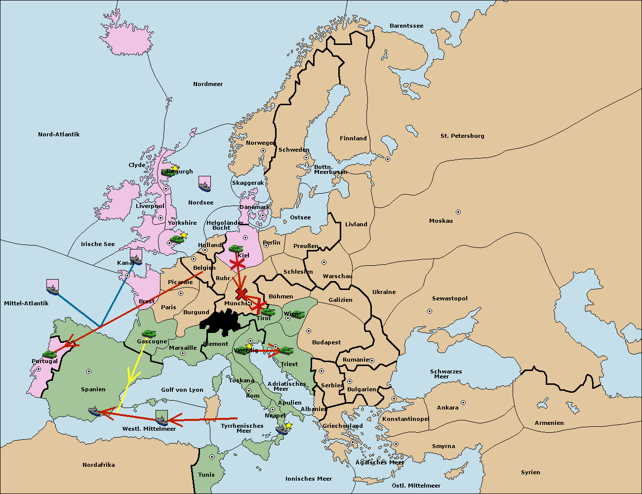 • Die Flotte in Spanien (Südküste) move nach Portugal.