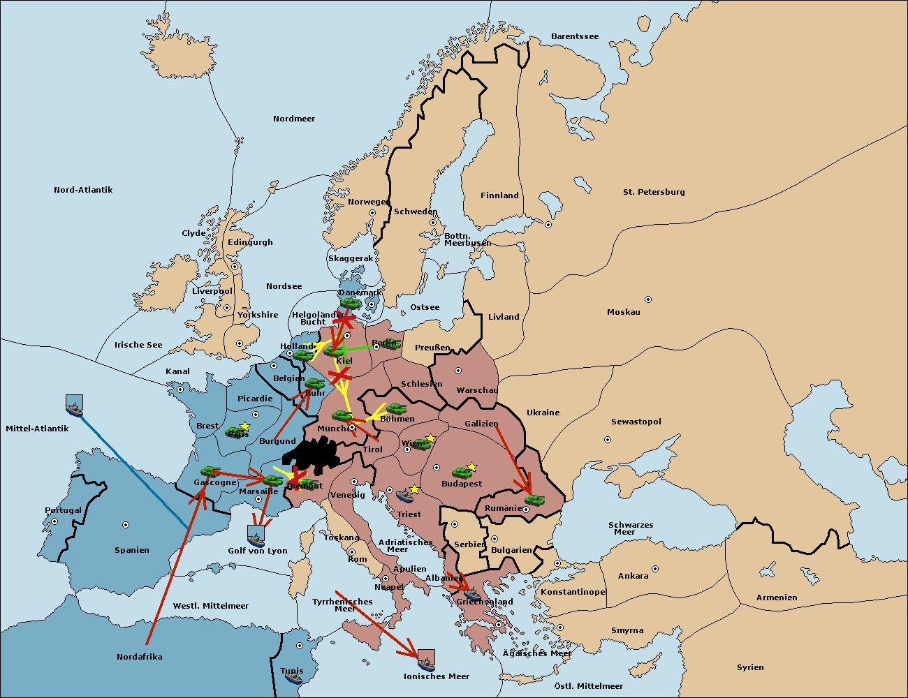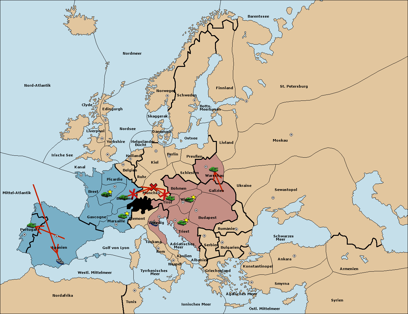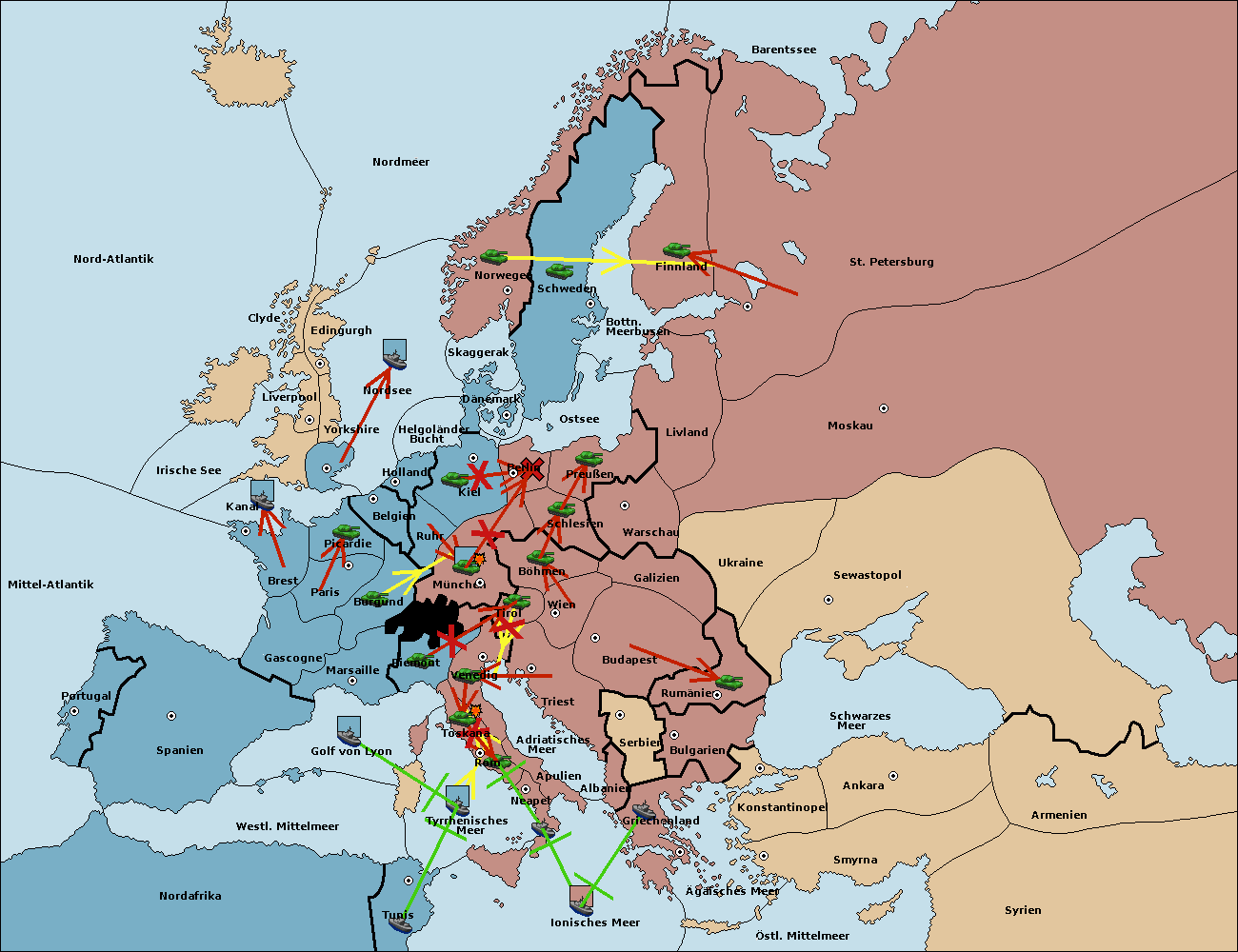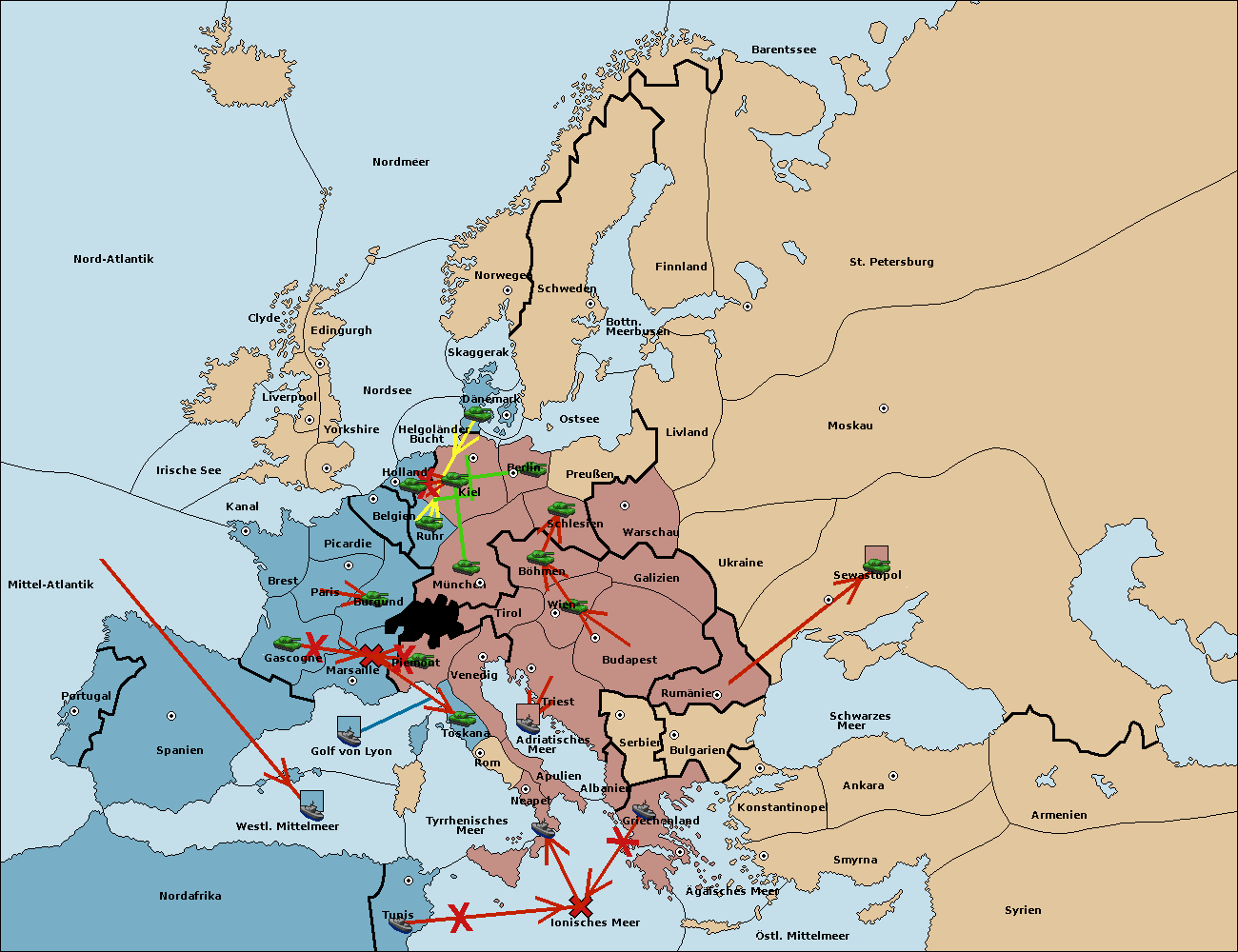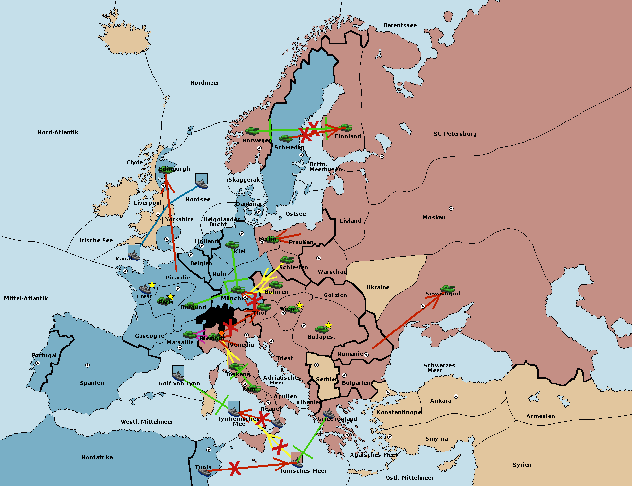 • Die Armee in Kiel support move nach München von Burgund. (gescheitert) (verdrängt)