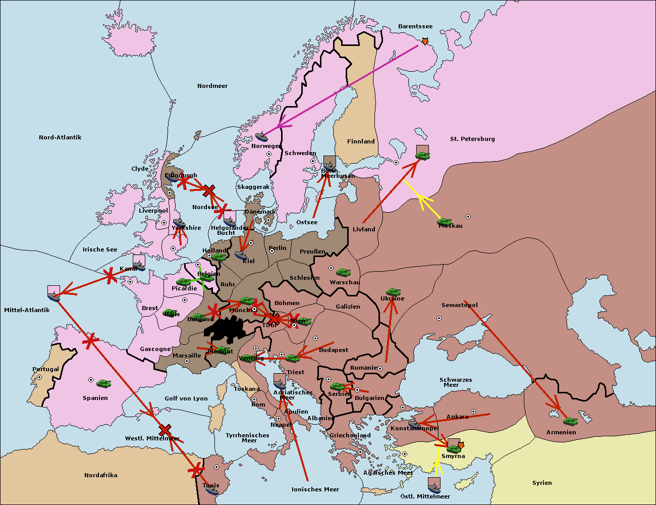 • Die Flotte in St. Petersburg (Nordküste) zieht sich nach Norwegen zurück.