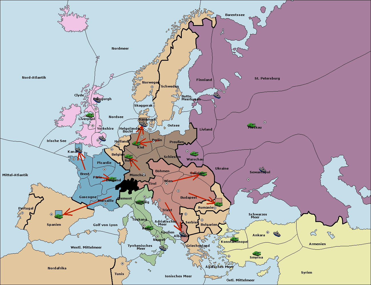 • Die Flotte in Spanien (Südküste) move nach Portugal.