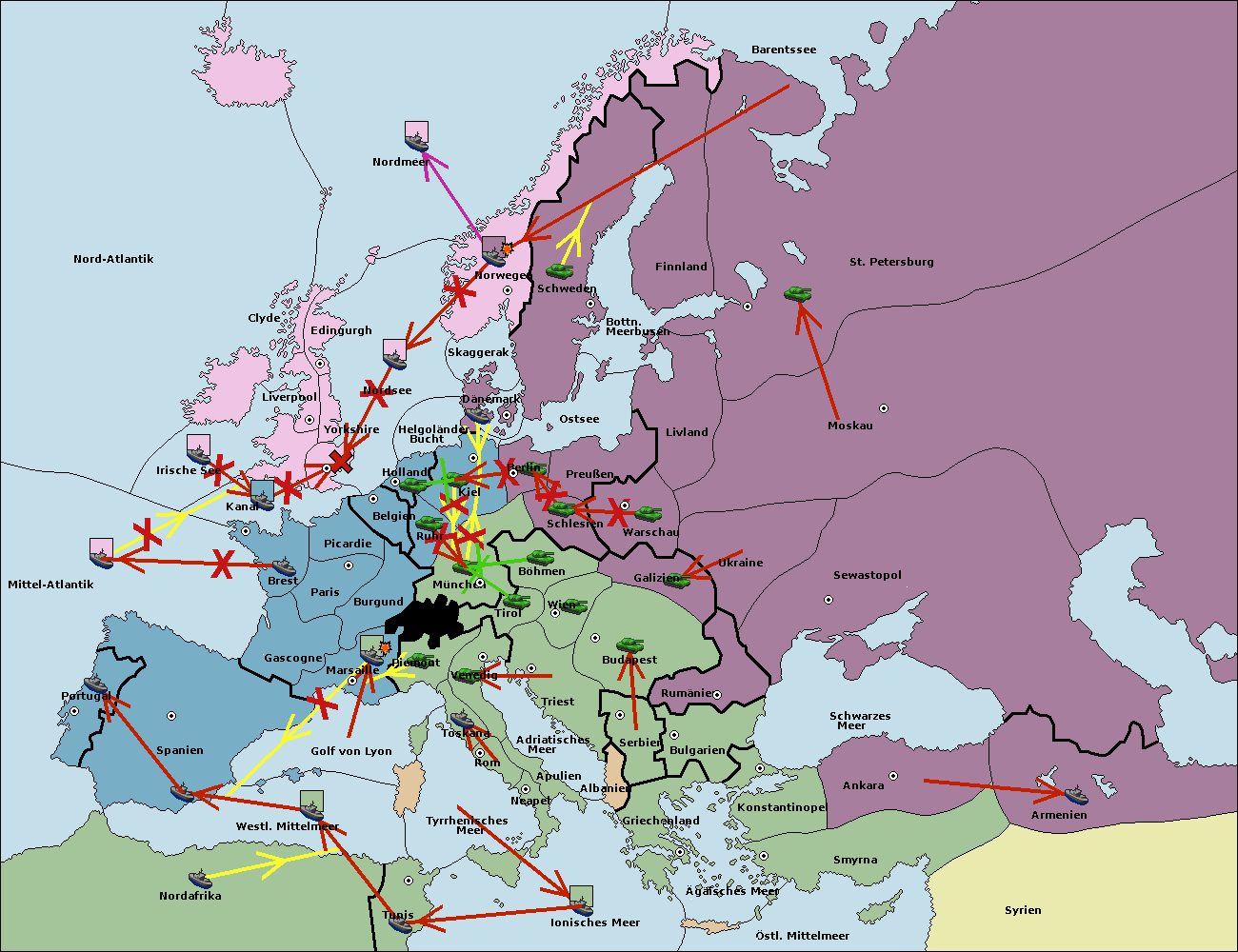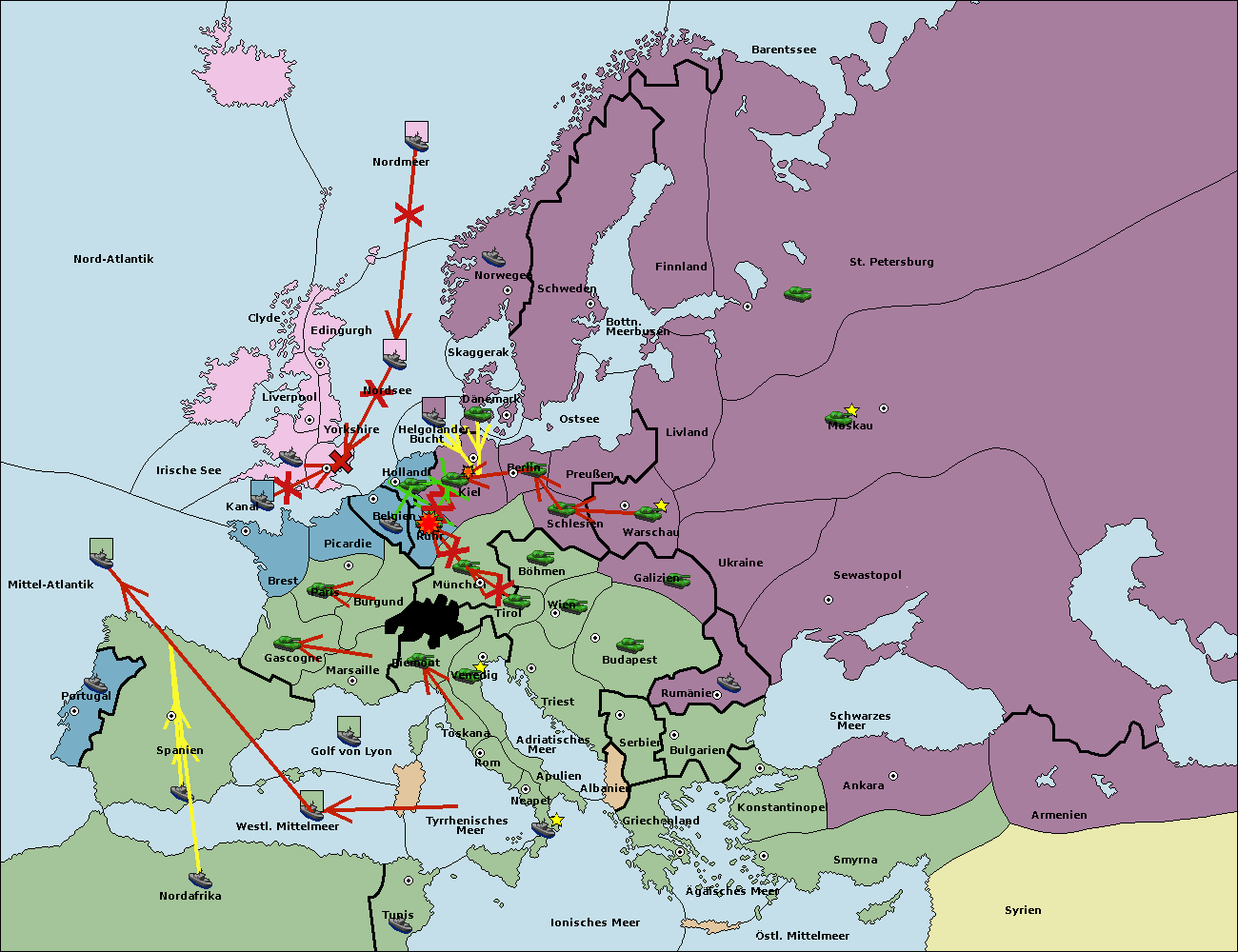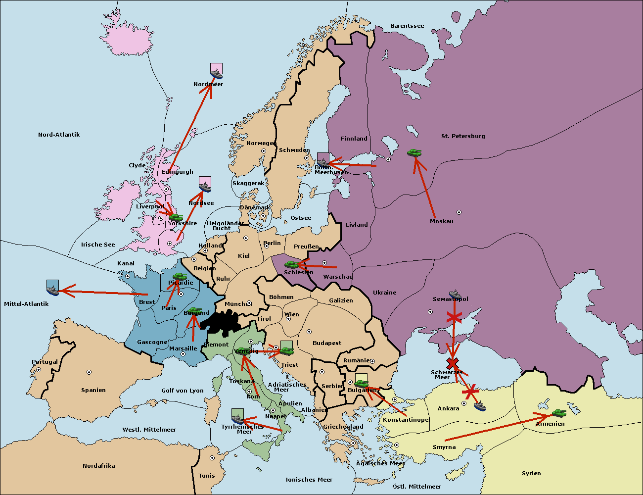 • Die Flotte in Spanien (Südküste) support move nach Mittel-Atlantik von westl. Mittelmeer.