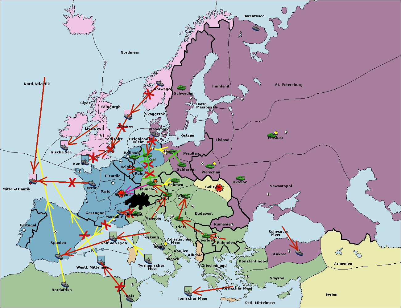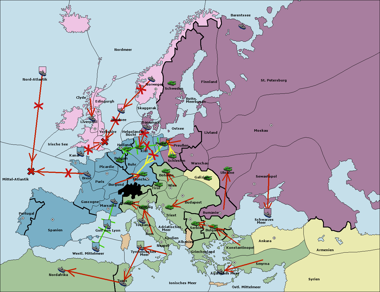 • Die Armee in Kiel wird zerstörtFlotte in Kiel gebaut.