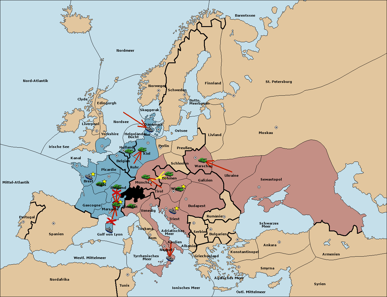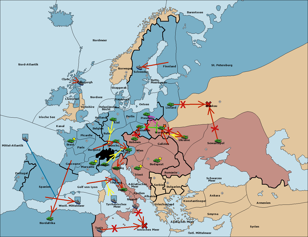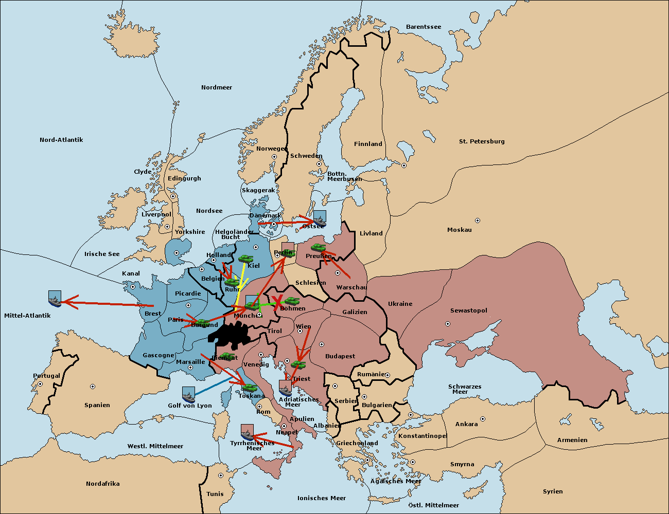 • Die Armee in Kiel support move nach München von Burgund.