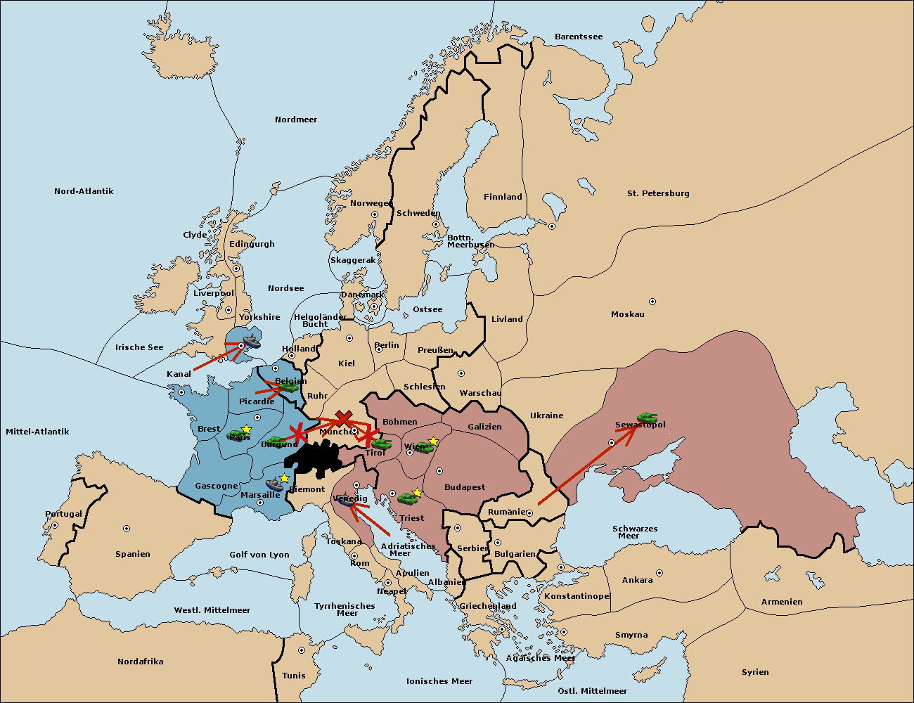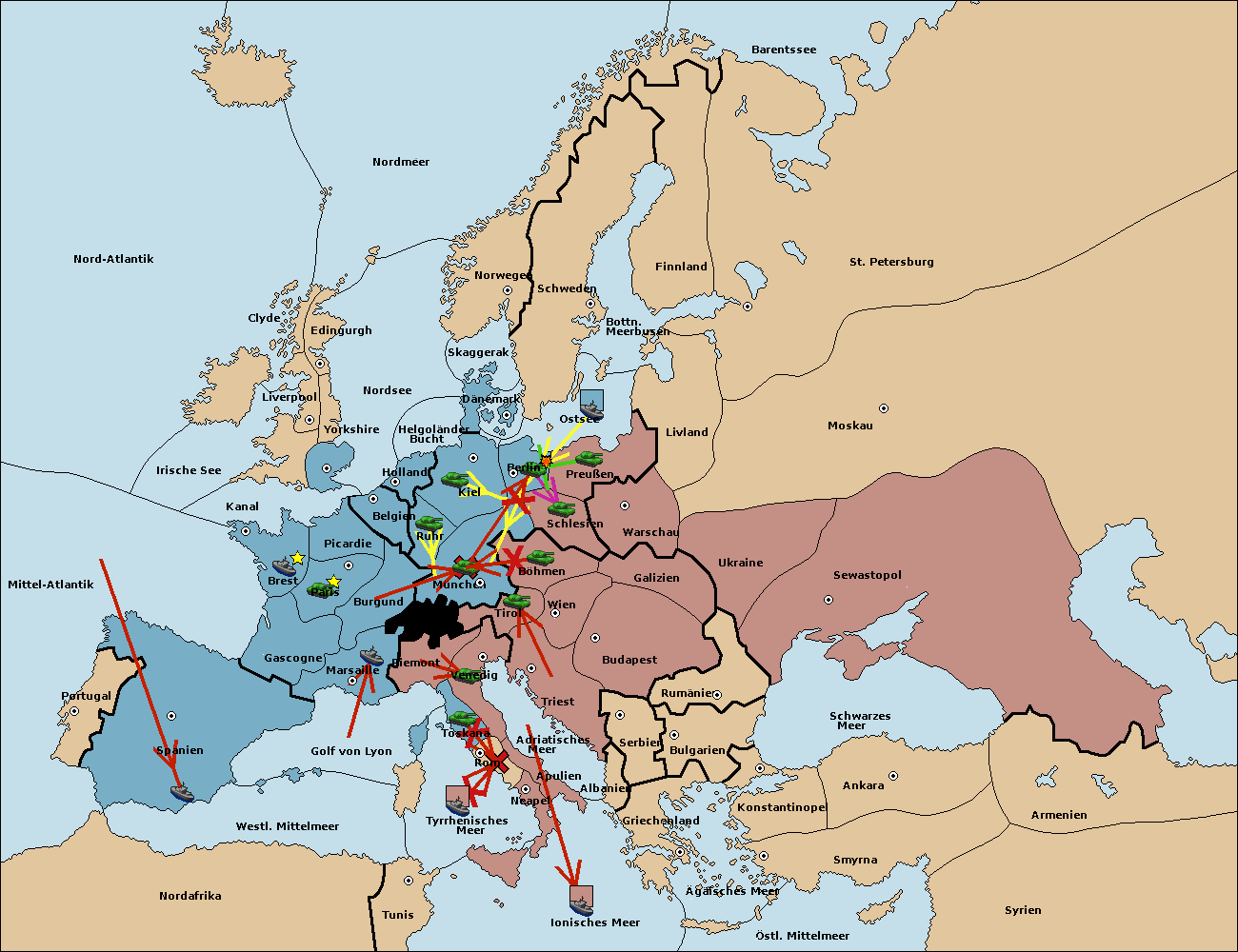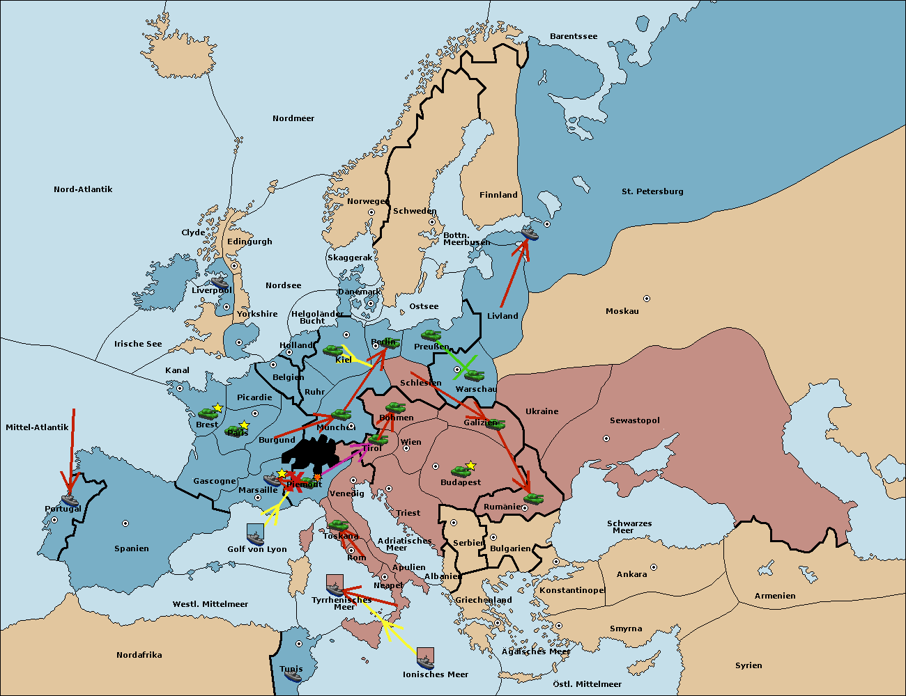 • Die Armee in Kiel support move nach München von Burgund.