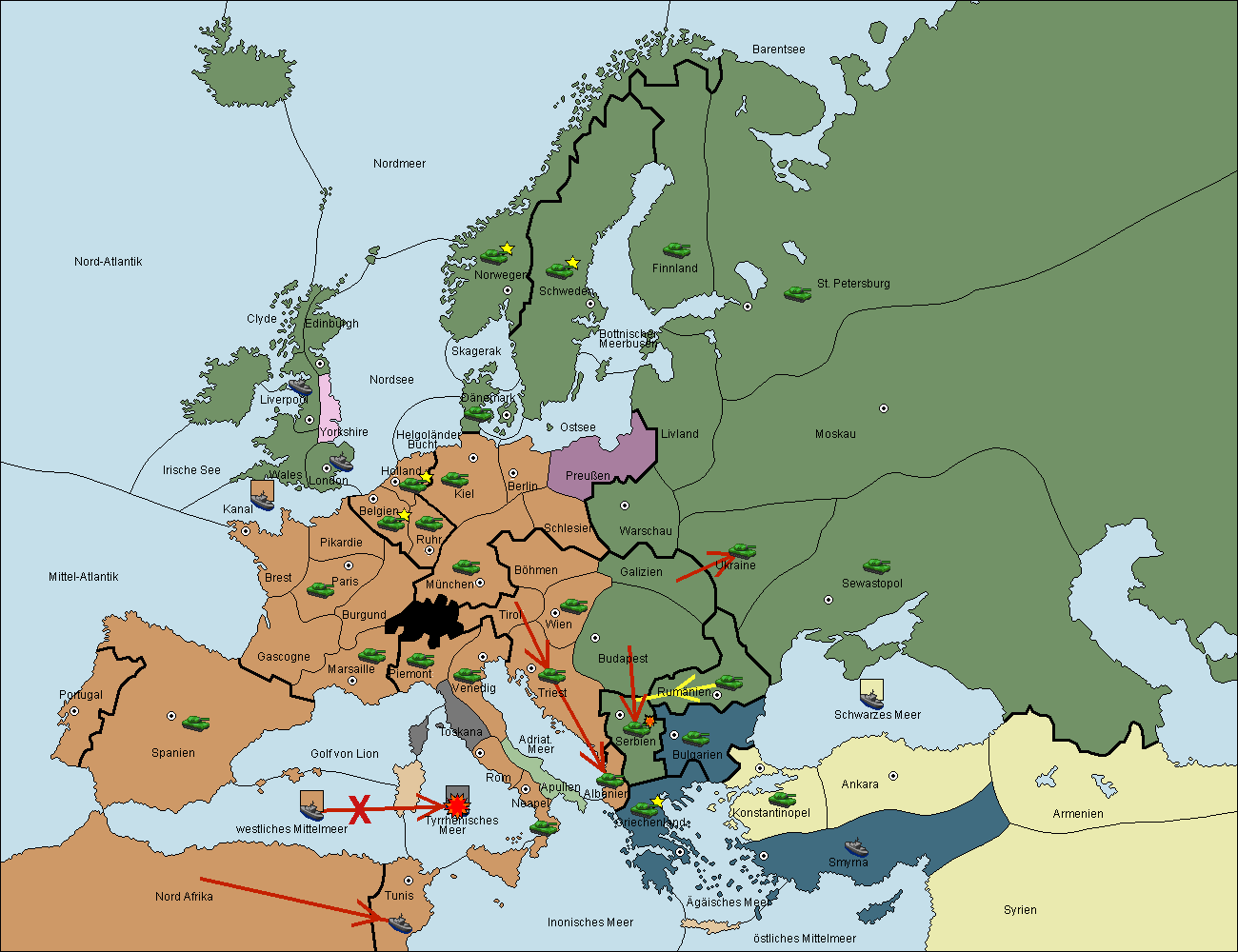• Die Armee in Triest support move nach Serbien von Bulgarien.