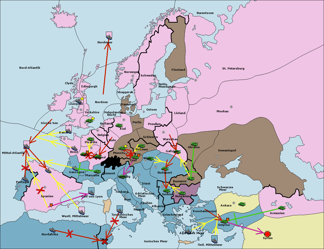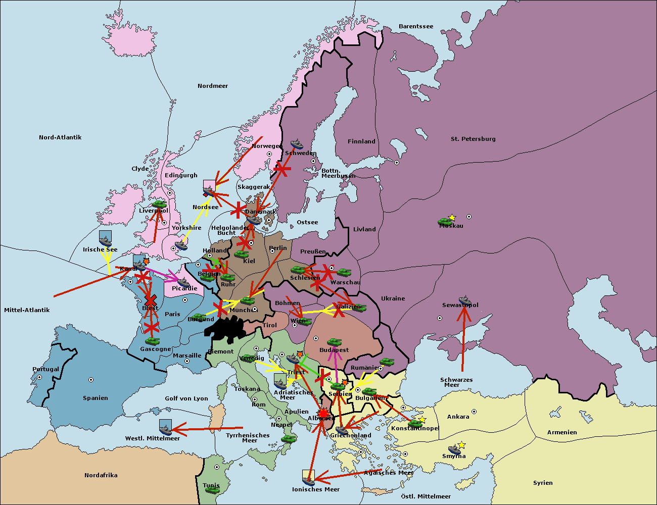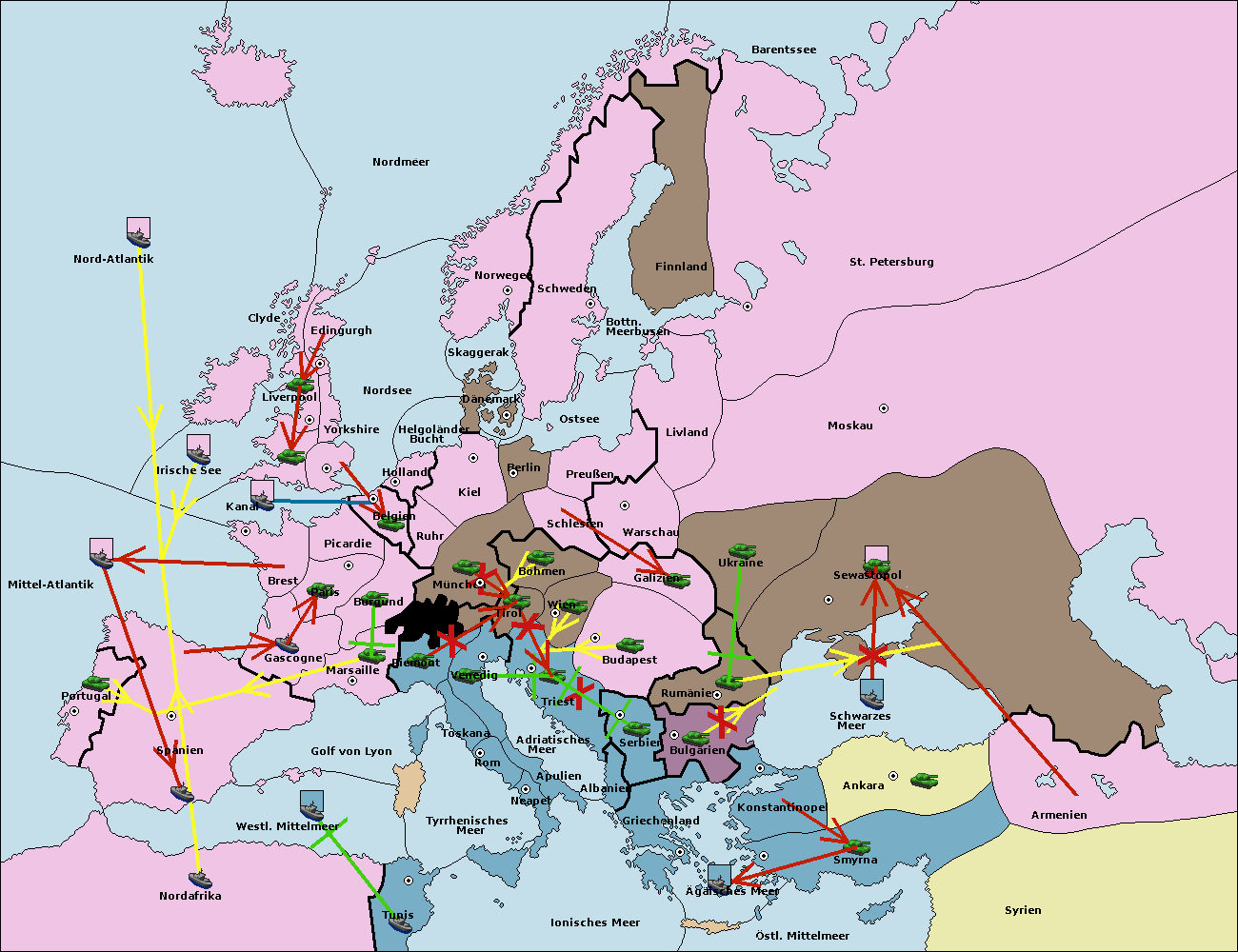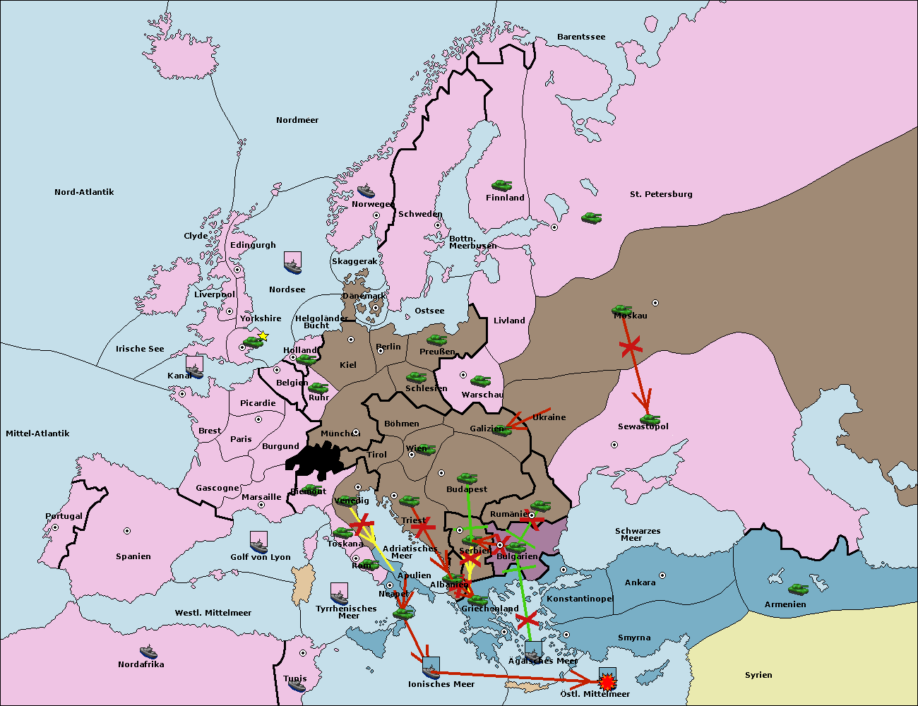 • Die Flotte in Bulgarien (Südküste) move nach Griechenland.