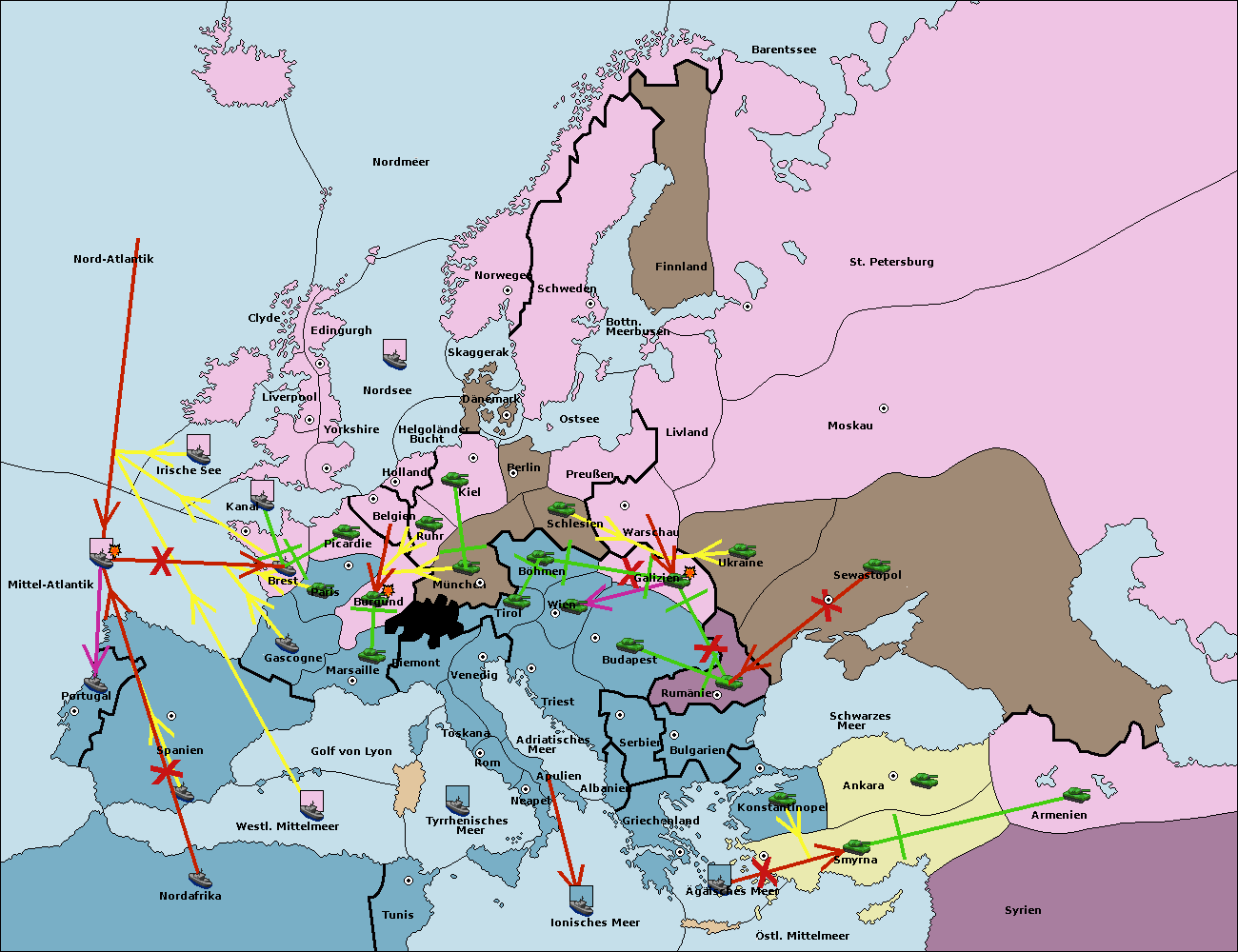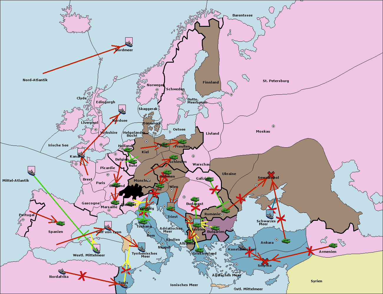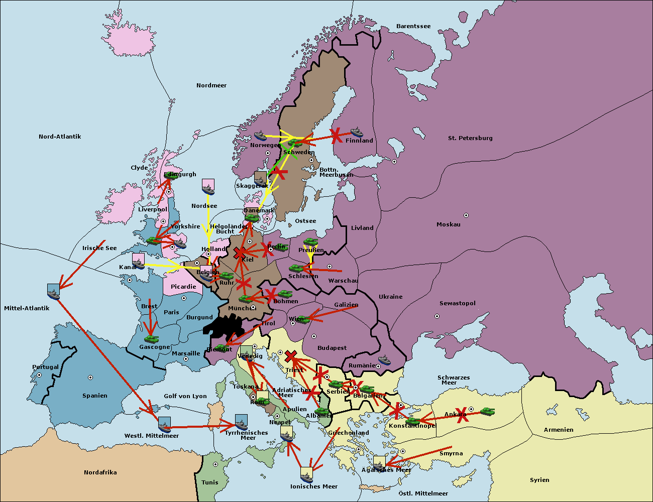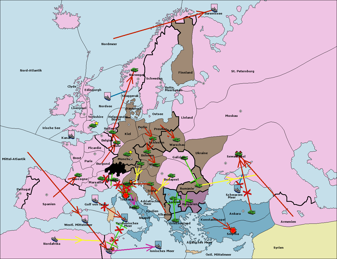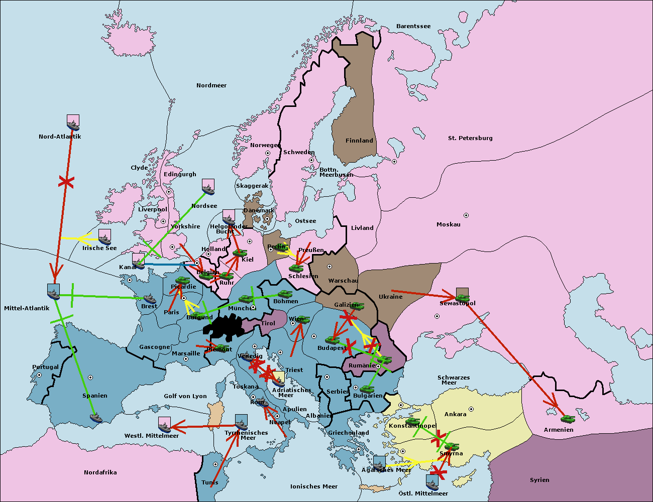 • Die Flotte in Bulgarien (Südküste) move nach Griechenland.