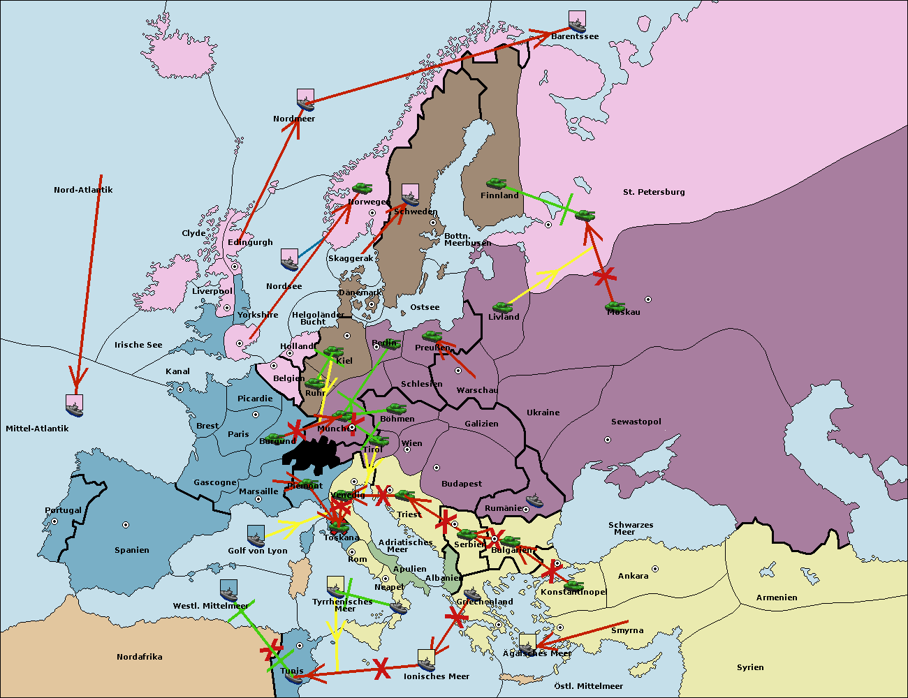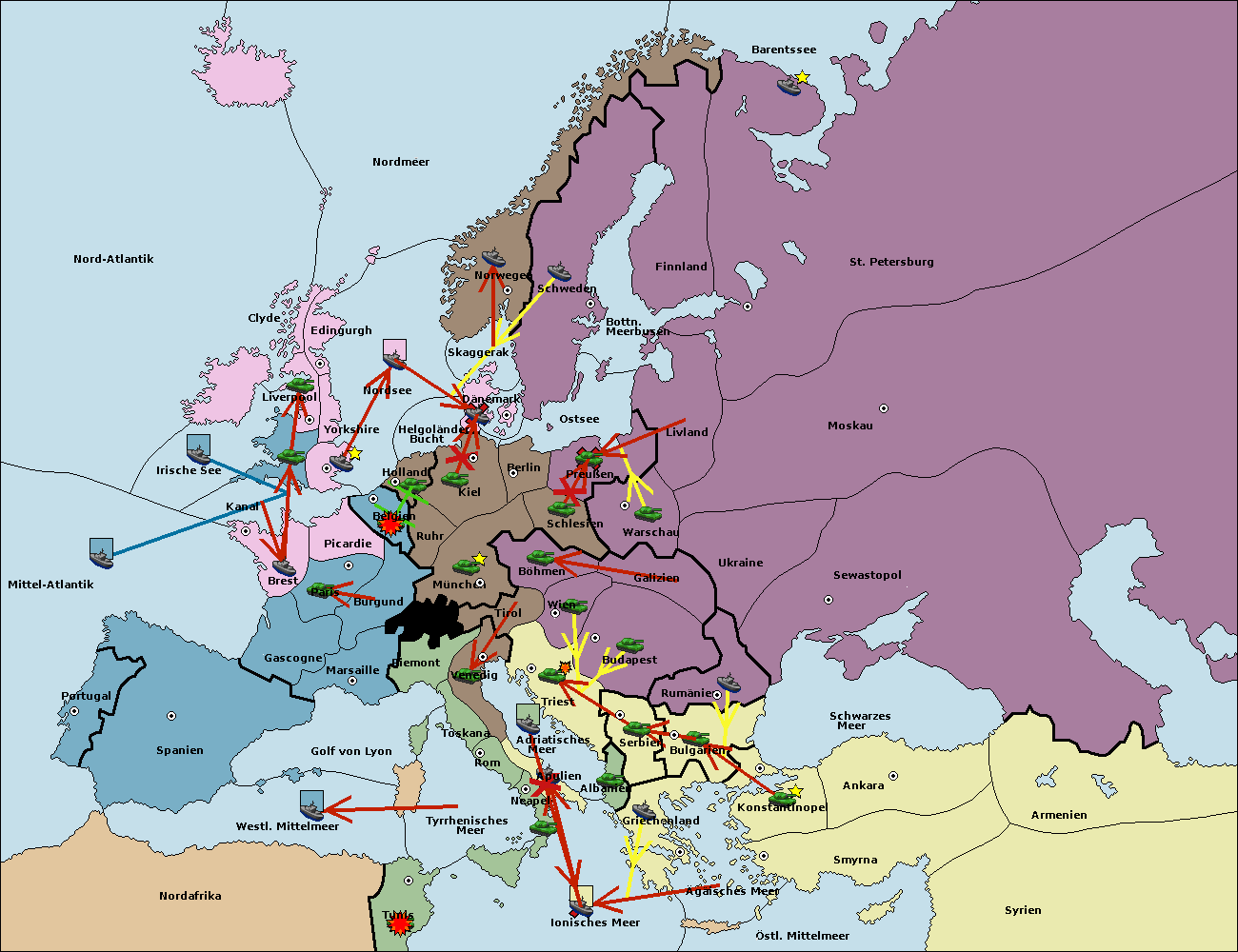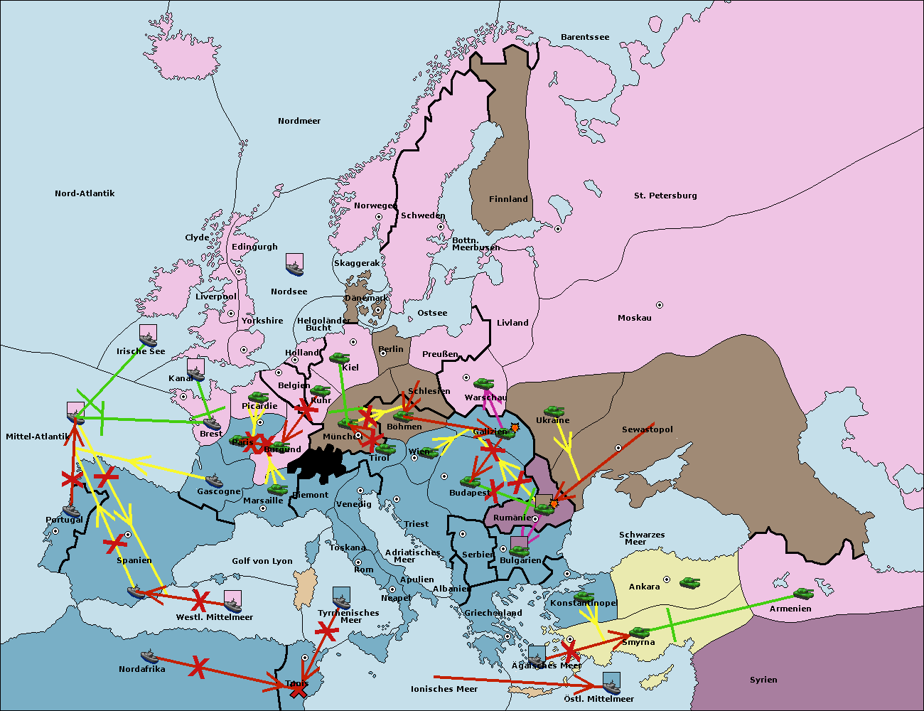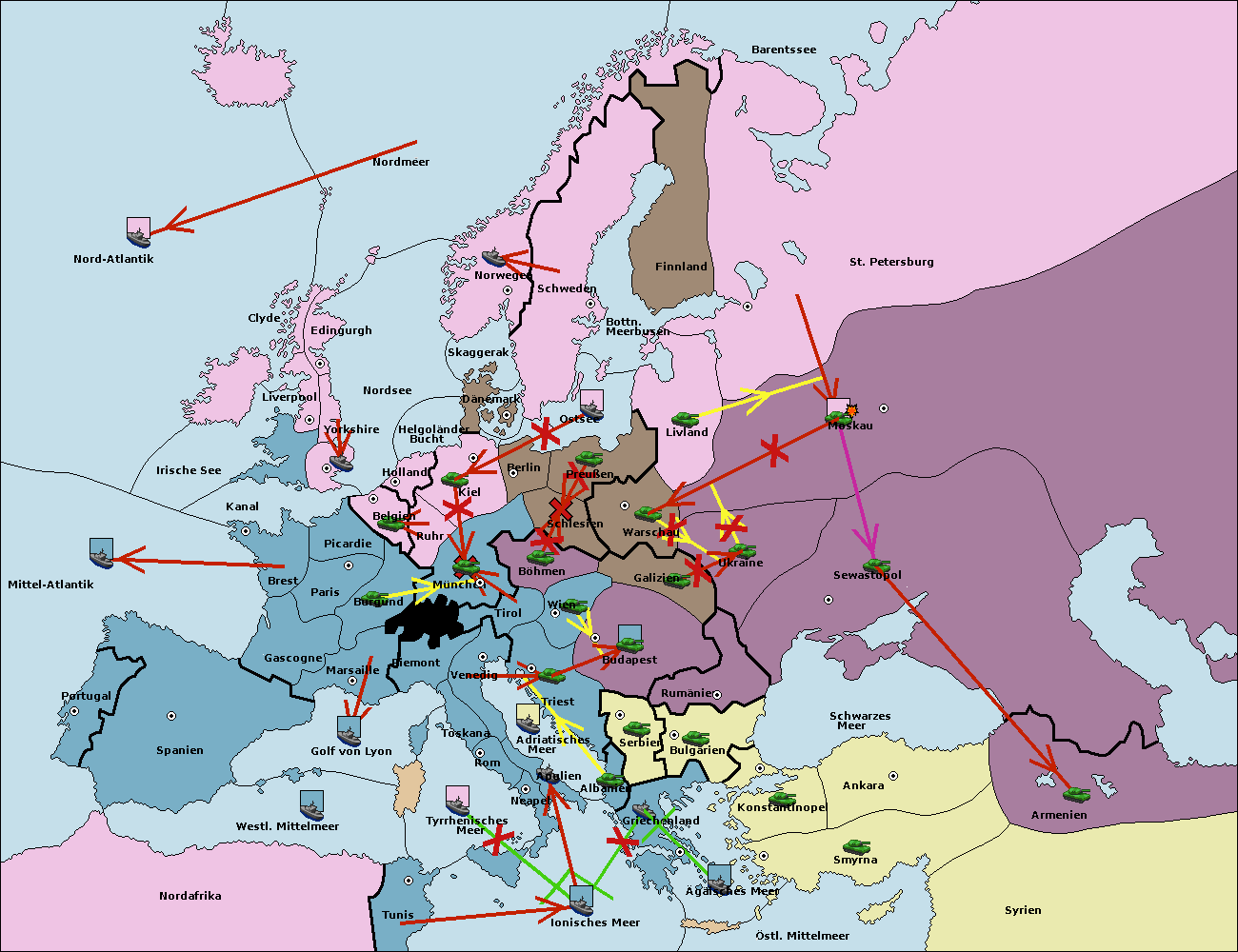 • Die Flotte in Bulgarien (Südküste) move nach Griechenland.