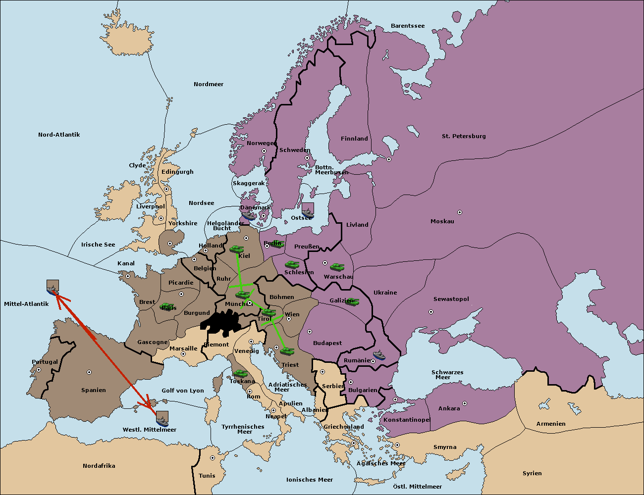 • Die Flotte in Spanien (Nordküste) move nach Portugal.