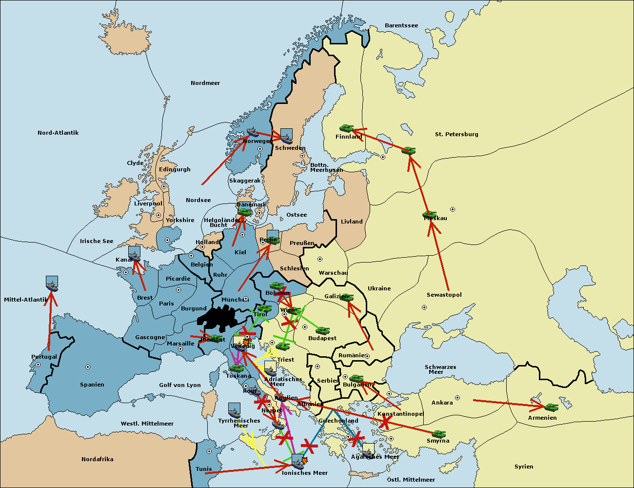 • Die Flotte in Bulgarien (Südküste) move nach Griechenland.