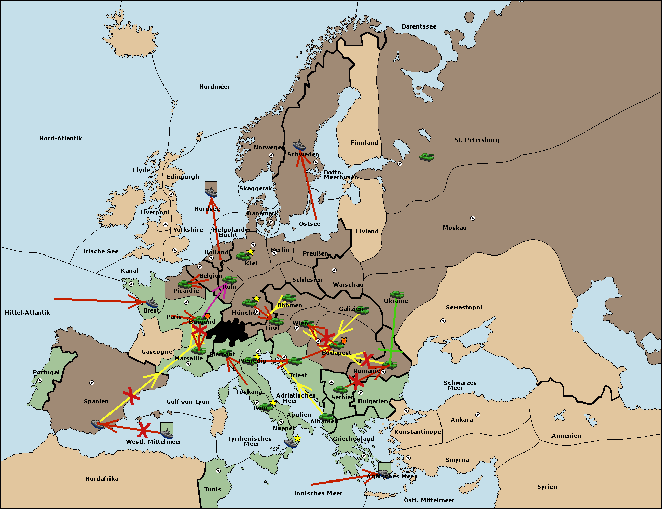 • Die Armee in Rumänien support move nach Budapest von Triest. (gescheitert)