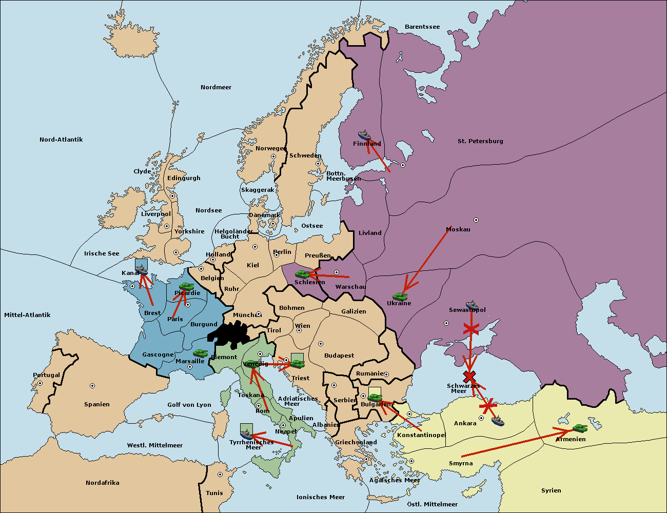 • Die Flotte in St. Petersburg (Südküste) move nach Finnland.