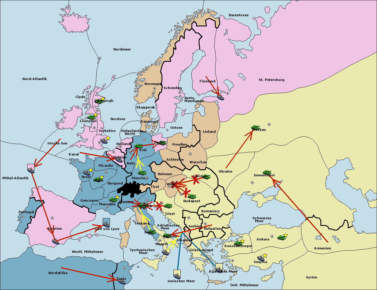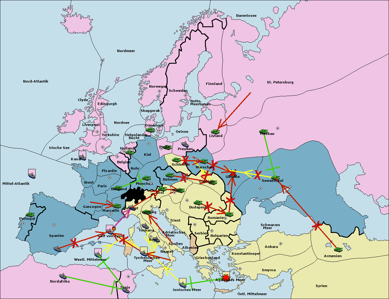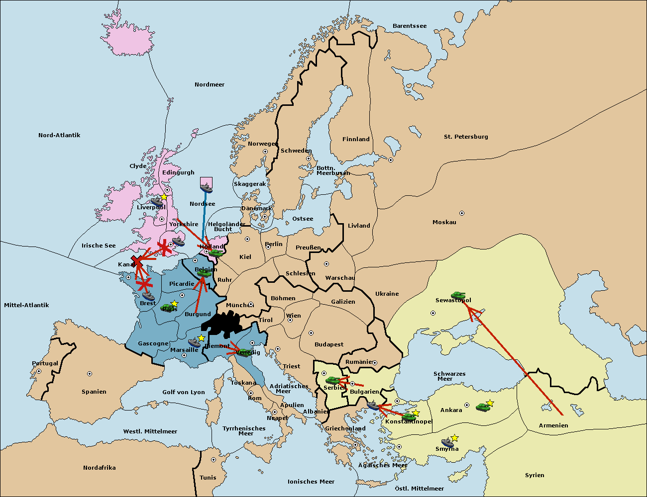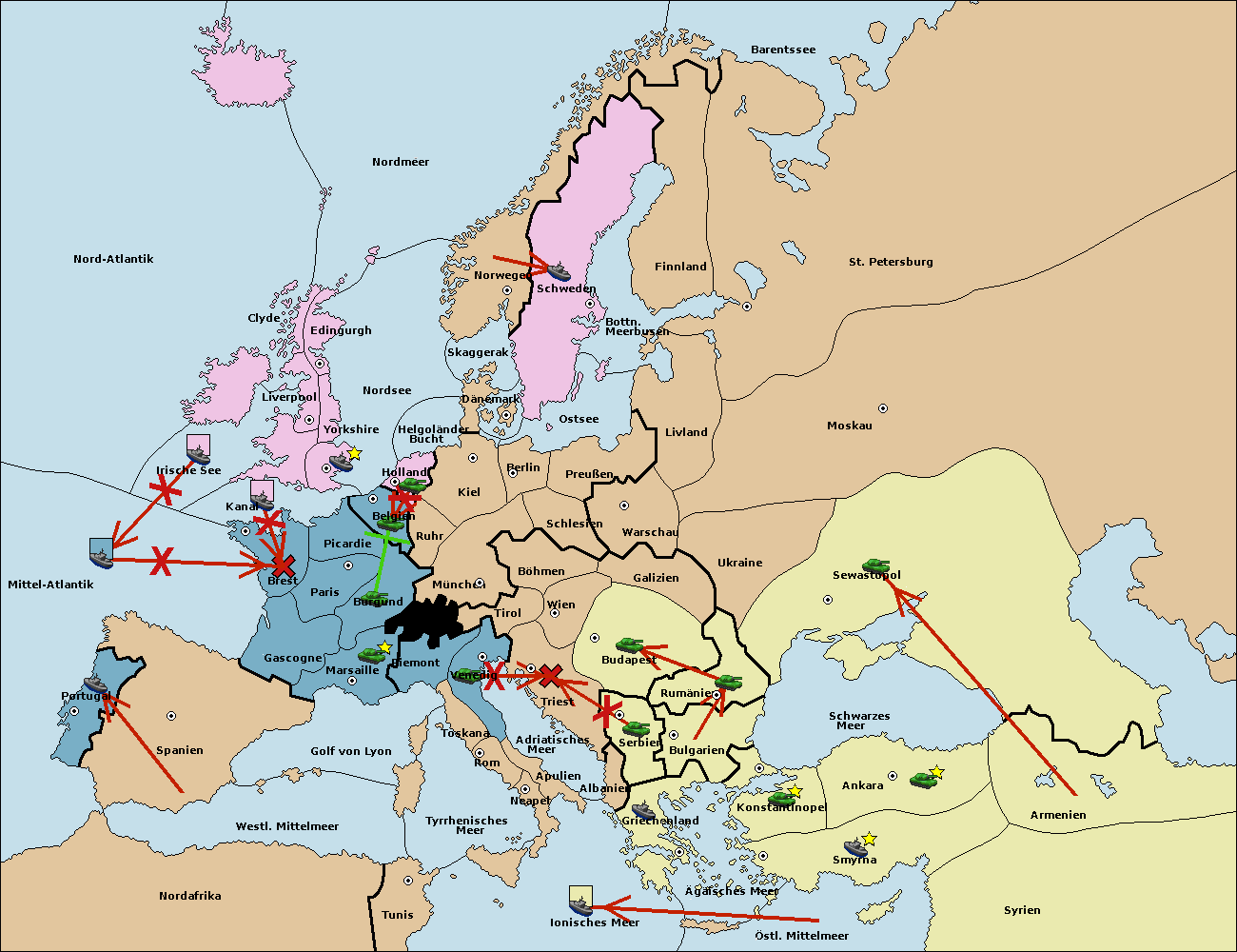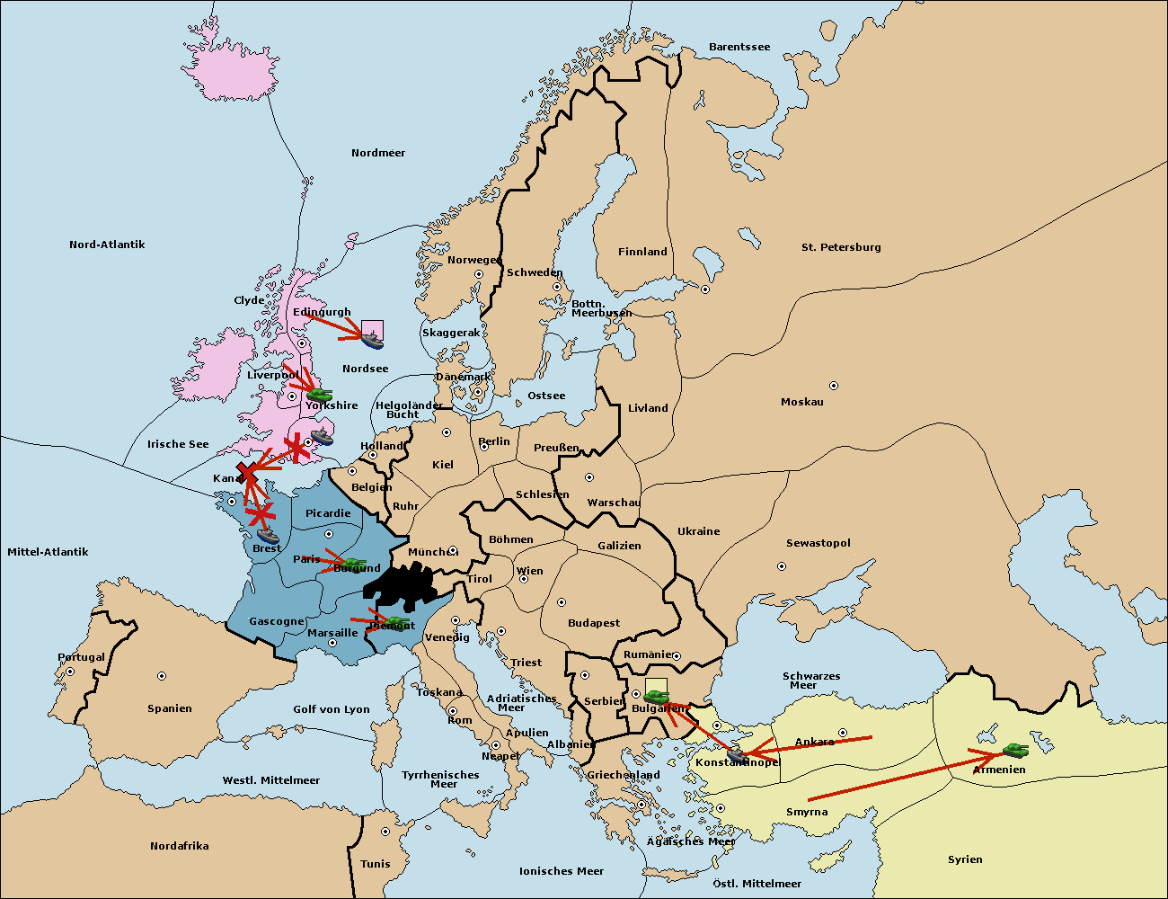 • Die Flotte in Bulgarien (Südküste) move nach Griechenland.