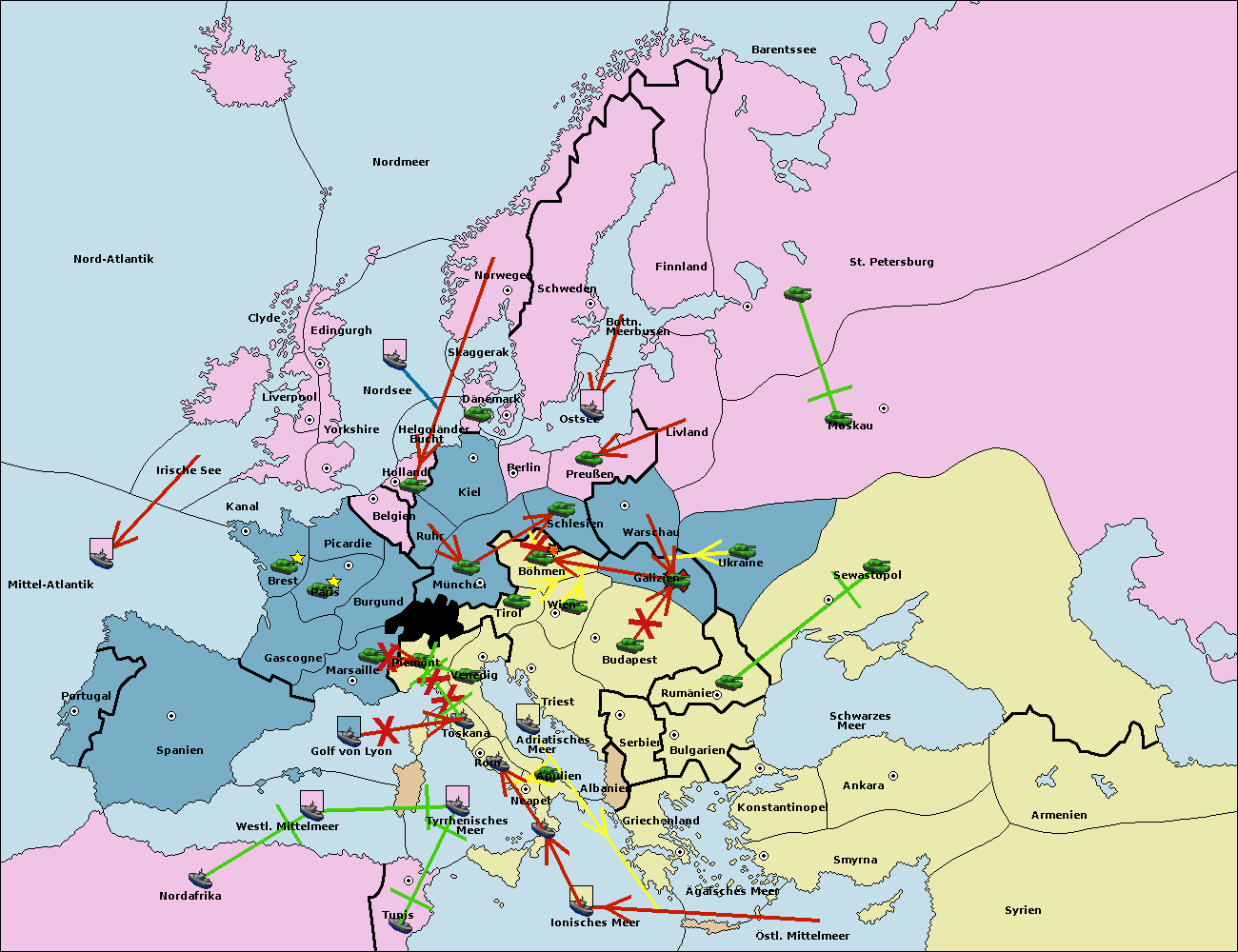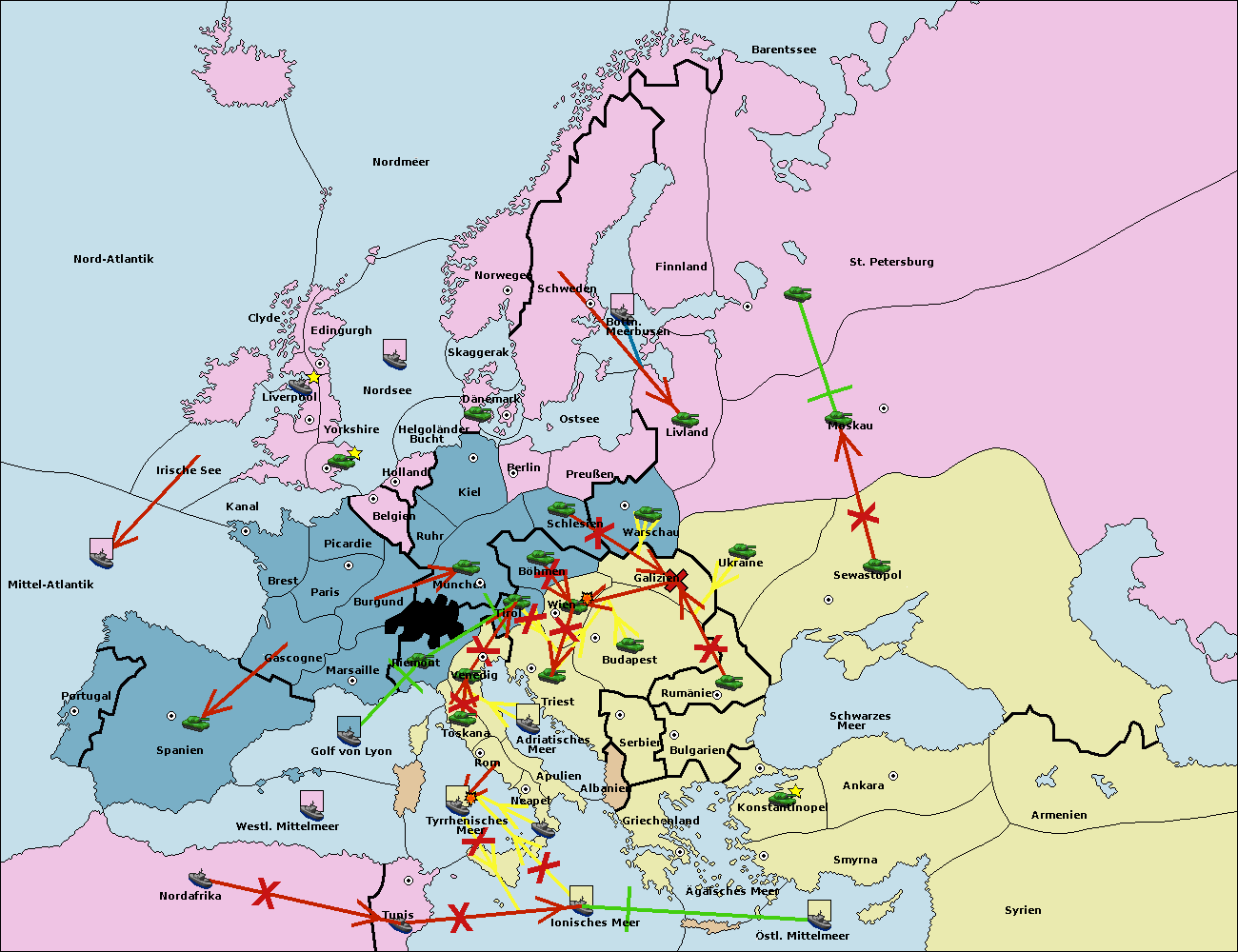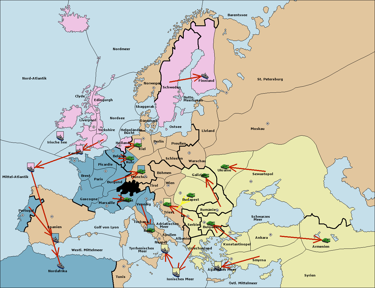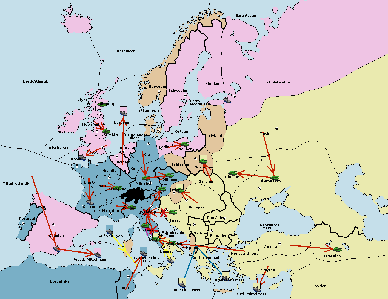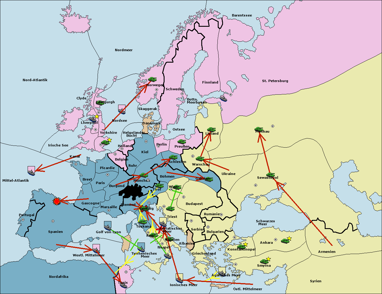• Die Flotte in Bulgarien (Südküste) move nach Griechenland.