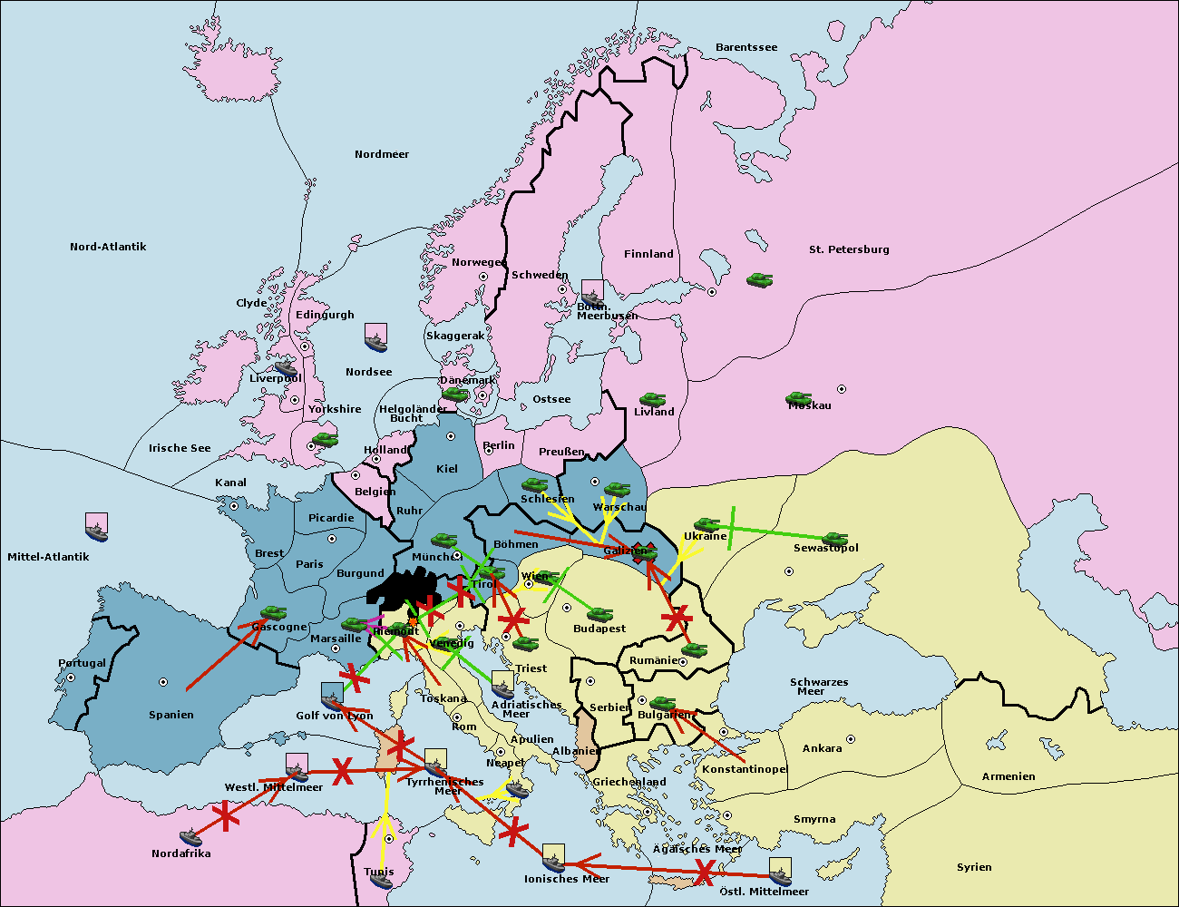 • Die Flotte in Spanien (Südküste) support move nach Golf von Lyon von westl. Mittelmeer.