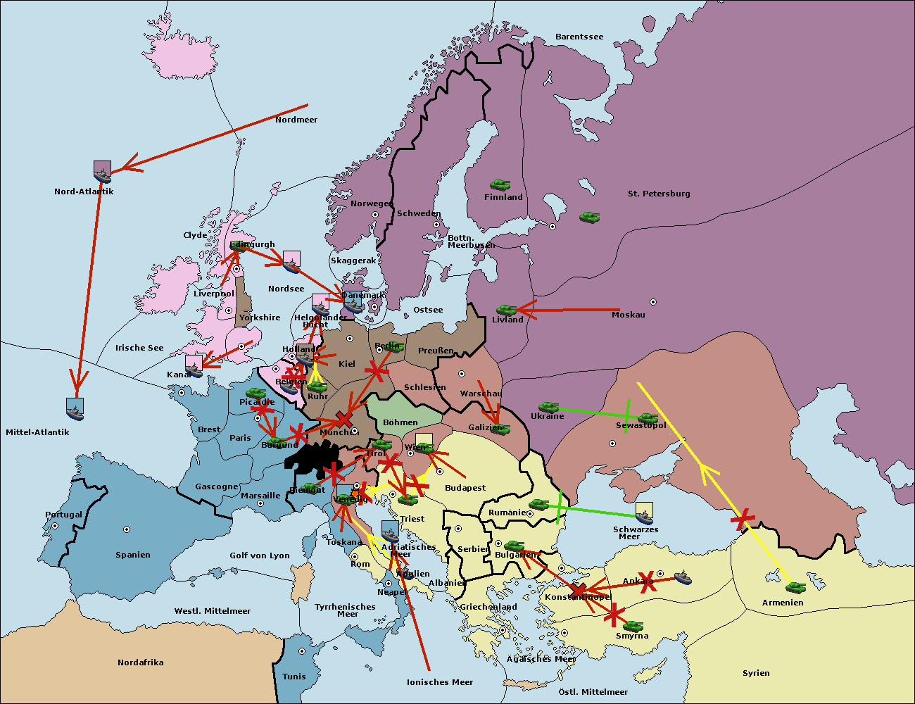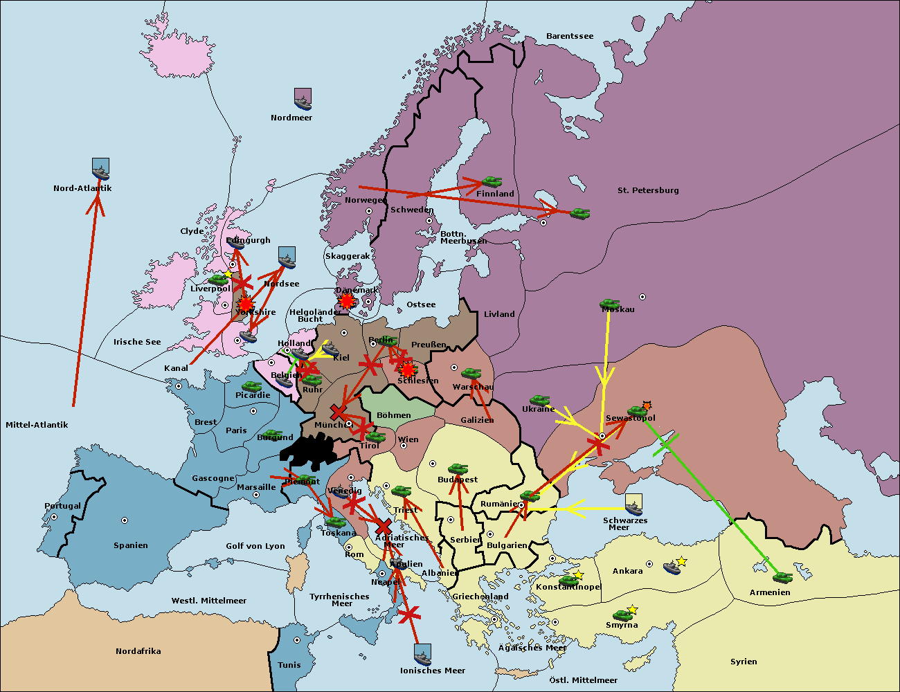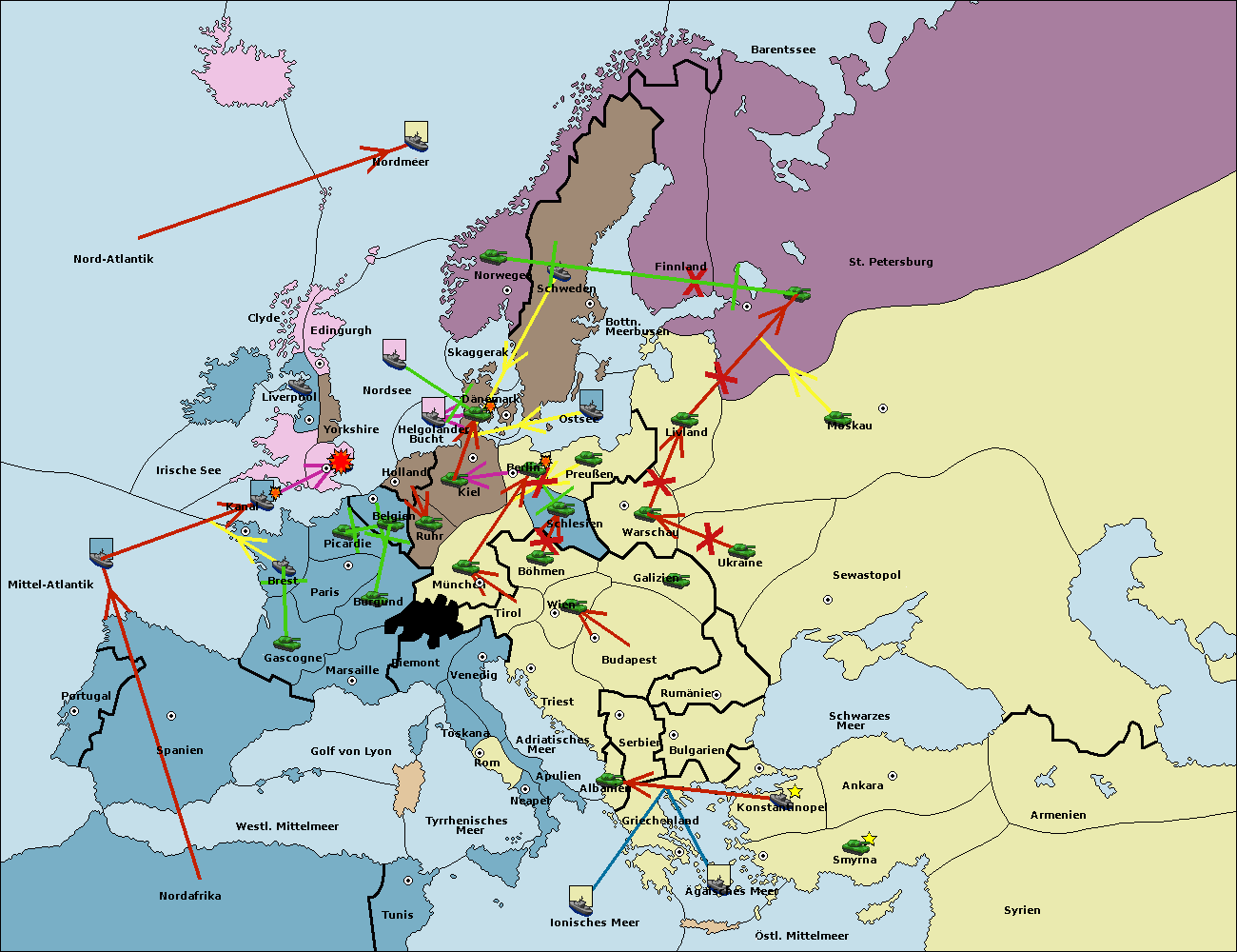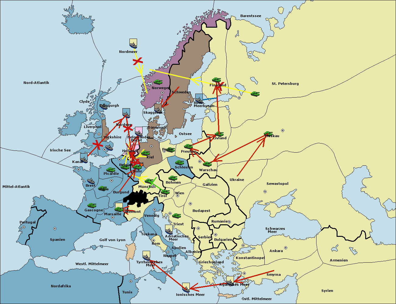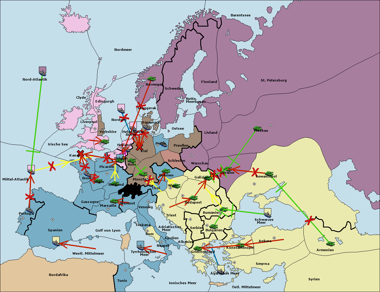 • Die Armee in Kiel wird zerstörtFlotte in Kiel gebaut.