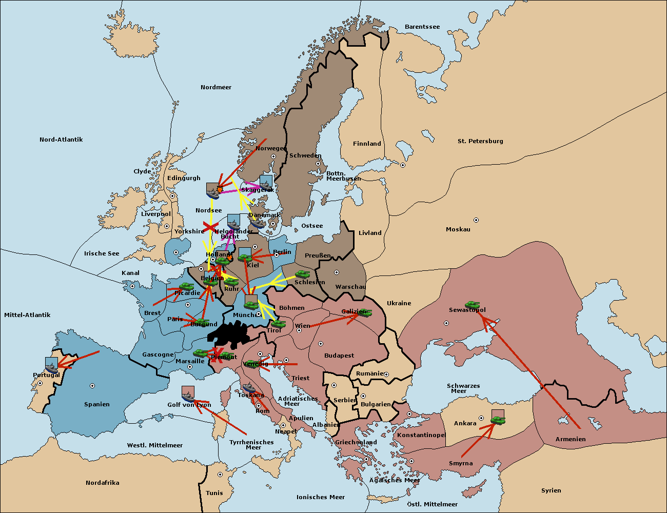 • Die Armee in Belgien wird zerstörtFlotte in Belgien gebaut.