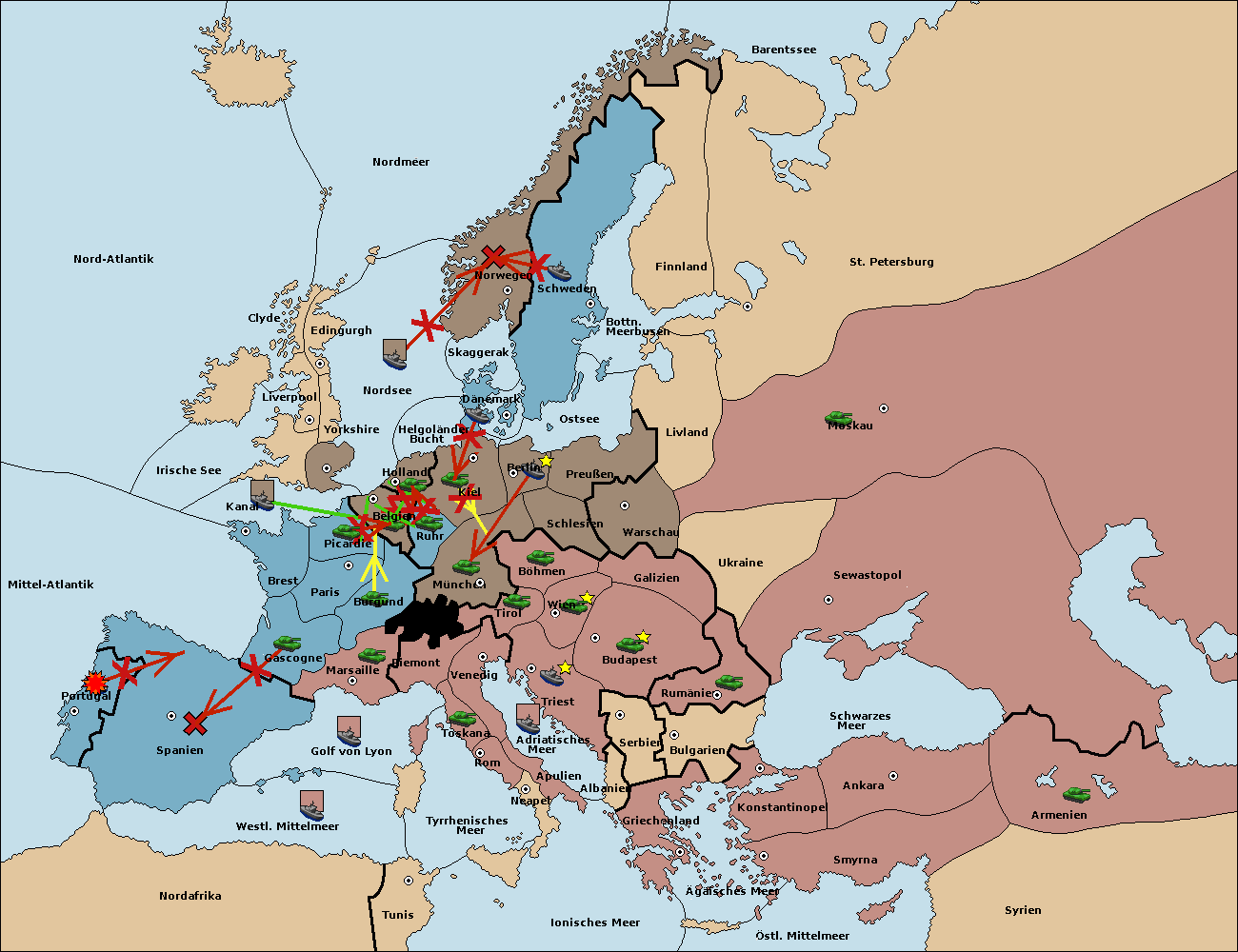 • Die Flotte in Spanien (Nordküste) move nach Portugal.