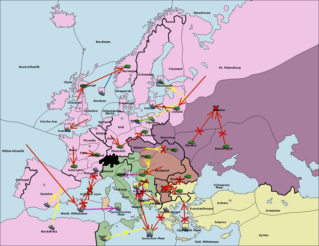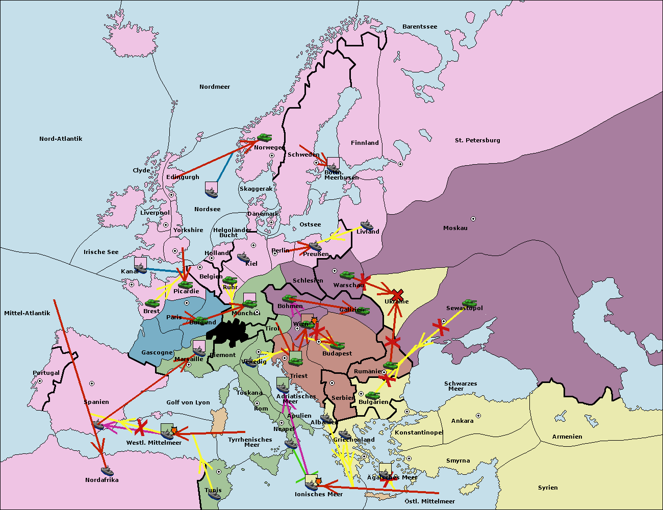 • Die Flotte in Spanien (Südküste) support move nach westl. Mittelmeer von Nord Afrika.