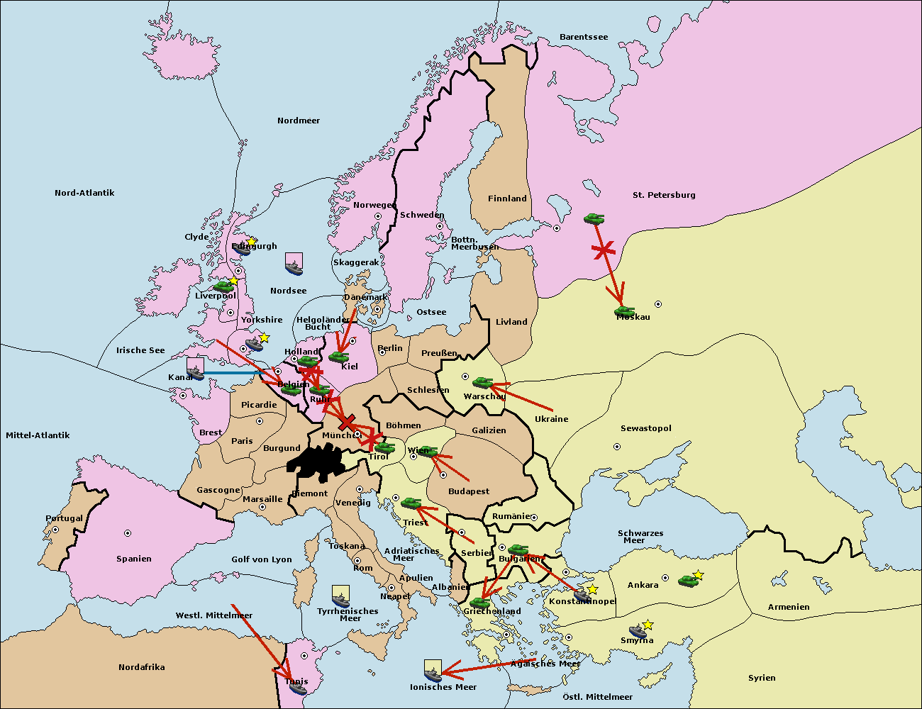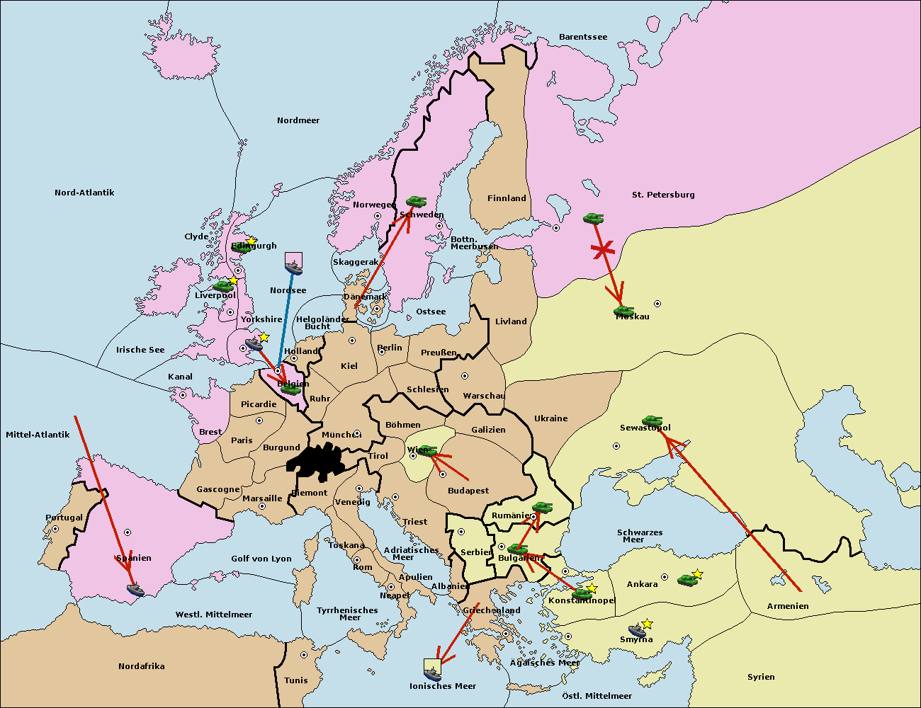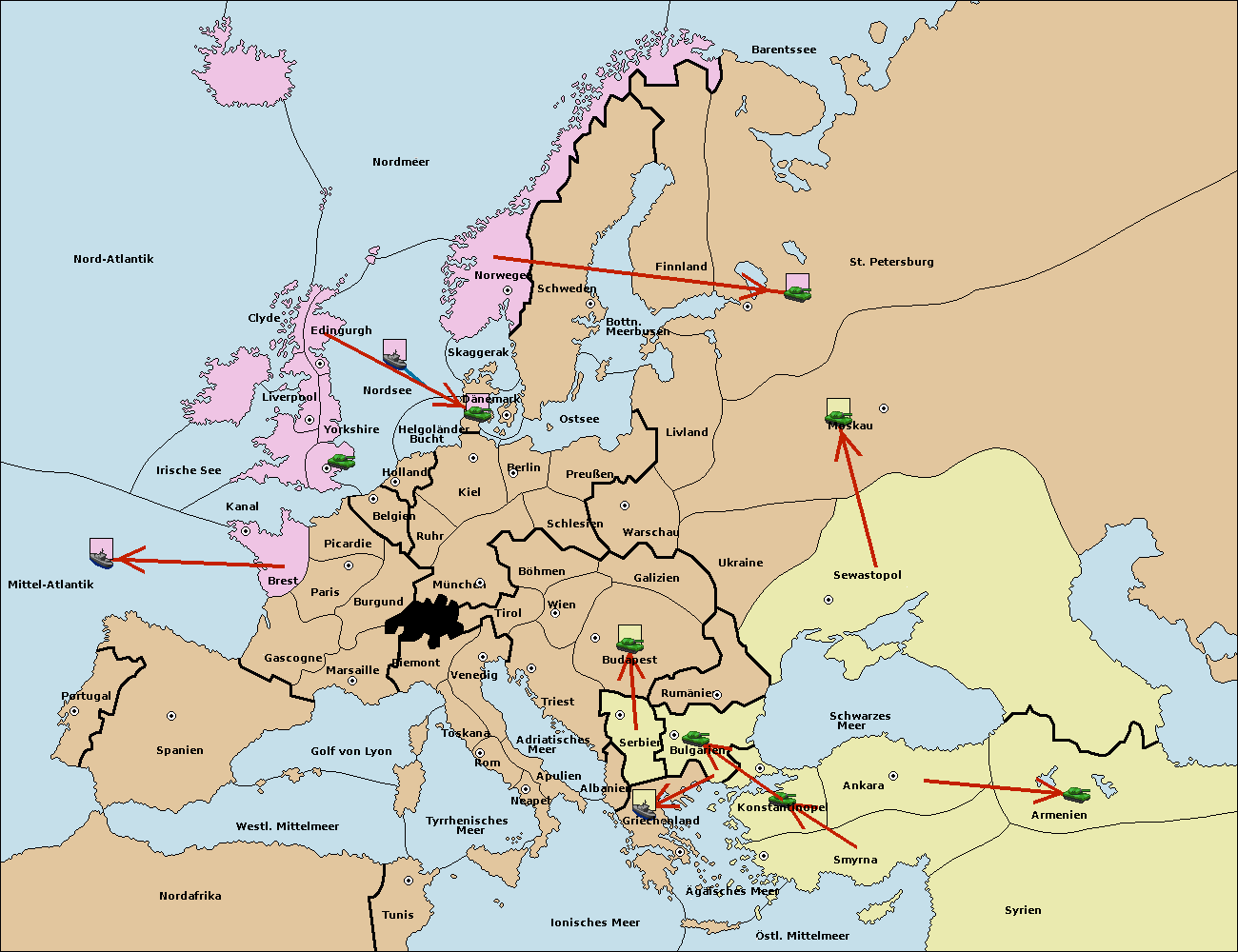 • Die Flotte in Bulgarien (Südküste) move nach Griechenland.
